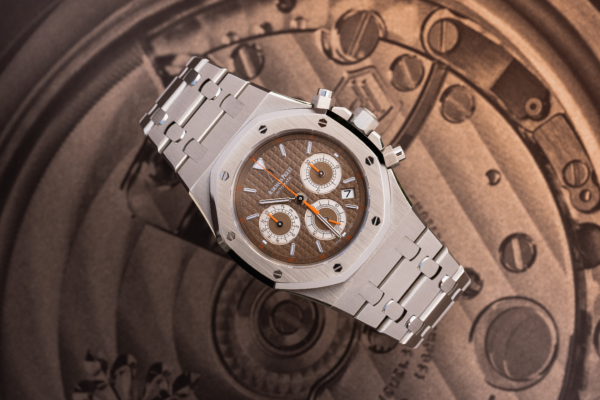 - Recently serviced at AP, this 26300ST is in exceptional condition. The bevels are perfect and the case retains all its original dimensions. The chocolate dial with orange accents is a rare combination from the brand although it is beautiful! Accompanied by its manual, original box and AP service papers.