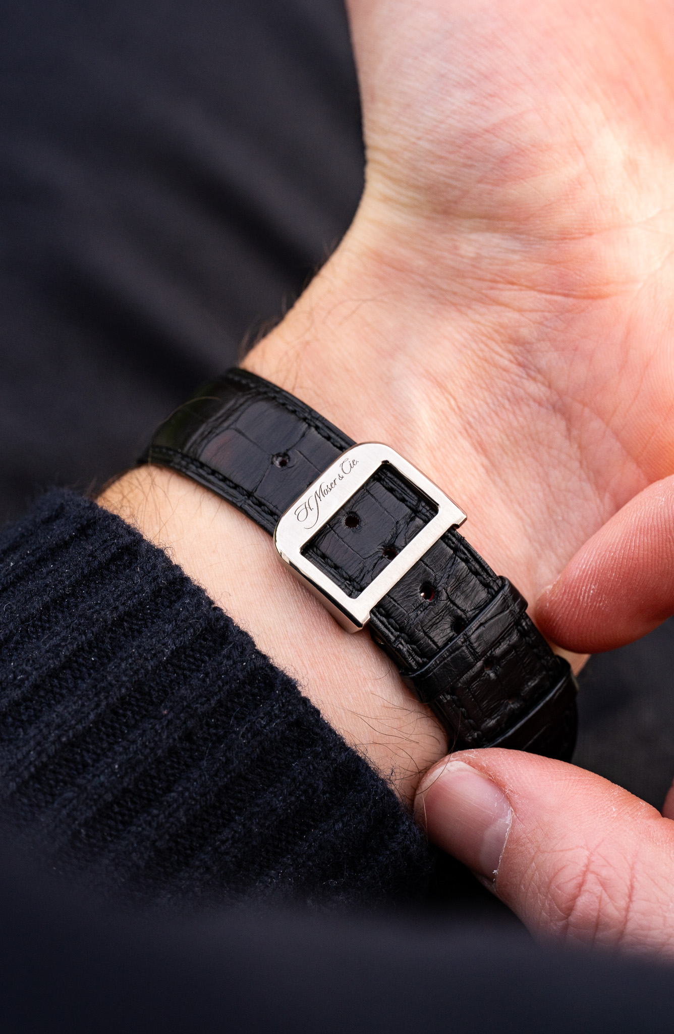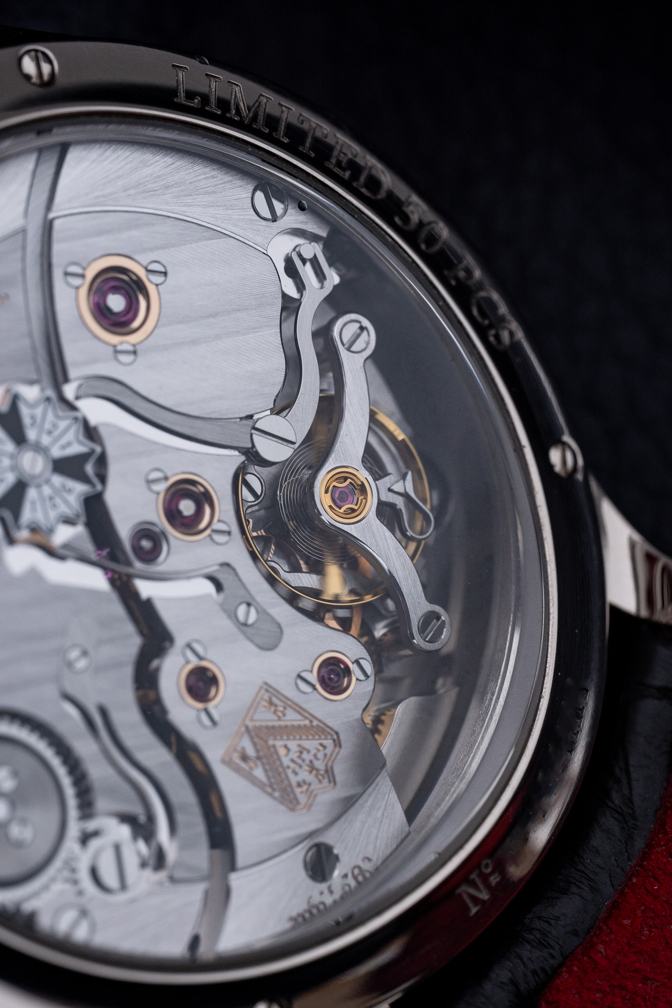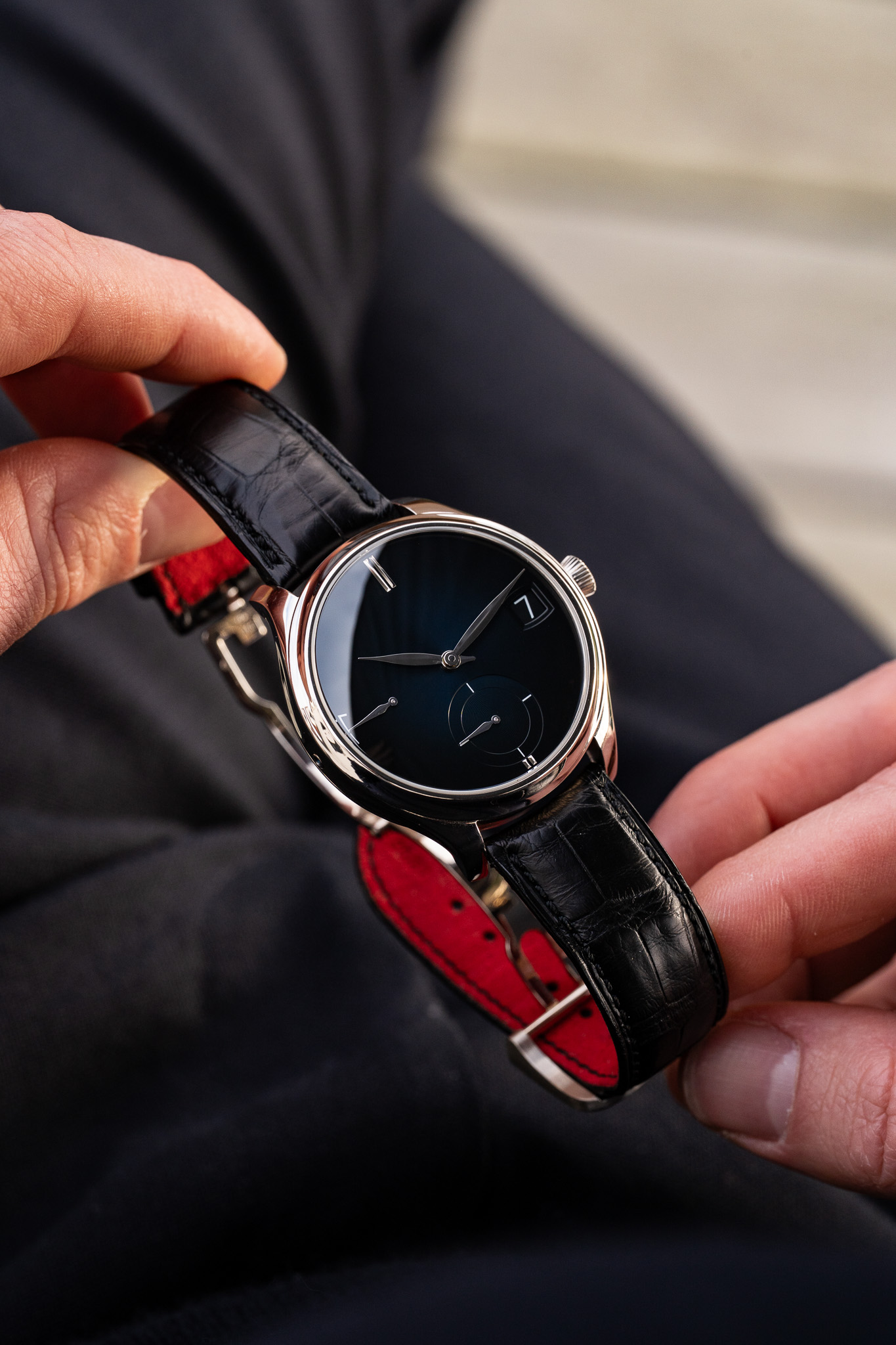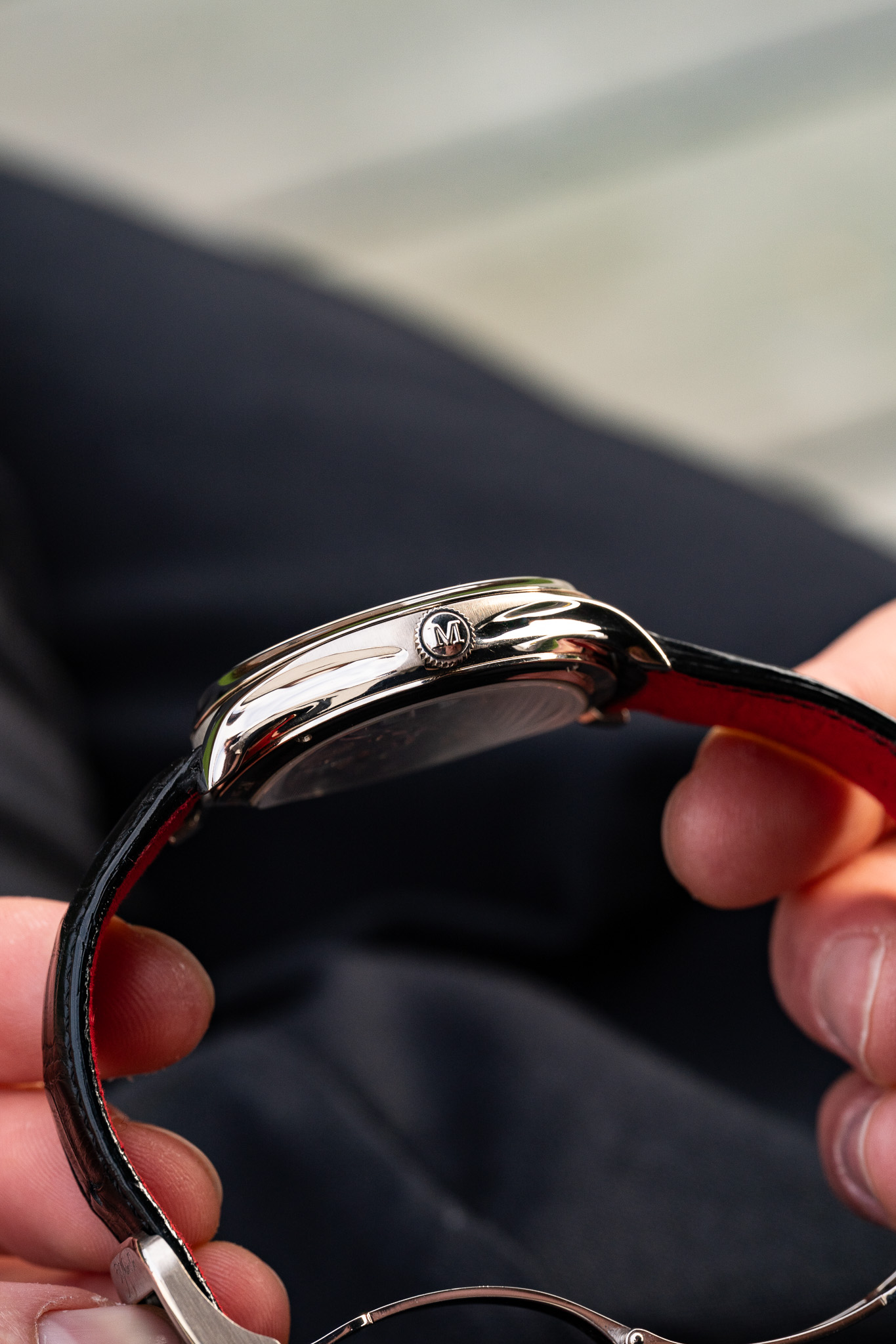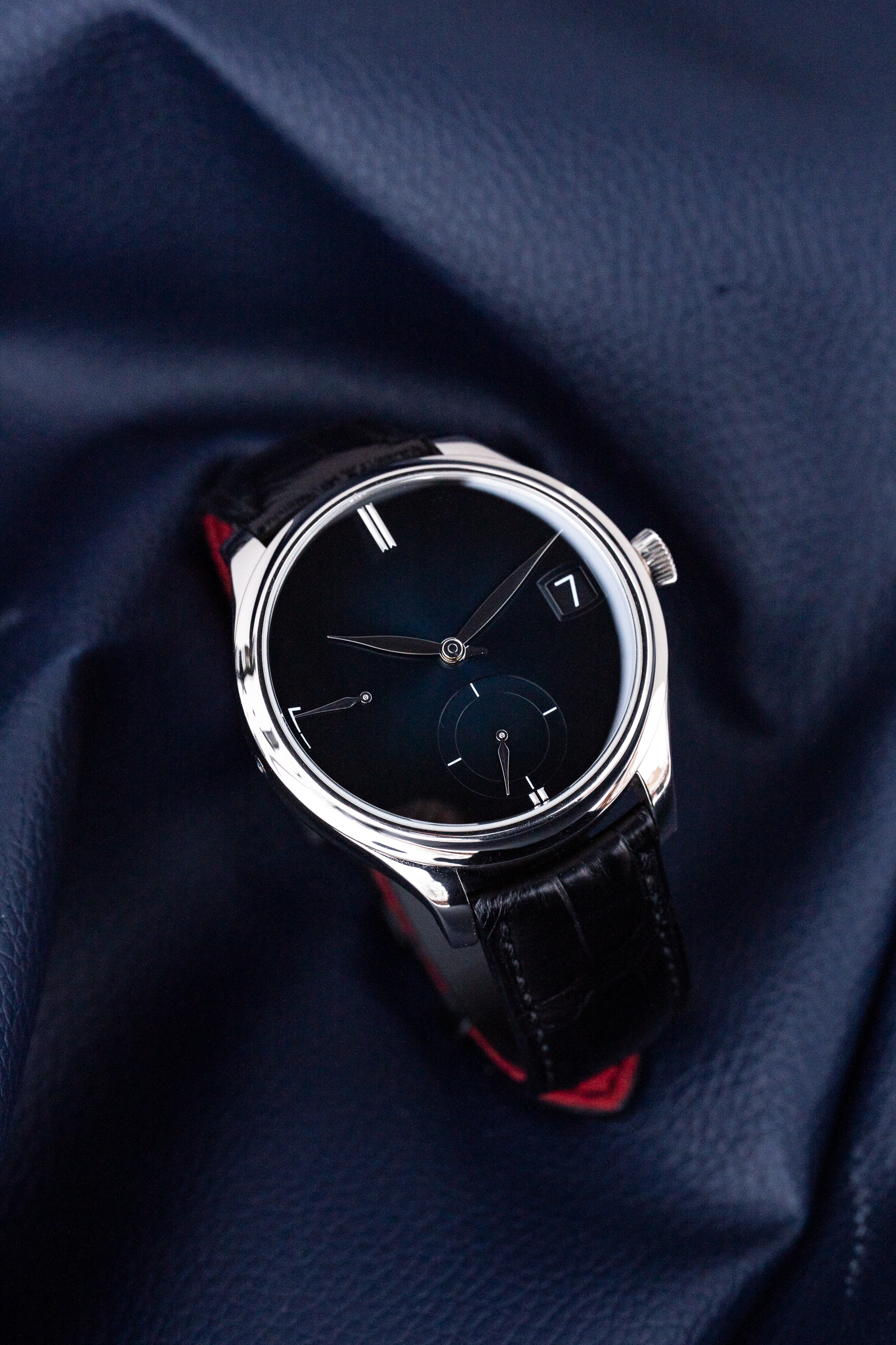 La montre est montée sur un bracelet en alligator noir avec intérieur en daim rouge, apportant un contraste subtil et raffiné. Elle est livrée avec deux options de boucles, une boucle déployante en or blanc ainsi qu’une boucle ardillon également en or blanc, permettant d’adapter le port selon les préférences.