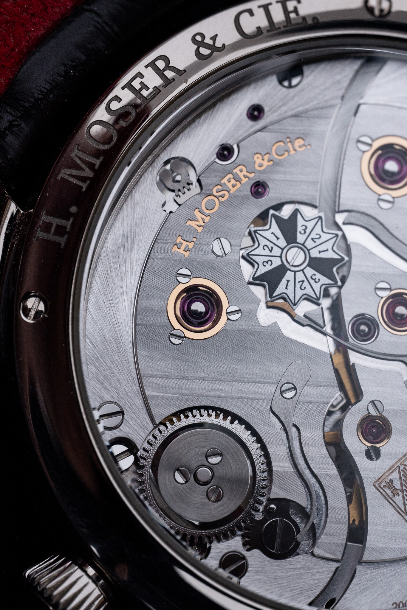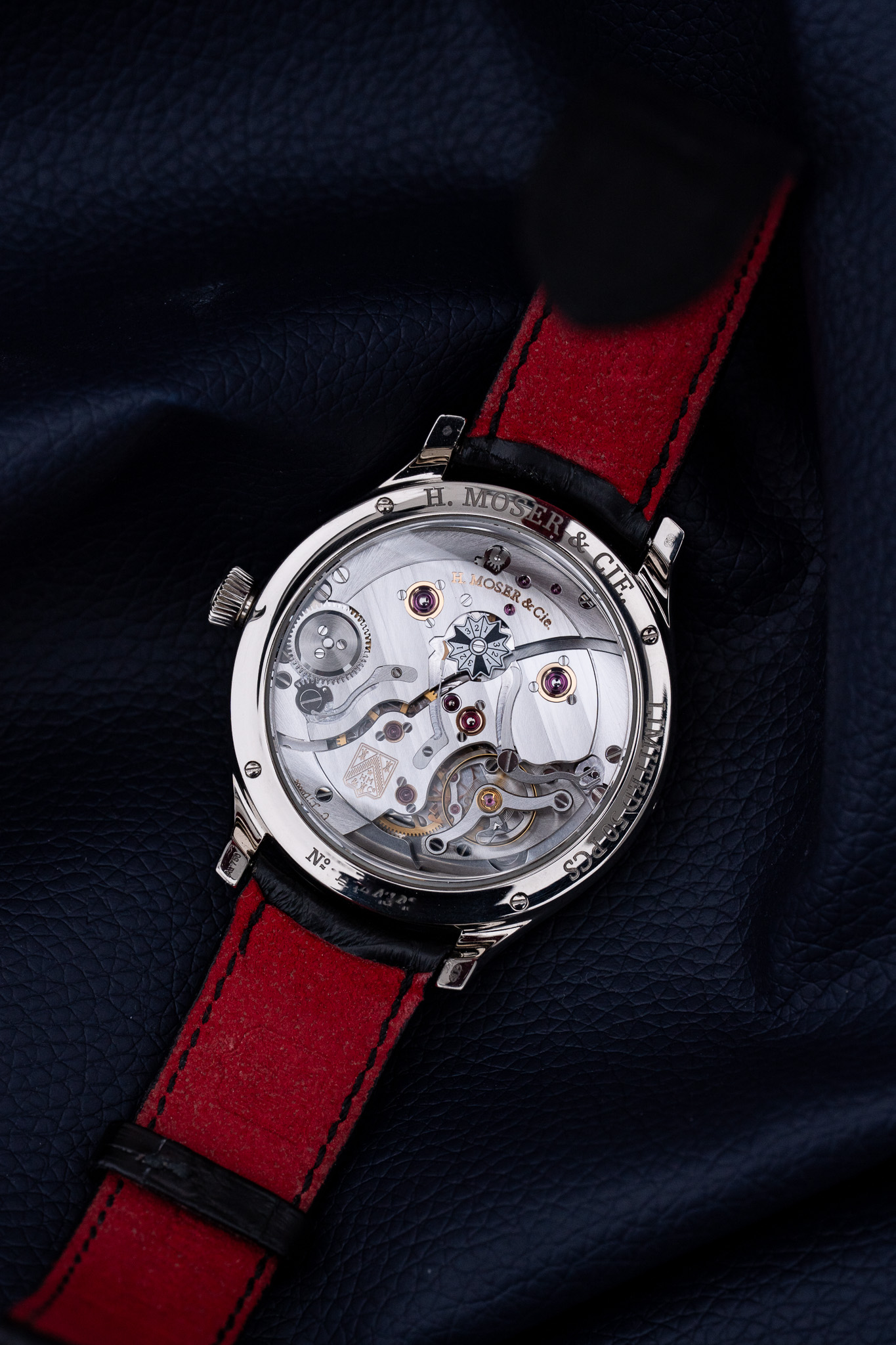 Au cœur de la montre bat le calibre manufacture HMC 800 à remontage manuel. Ce mouvement incarne l’une des approches les plus intelligentes du quantième perpétuel contemporain. Son architecture permet des corrections complètes du calendrier aussi bien en avant qu’en arrière, sans zone interdite et sans risque mécanique. Doté d’une réserve de marche de sept jours, d’un spiral Straumann antimagnétique et de finitions artisanales soignées, il illustre parfaitement la maîtrise technique et la philosophie pragmatique de H. Moser & Cie. L’indication de l’année bissextile est visible côté fond, directement sur le mouvement, préservant ainsi la pureté absolue du cadran. Le calibre se dévoile à travers un fond saphir, révélant chatons en or, anglages polis et une architecture d’une grande sobriété.