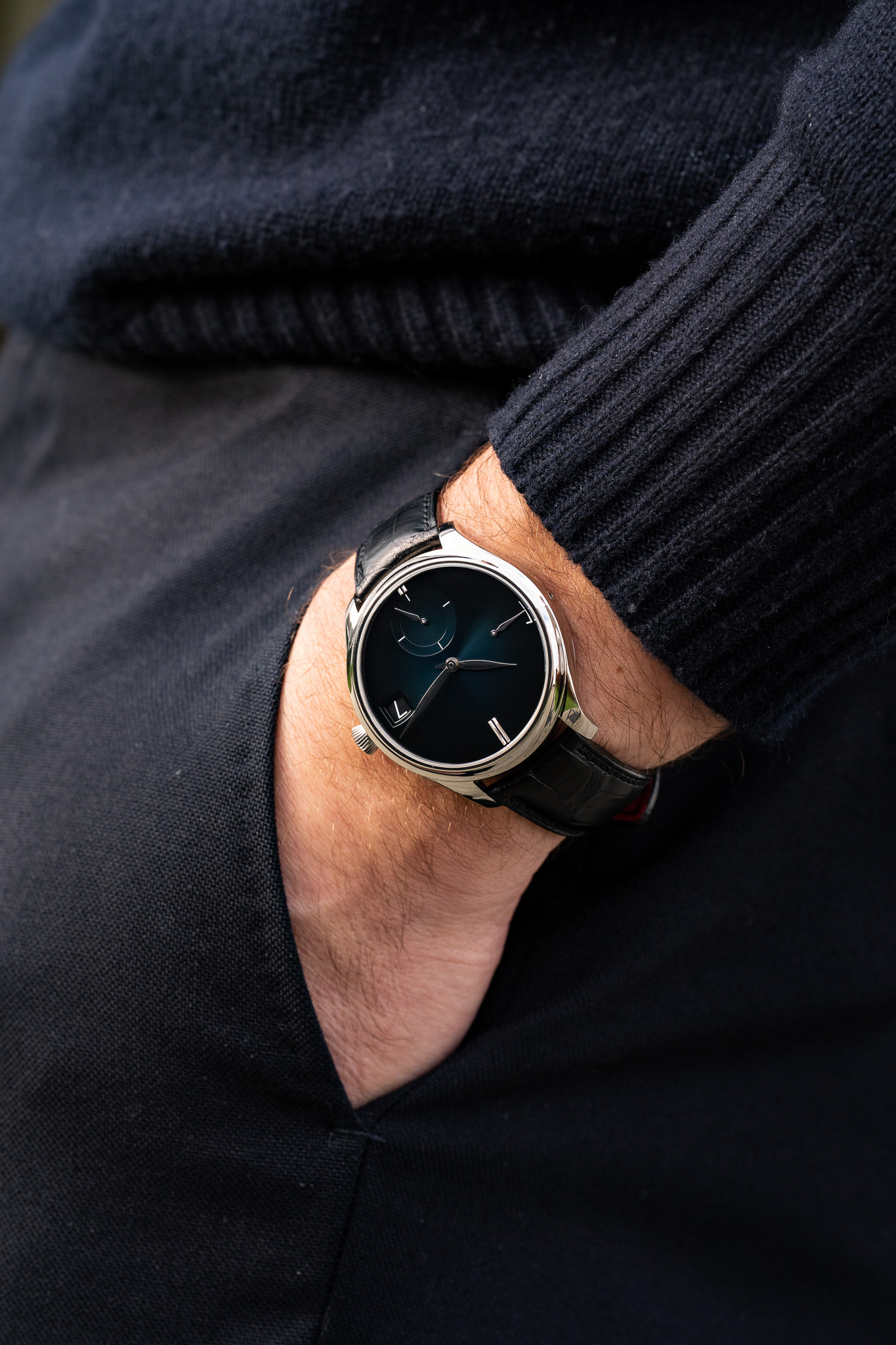 Le cadran Midnight Blue Fumé constitue le véritable point d’ancrage émotionnel de la pièce. Profond et nuancé, il évolue du bleu nuit intense à des reflets plus clairs selon la lumière. Fidèle à l’esthétique Purity, il est volontairement dépourvu de logo visible, renforçant le minimalisme absolu de l’ensemble. Les index appliqués et les aiguilles feuilles en or blanc se détachent avec justesse. La date à 3 heures saute instantanément à minuit, tandis que le mois est indiqué par une aiguille centrale lisible via les index, le tout intégré avec une discrétion exemplaire, sans rompre l’harmonie du cadran.