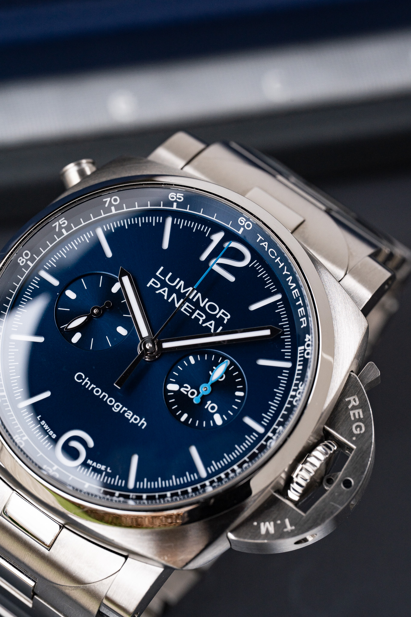Le cadran bleu apporte une dimension plus contemporaine et raffinée à l’ensemble. Il reprend les codes de lisibilité propres à Panerai avec ses larges index et chiffres arabes luminescents, garantissant une lecture immédiate dans toutes les conditions. La profondeur de sa teinte varie selon la lumière, offrant un jeu de nuances particulièrement séduisant.