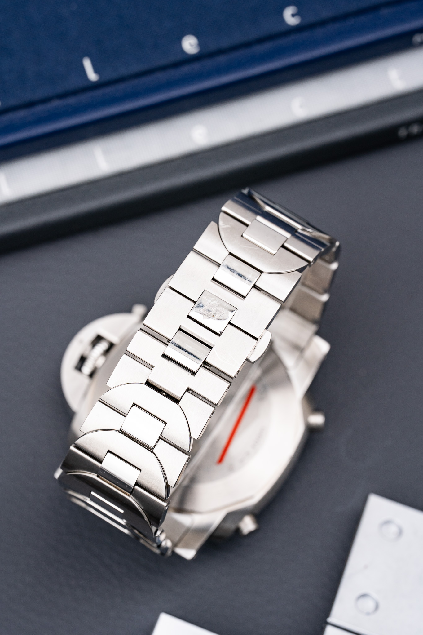 Cet exemplaire est proposé en set complet, avec boîte, surboîte, papiers et accessoires d’origine. Elle est montée sur son bracelet acier, renforçant son aspect polyvalent et contemporain, et est accompagné de deux bracelets supplémentaires : un bracelet en caoutchouc noir pour une approche plus sportive, ainsi qu’un bracelet textile bleu avec boucle ardillon Panerai, permettant d’adapter facilement la montre à différents contextes de port.