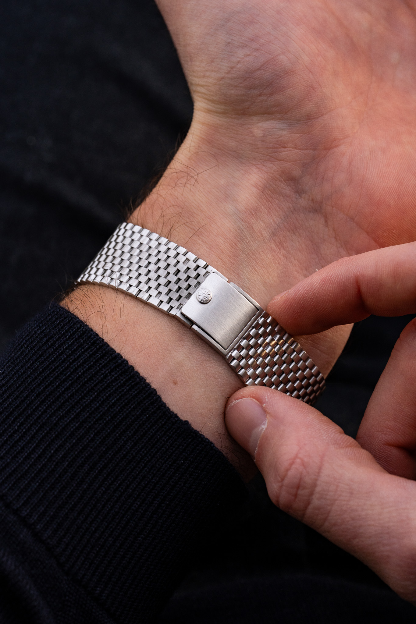 L’exemplaire proposé date de 1981 et est accompagné de sa boîte et de ses papiers d’origine, un ensemble particulièrement recherché pour ce type de pièce. La montre se présente dans un excellent état de conservation, tant au niveau du boîtier que du bracelet et du cadran, témoignant d’un soin attentif au fil des décennies.