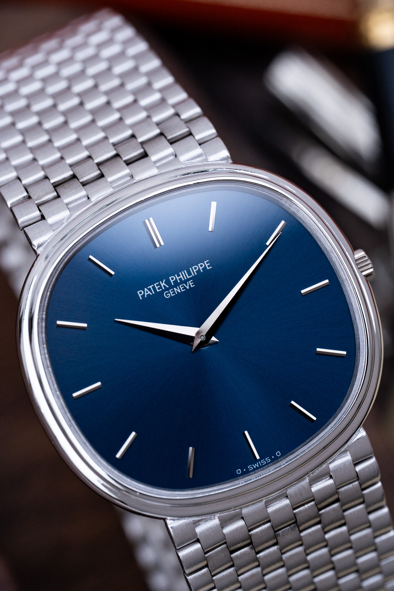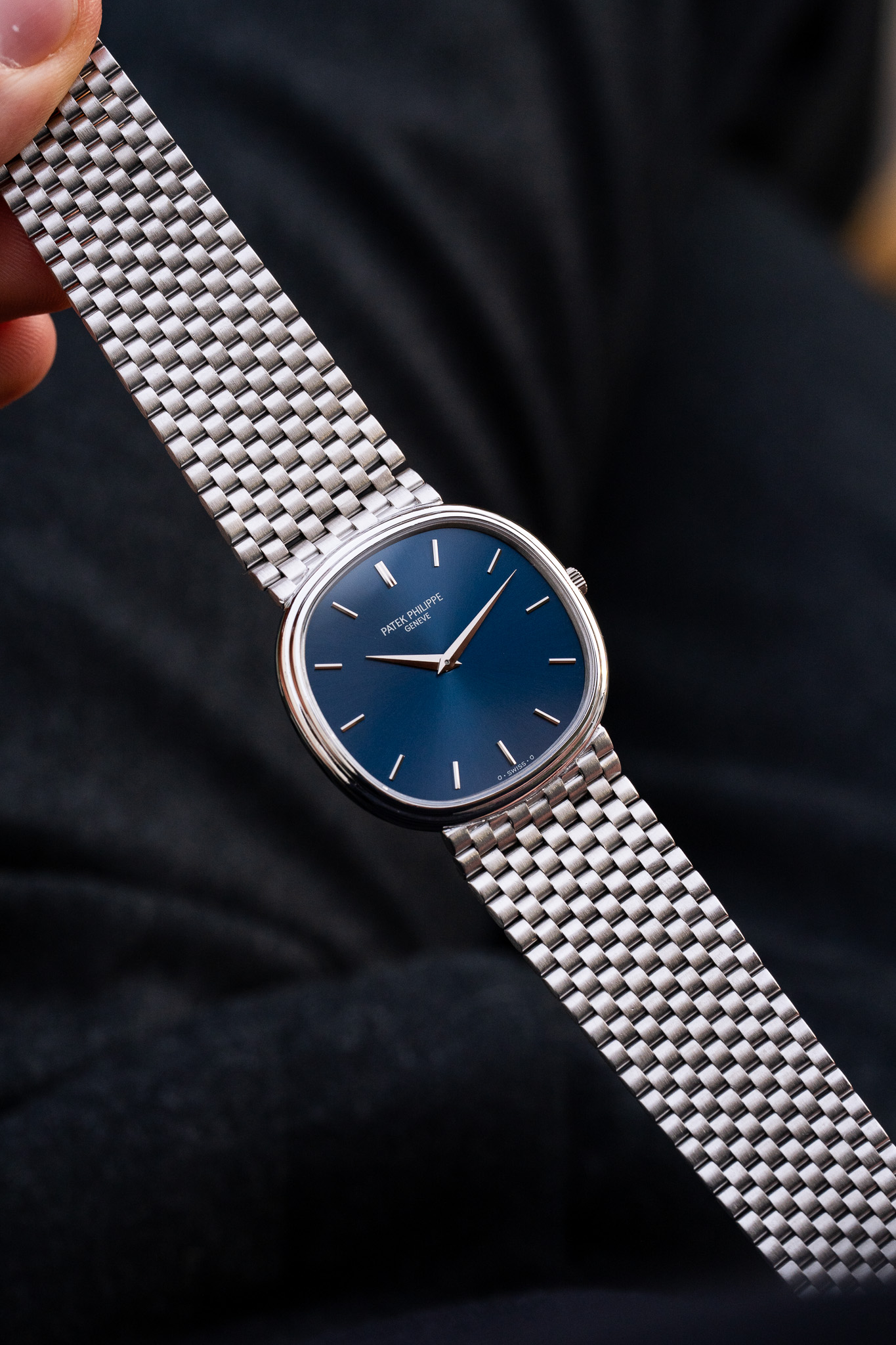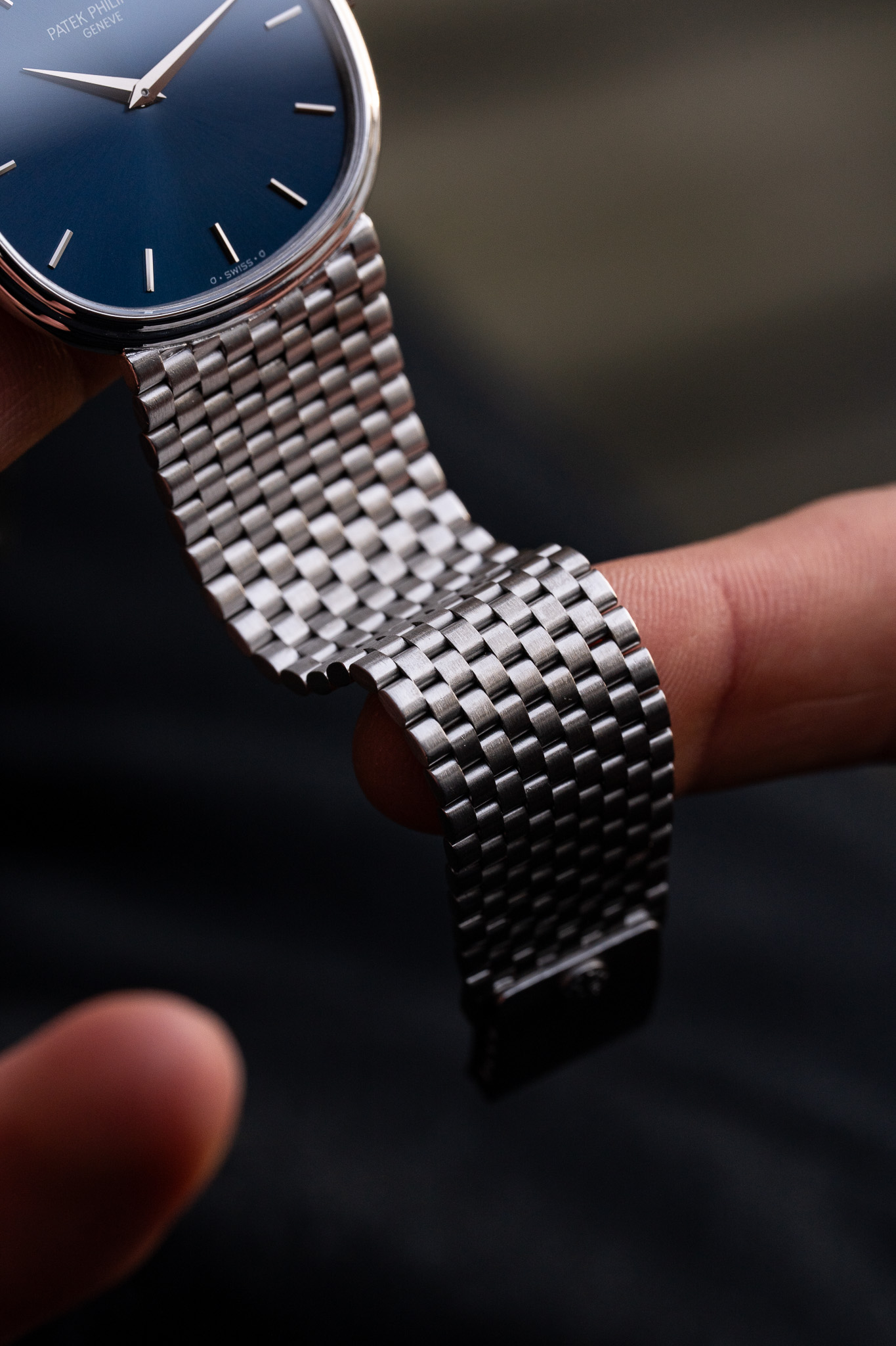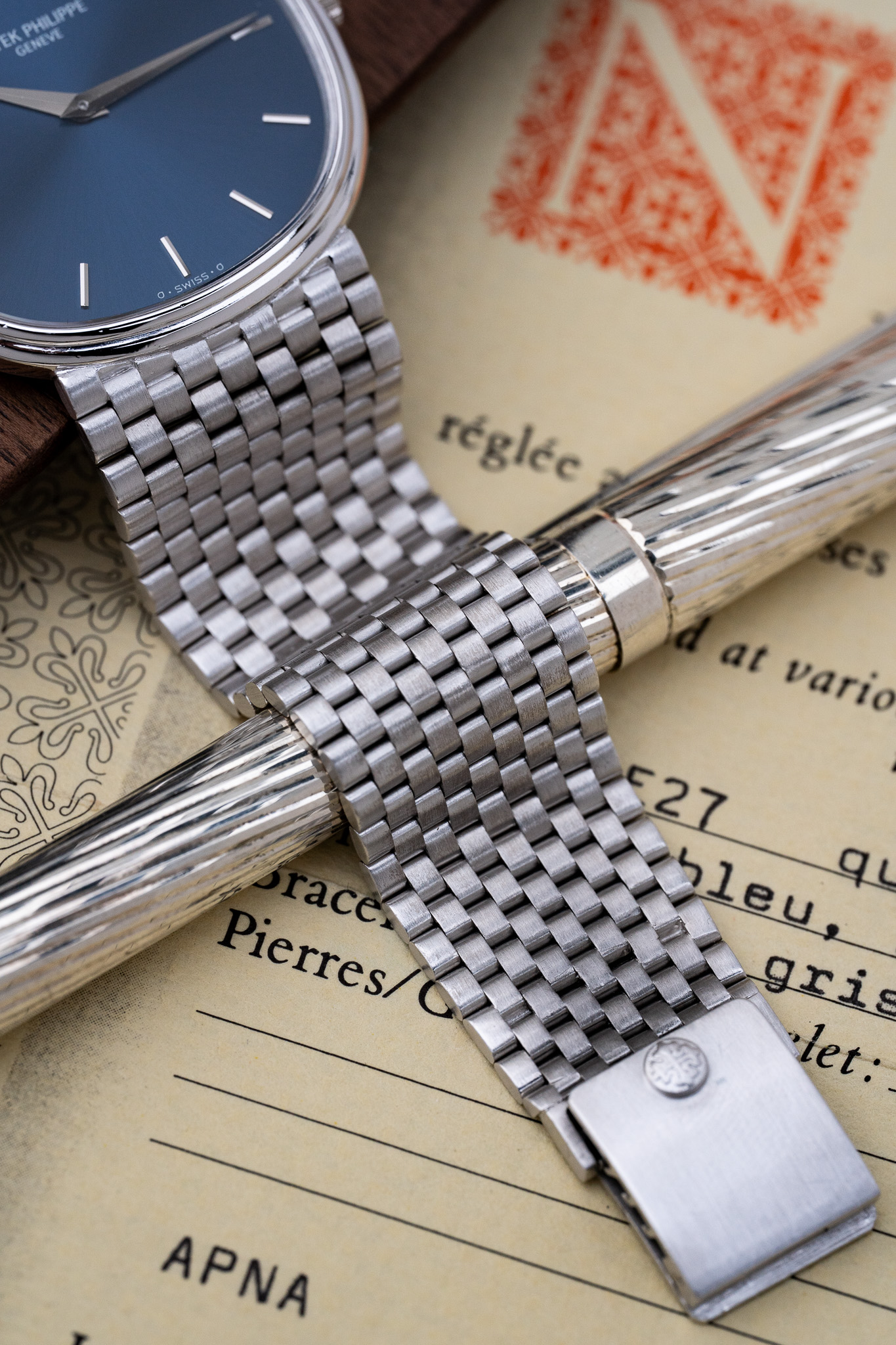 La référence 3879-002 est ici équipée de son bracelet intégré en or blanc, élément essentiel de l’identité du modèle. Fluide, parfaitement articulé et d’une grande finesse, il prolonge naturellement le boîtier et participe pleinement à l’équilibre visuel de l’ensemble. Au poignet, la montre se fait presque oublier, tant par son poids maîtrisé que par la douceur de son porté.