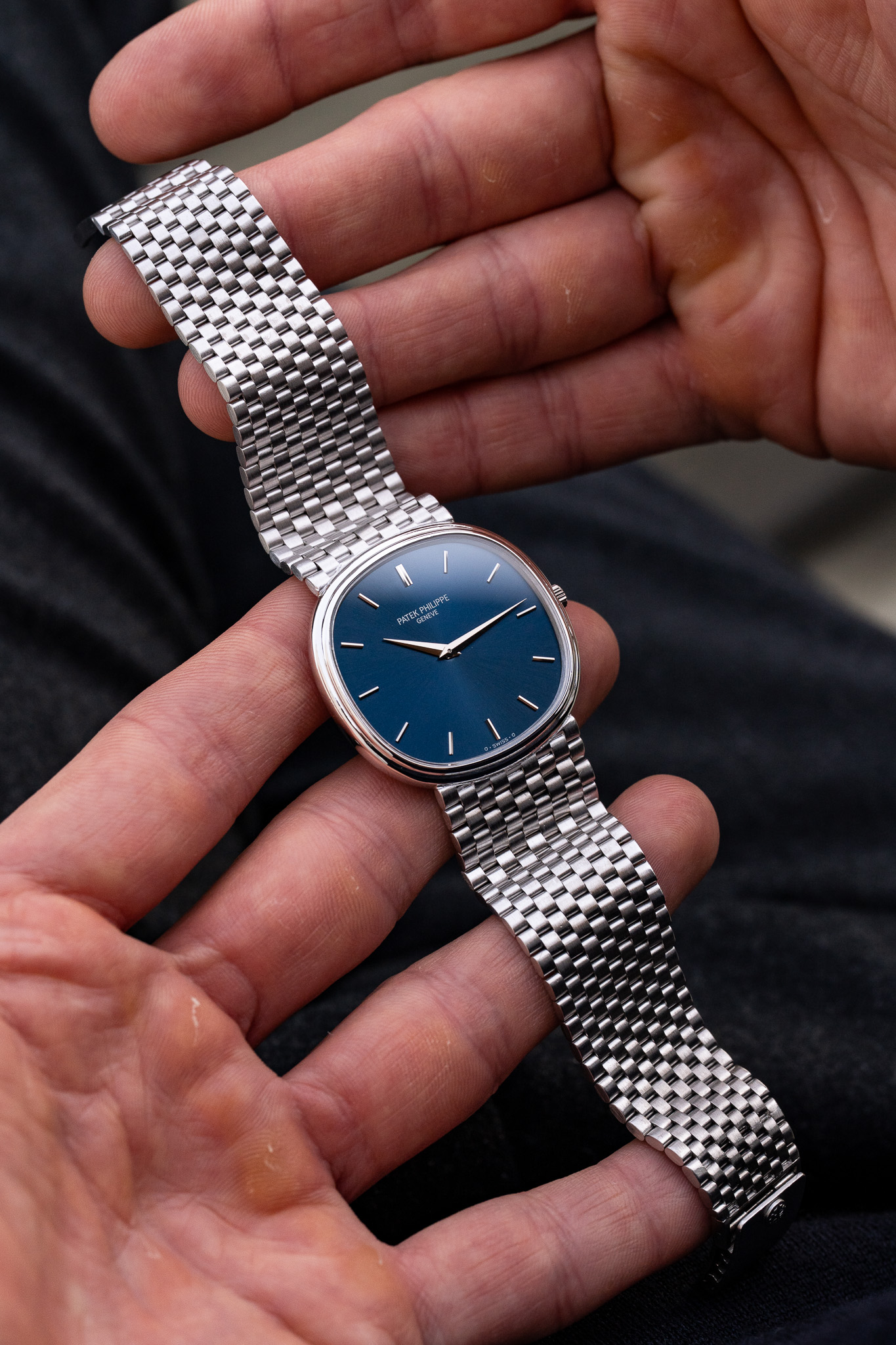 Le cadran bleu, signature absolue de la Golden Ellipse, présente une teinte profonde et homogène, au rendu soyeux. Dépourvu de toute mention superflue, il se limite à de fins index appliqués et aux aiguilles dauphines en or blanc, renforçant la pureté du dessin. Cette retenue graphique confère à la montre une intemporalité rare, immédiatement reconnaissable par les connaisseurs.