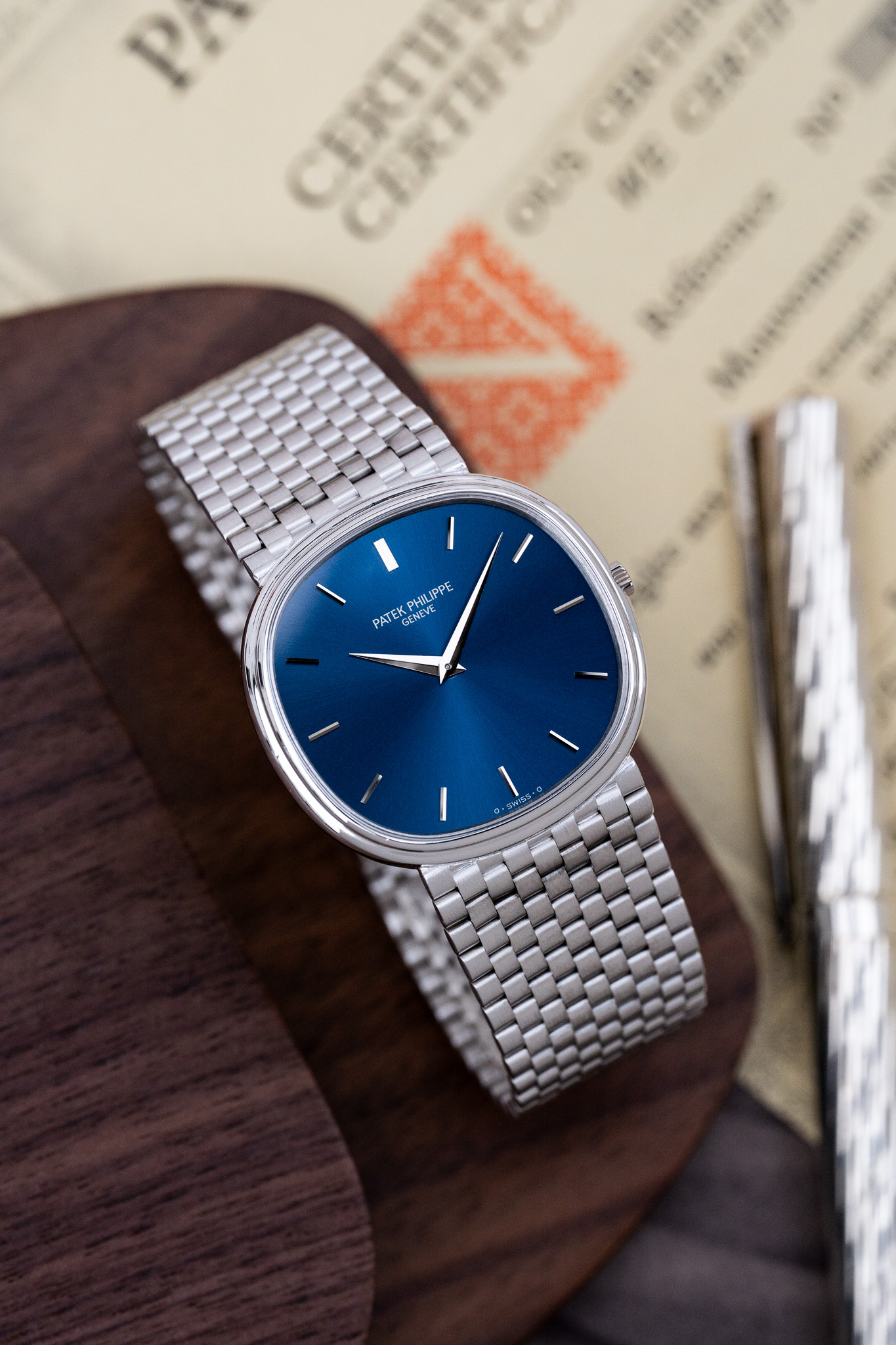 La Golden Ellipse occupe une place singulière dans l’histoire de Patek Philippe. Introduite à la fin des années 1960, elle incarne une vision radicalement différente de l’élégance horlogère, fondée sur l’harmonie des proportions plutôt que sur la complexité mécanique. La référence 3879-002 en est l’une des expressions les plus raffinées.