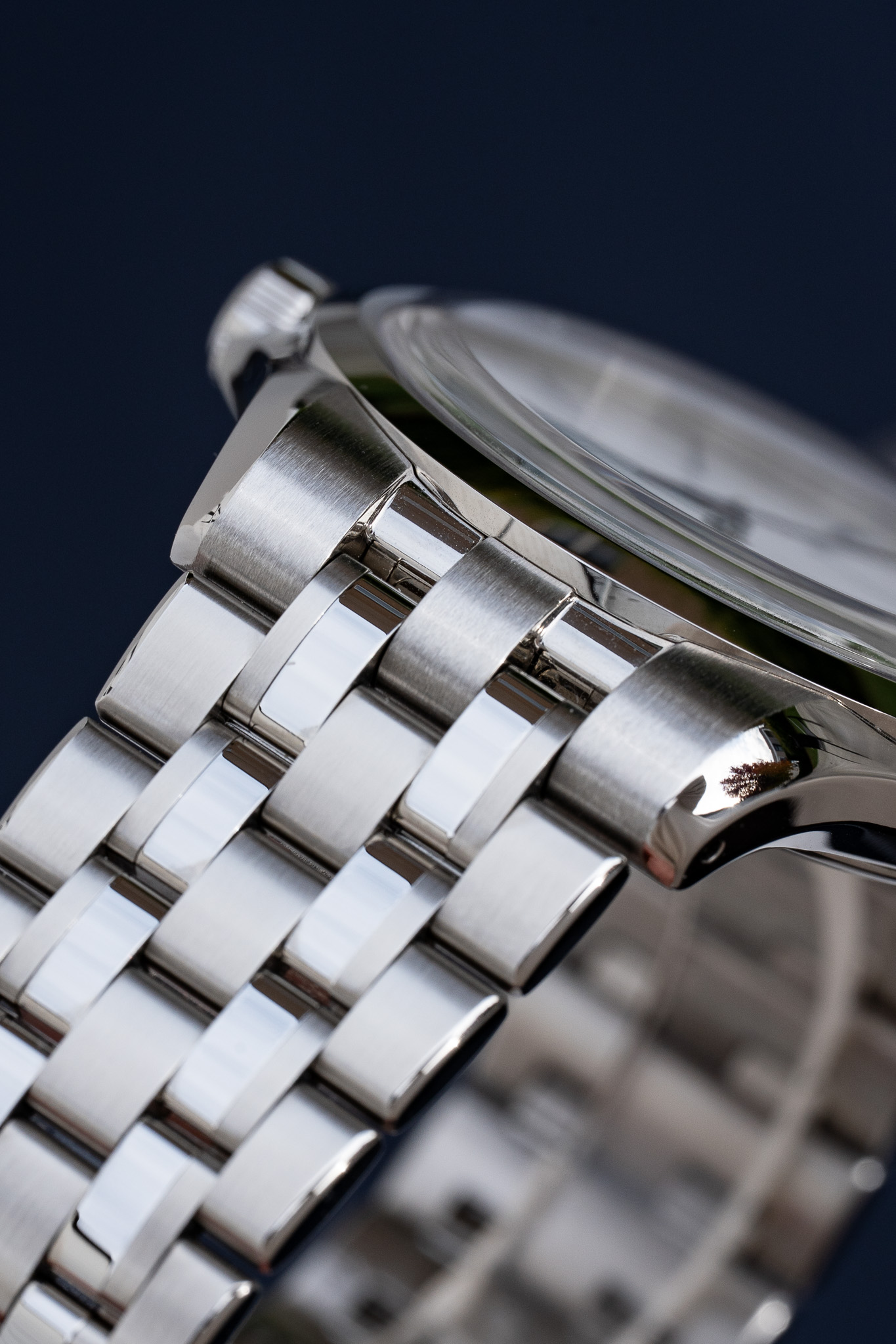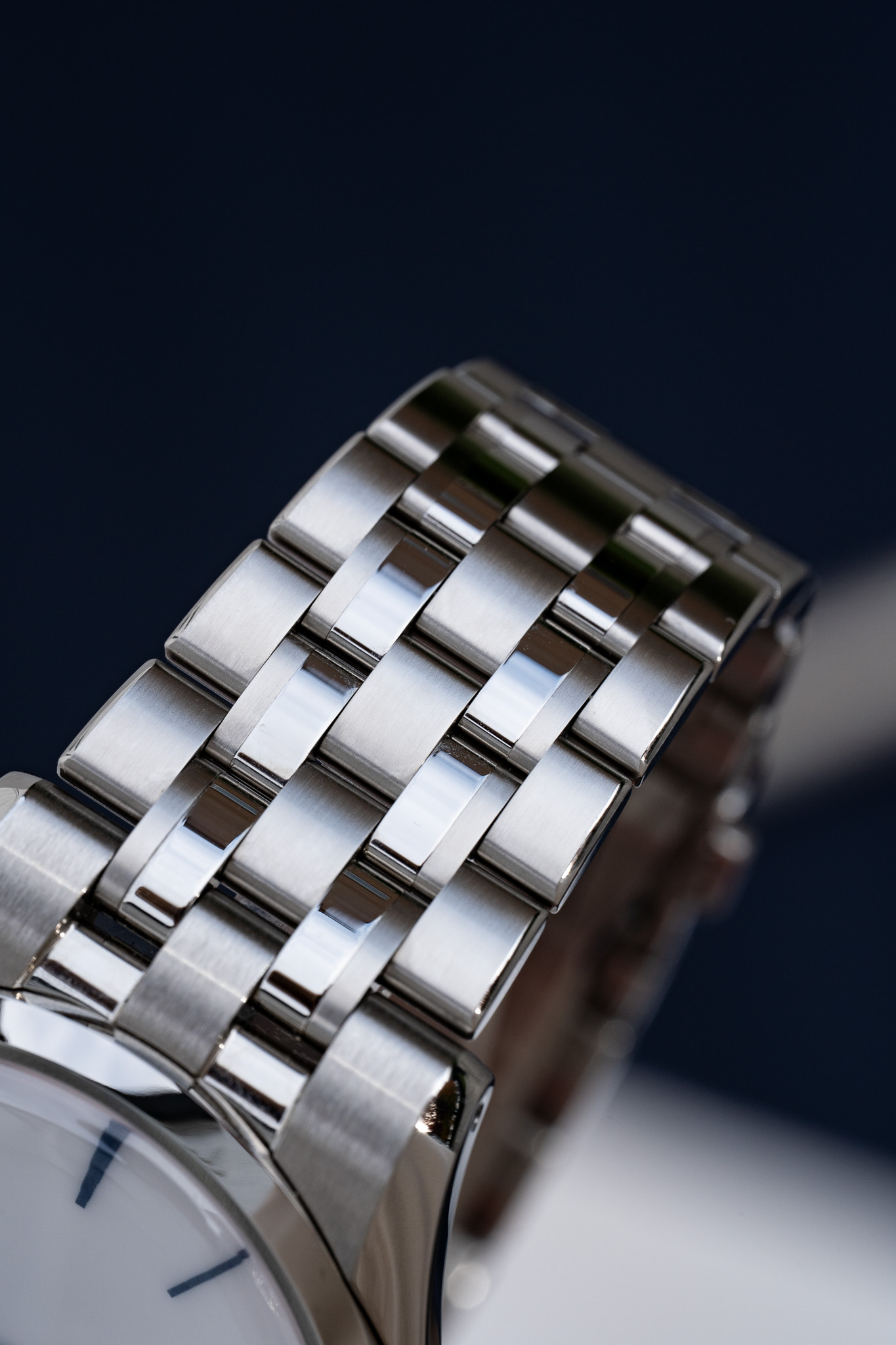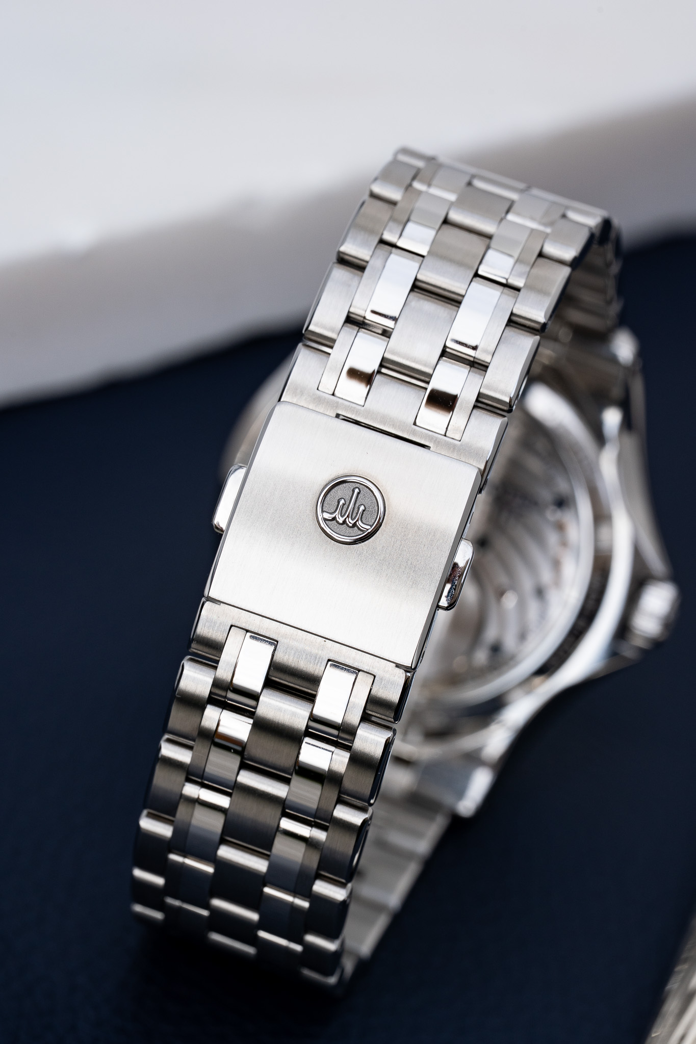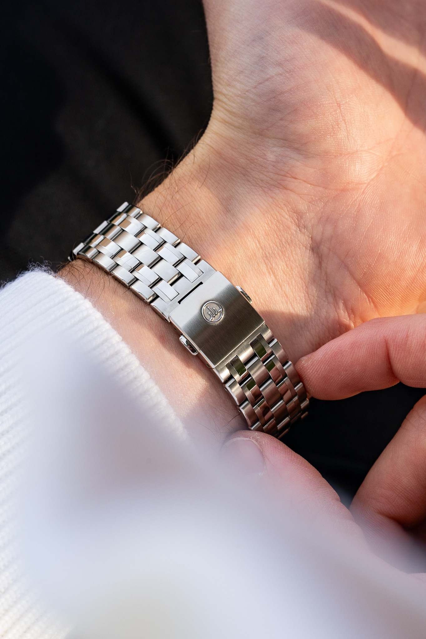 The integrated stainless steel bracelet, composed of seven finely articulated links, continues the natural lines of the case. Its triple-fold clasp with push-buttons ensures comfort and security while maintaining the watch’s fluid aesthetic coherence.