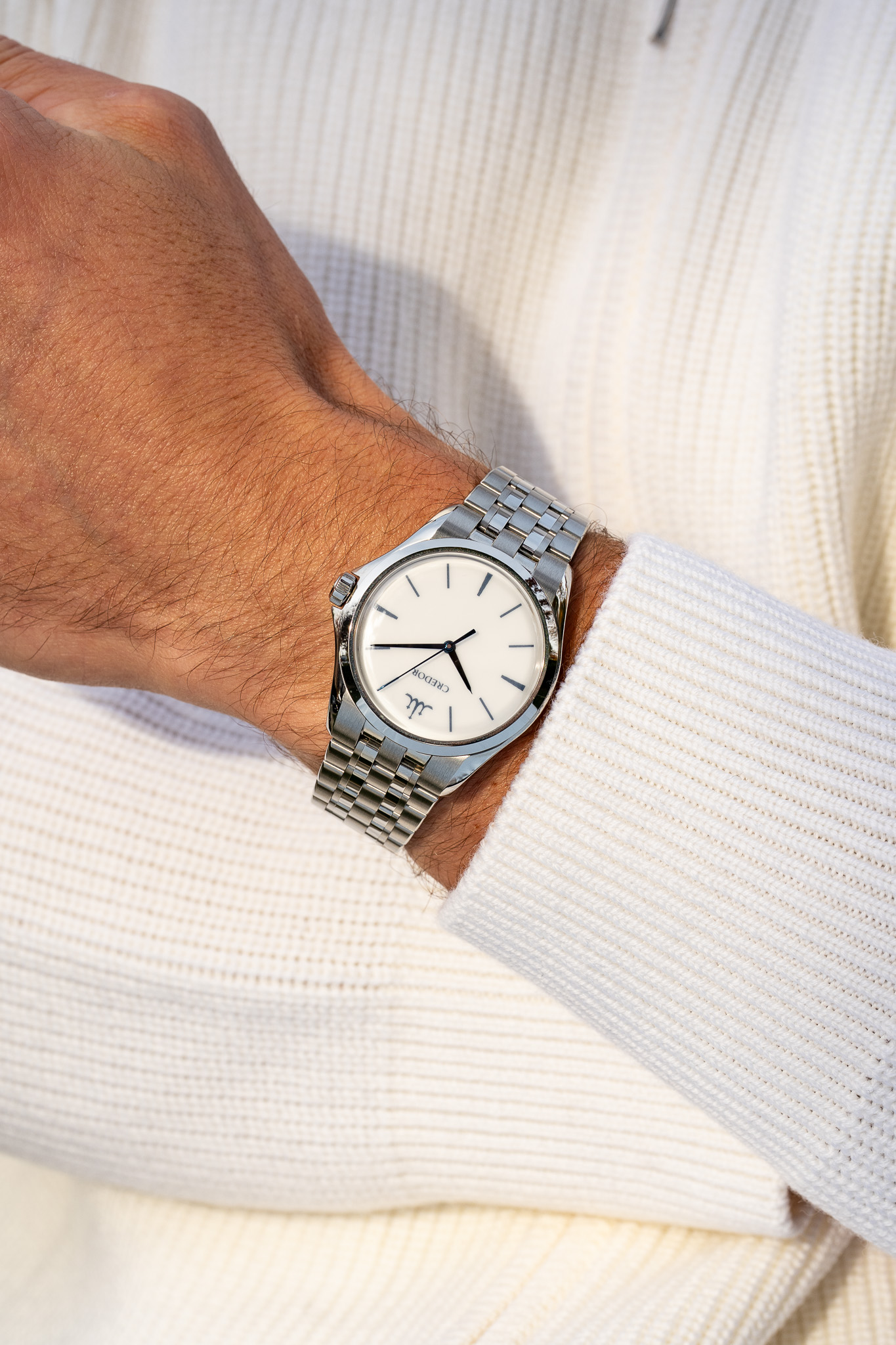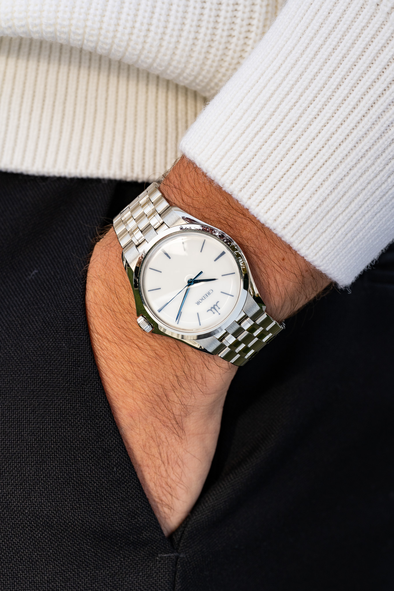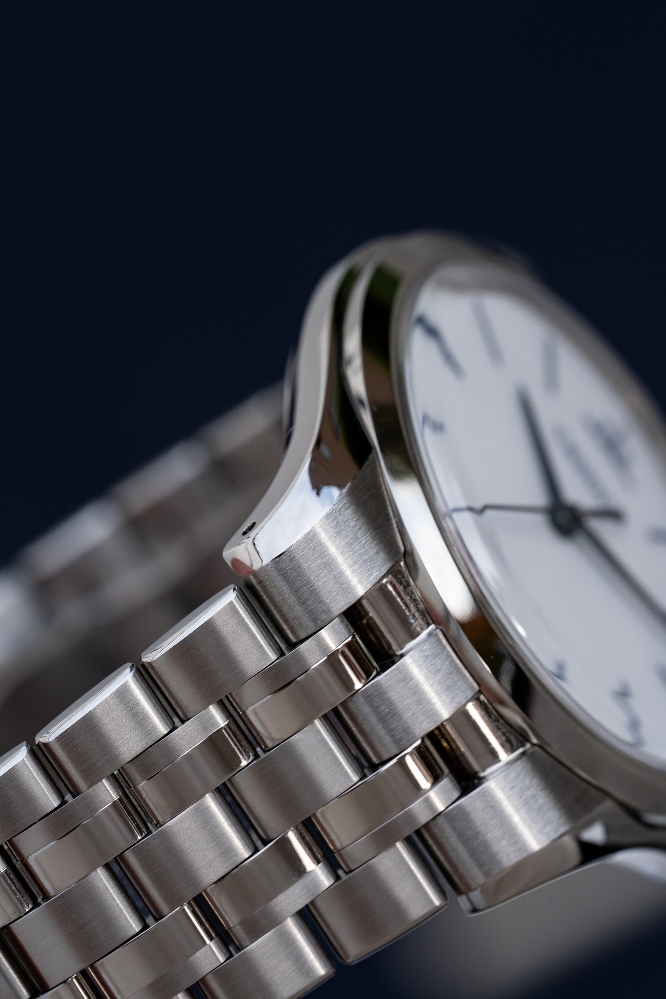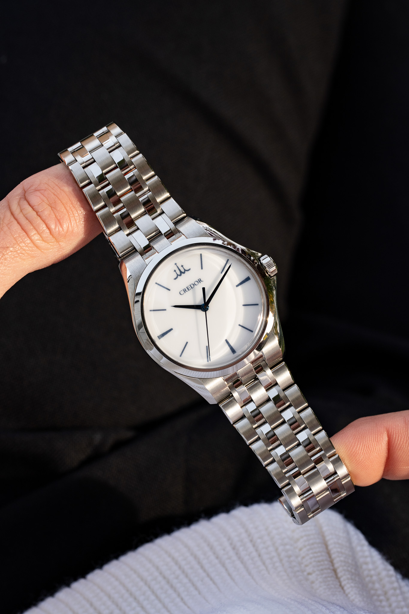 The integrated stainless steel bracelet, composed of seven finely articulated links, continues the natural lines of the case. Its triple-fold clasp with push-buttons ensures comfort and security while maintaining the watch’s fluid aesthetic coherence.