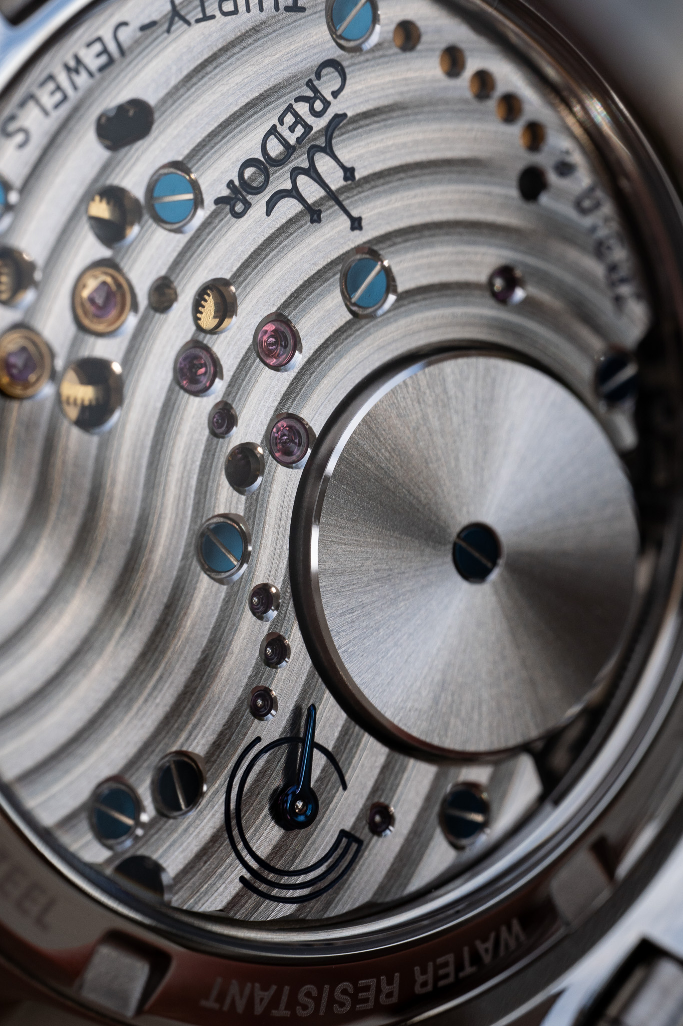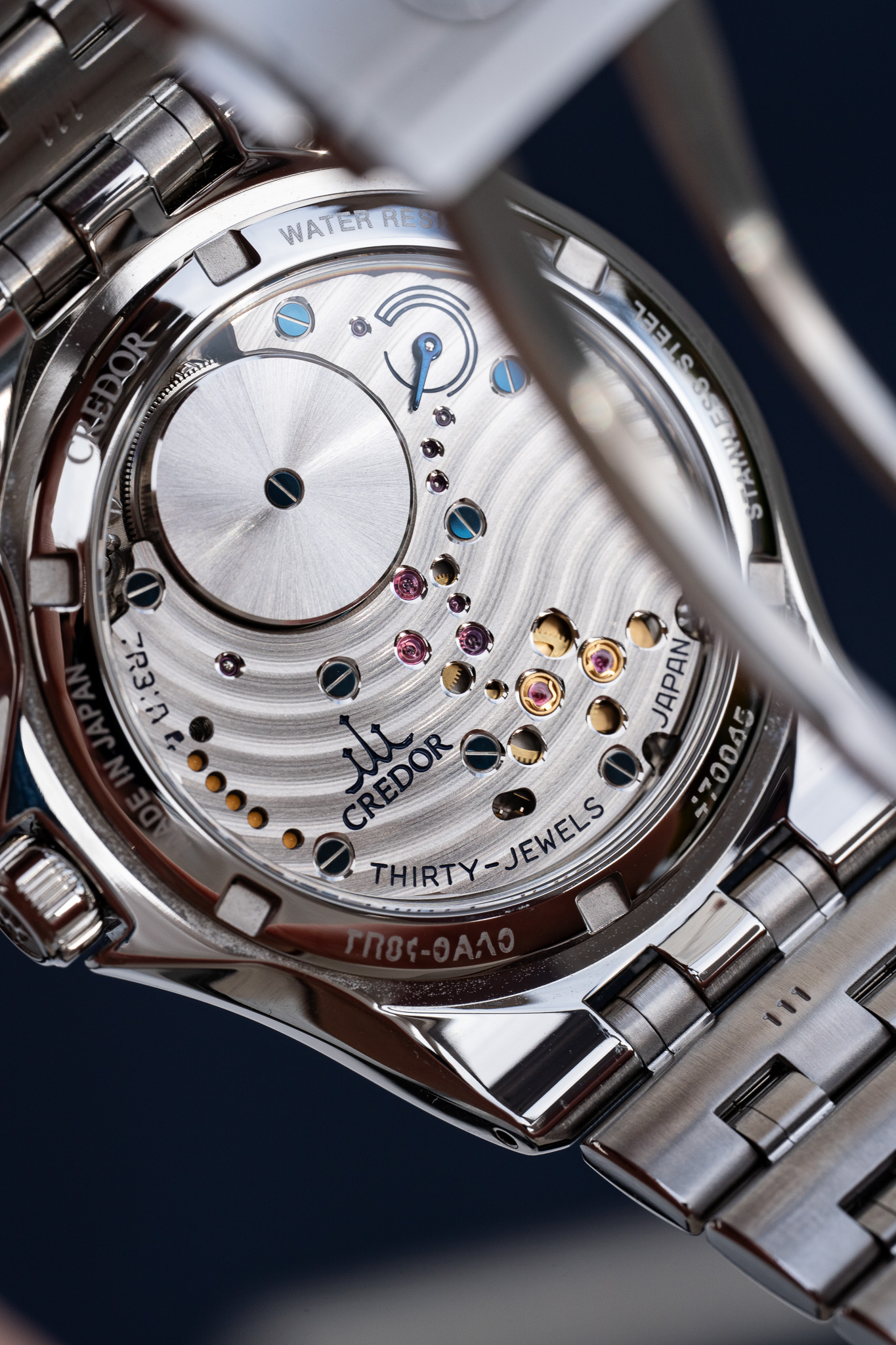 Inside beats the hand-wound Spring Drive calibre 7R31, developed exclusively for Credor. This exceptional movement combines the mechanical energy of a mainspring with the precision of an electromagnetic regulator, maintaining an average deviation of around ±1 second per day. It provides a 72-hour power reserve thanks to its twin barrels. The finishing, visible through the sapphire back, is executed entirely by hand: polished bevels, blued screws, and bridges engraved with a flowing-water motif.