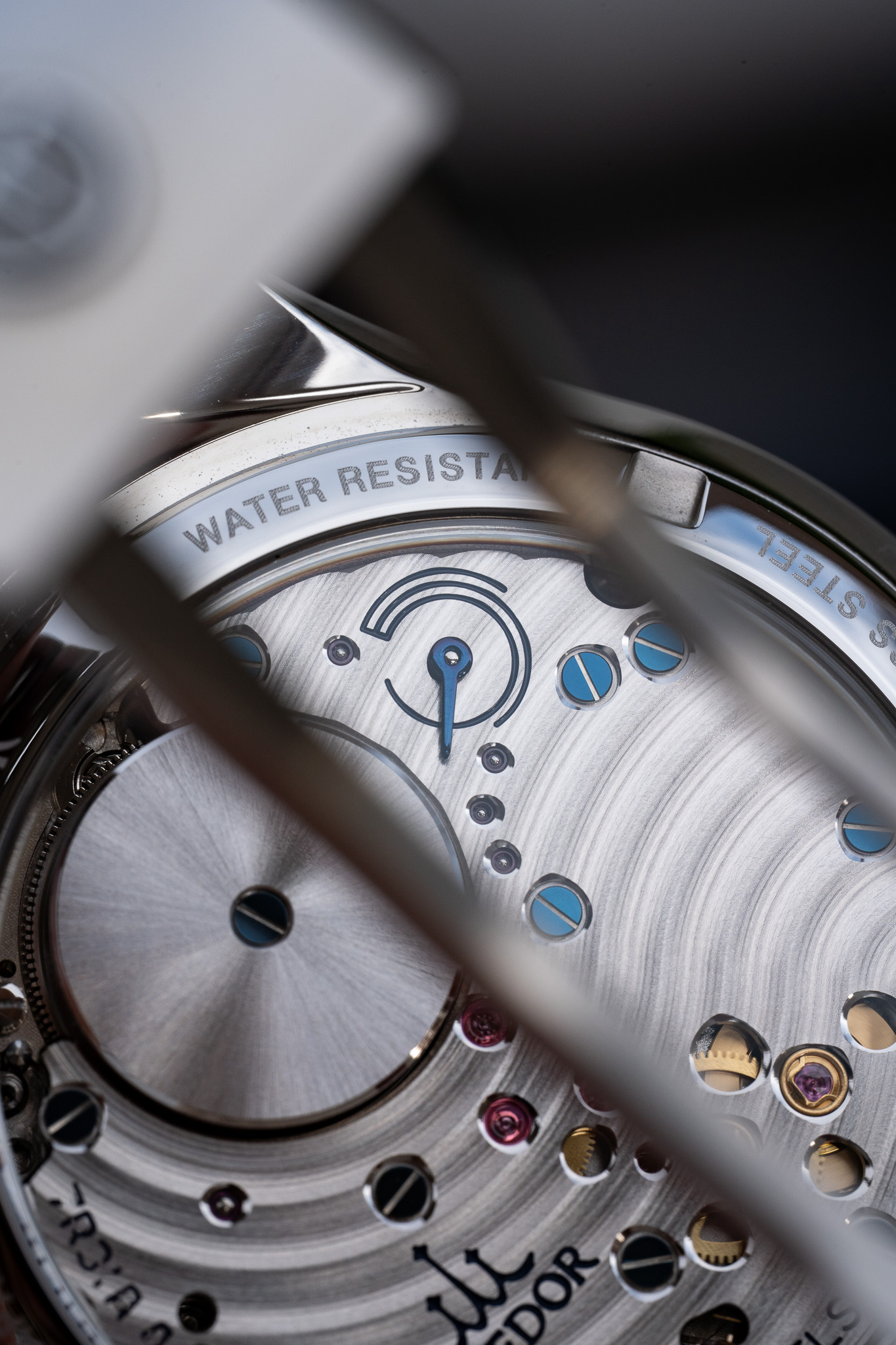 The porcelain dial, created through a unique artisanal process, displays a pristine, slightly domed surface. Blue baton indexes and heat-blued hands bring a touch of refined contrast. This minimalist execution, devoid of any visible complications, is defined by its symmetry and the calming sense of balance it conveys. The power reserve indicator is placed on the back of the movement to preserve the purity of the dial.