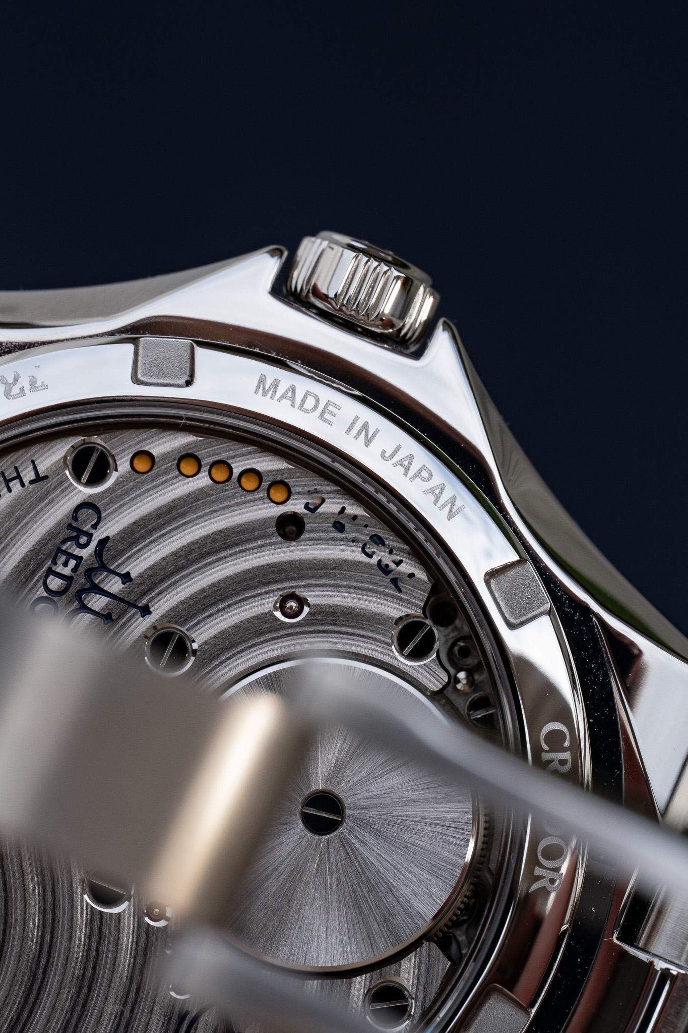 The stainless steel case, polished using the Zaratsu technique, measures 39 mm in diameter and 10.8 mm in thickness. Its distortion-free mirror surfaces and subtly curved flanks capture the light with absolute purity. The result exudes quiet elegance in the most Japanese sense, where restraint becomes the ultimate form of luxury. The sapphire caseback reveals a decorative motif inspired by the gentle flow of a stream, symbolizing the serene passage of time.