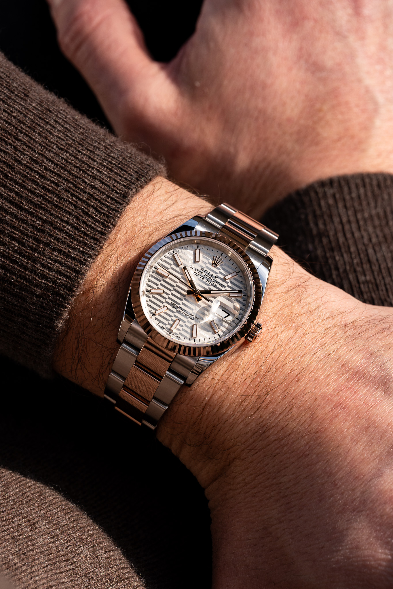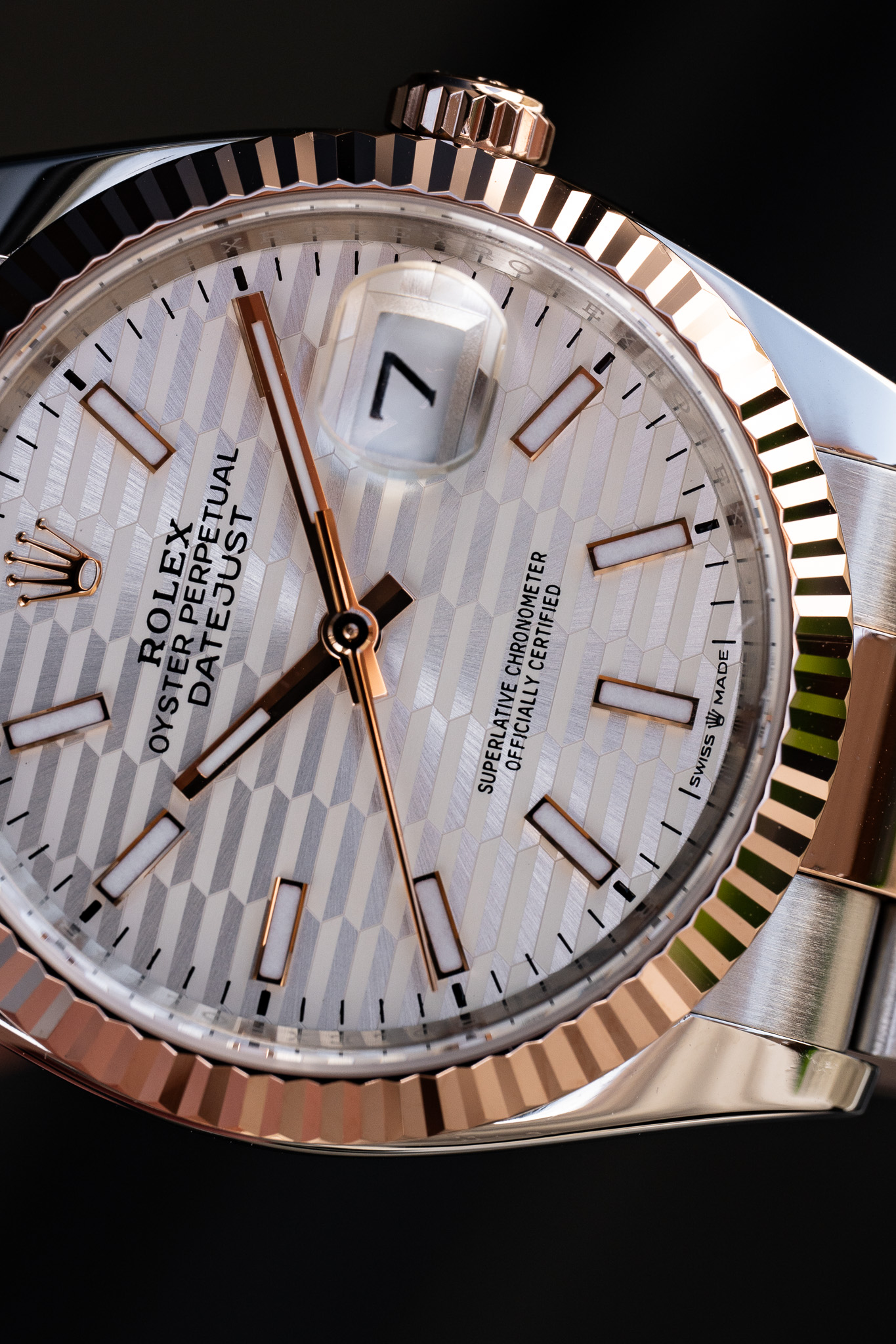 Le cadran argent au motif cannelé constitue l’élément distinctif de cette configuration. Inspiré de la lunette emblématique de la Datejust, ce décor en relief crée un jeu de lumière sophistiqué, apportant profondeur et texture à l’ensemble. Les index appliqués et les aiguilles en or Everose assurent une lisibilité claire et équilibrée, tandis que la date à 3 heures, accompagnée de la loupe Cyclope, rappelle la fonction fondatrice du modèle.