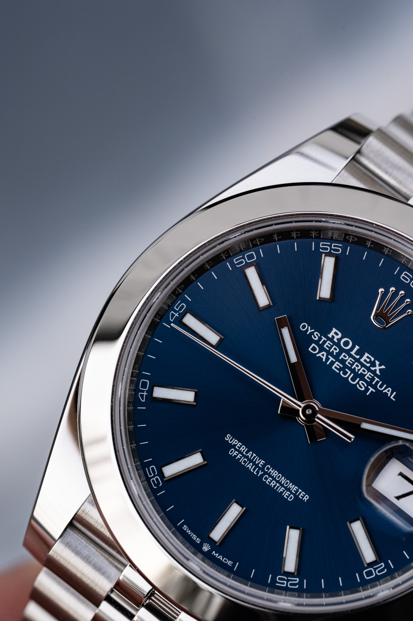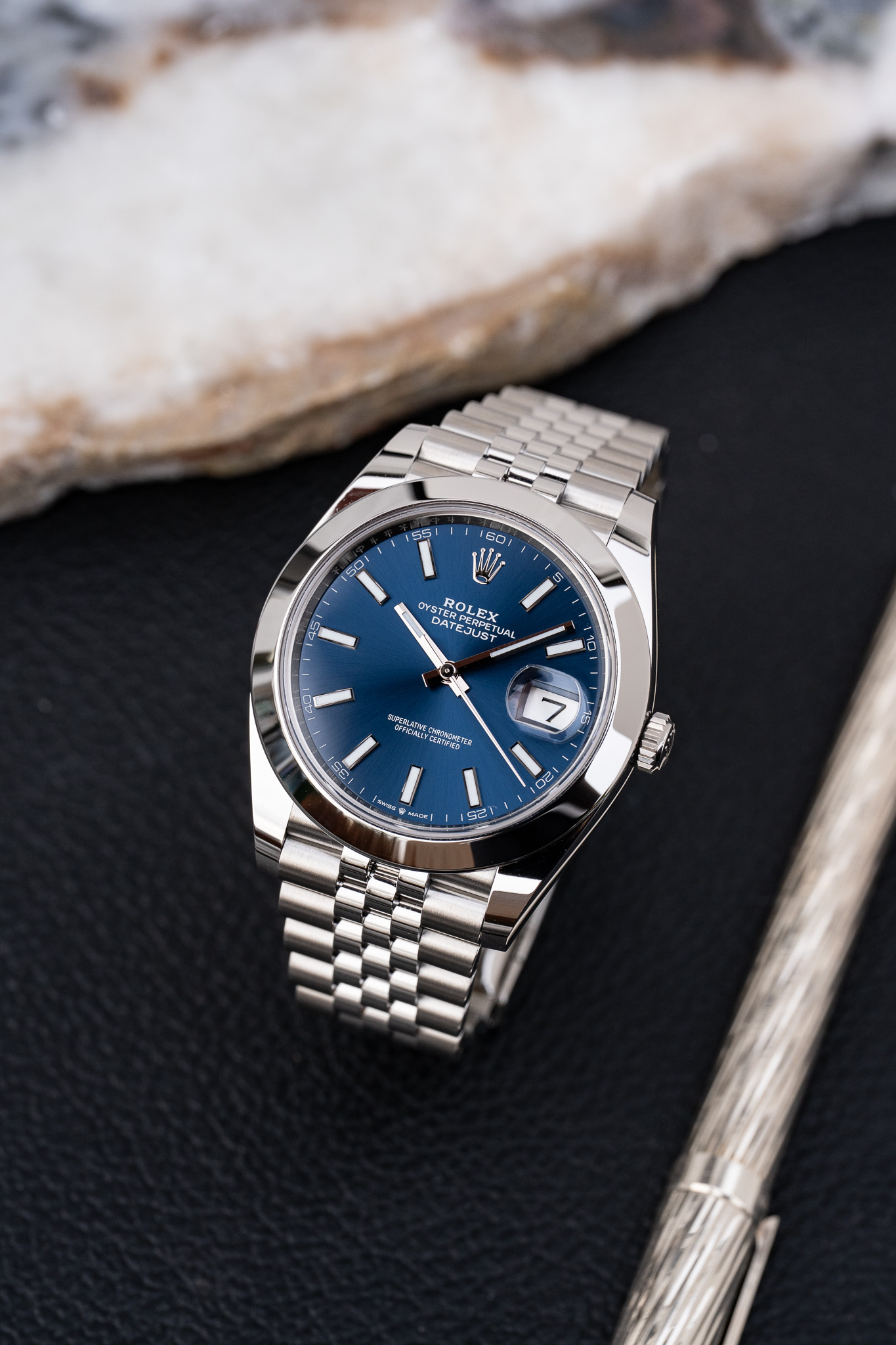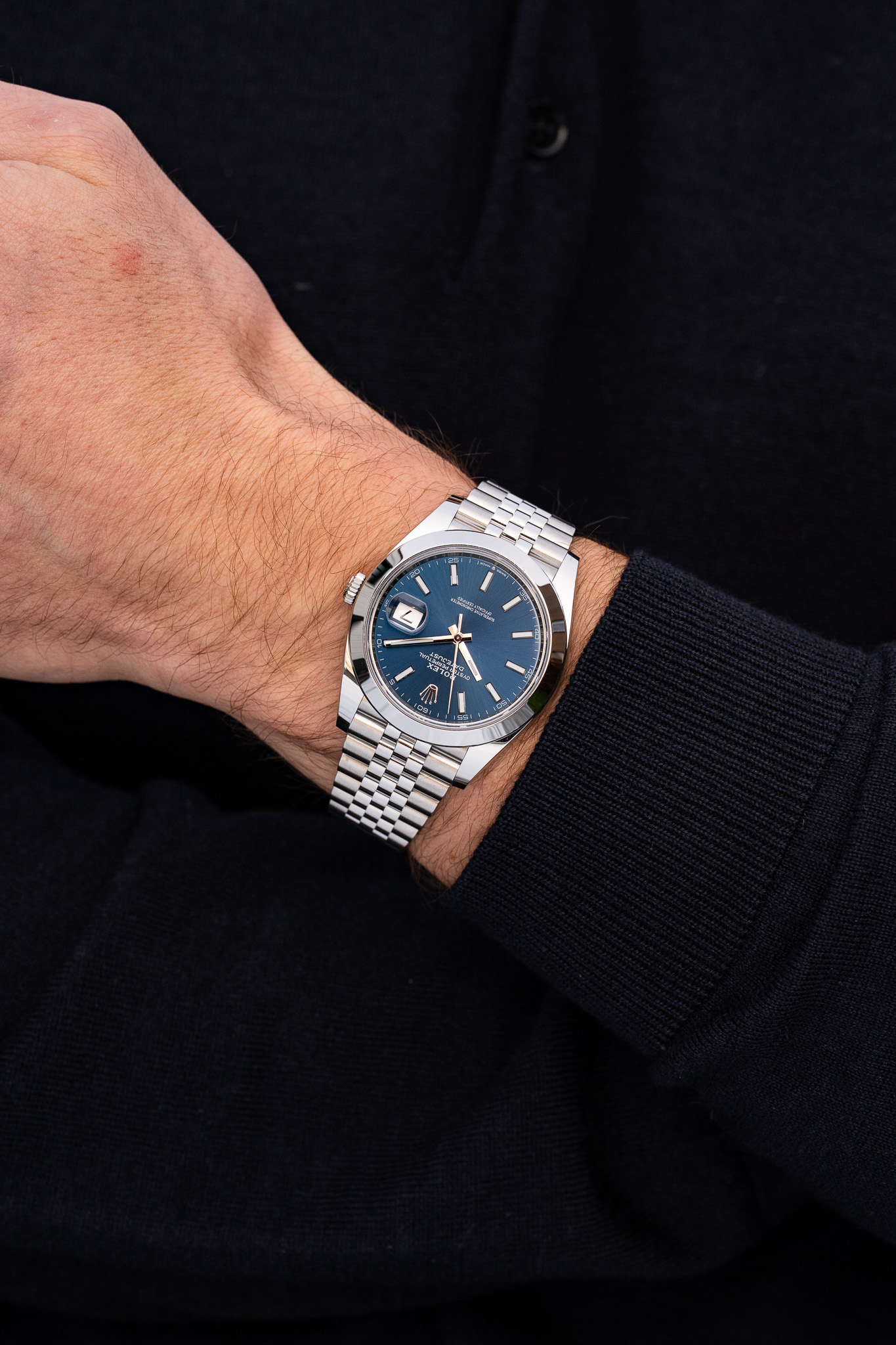 Introduite en 2017 et marquant l’arrivée du nouveau calibre 3235 avec 70h de réserve de marche au lieu de 45h pour la version précédente, la 126300 arbore une lunette plus fine et un profil de cornes plus discret. Les proportions de la référence 126300 sont tout simplement parfaites, nous sommes loin des proportions douteuses de la Datejust II que la 126334 remplace.