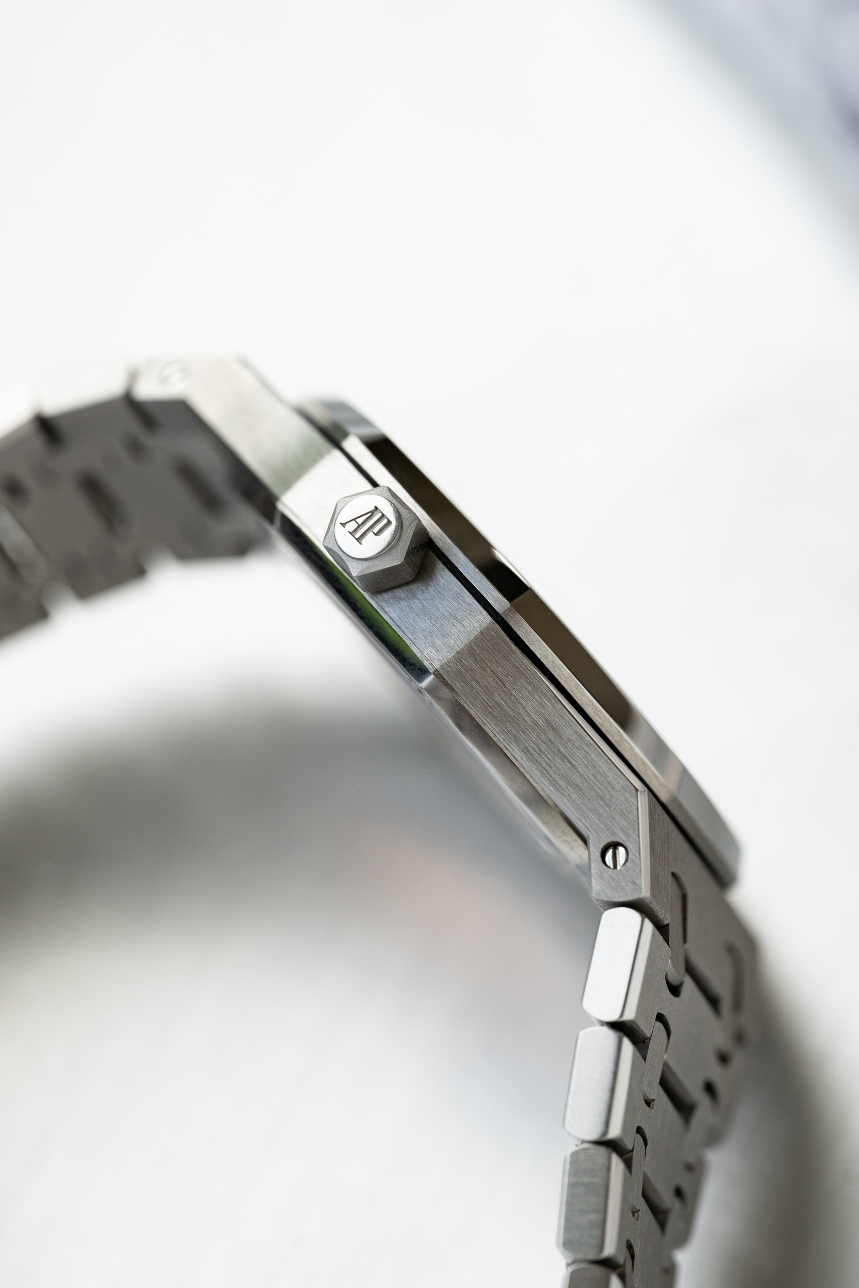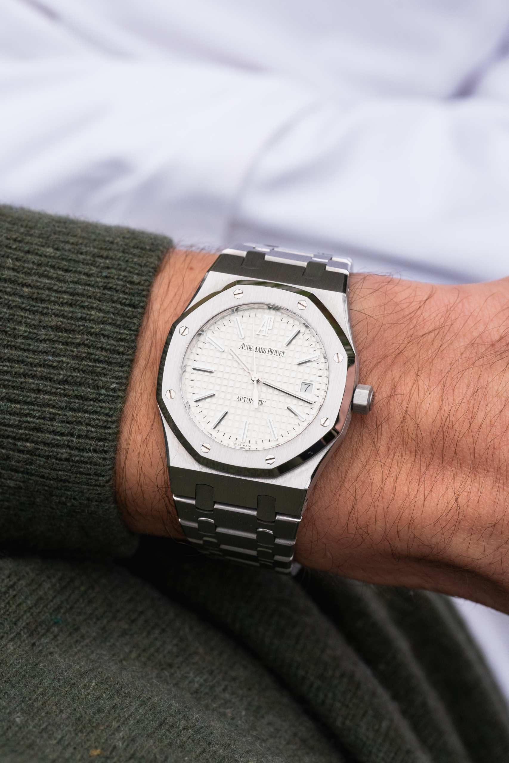 - Combining elegance and sportiness, the Royal Oak 15300ST has a 39 mm stainless steel case. The white dial is simple yet sophisticated with its iconic "Grande Tapisserie" motif and white gold hands and hour markers. Powered by the Calibre 3120 automatic movement, it offers a power reserve of up to 60 hours and is water-resistant to 50 metres. Measuring 39mm, the same size as the Jumbo, the Royal Oak 15300ST may not be as slim as the extra-thin Jumbo, but what it loses in slenderness it makes up for in ease of use and reliability. Equipped with a screw-down crown and a much stronger calibre with a quick set date, this 2012 example was sold shortly before the model was discontinued and subsequently replaced by the 41mm 15400ST, making the 15300ST the last 39mm in the Royal Oak Sports range. The Royal Oak 15300ST features a distinctive dial with a textured relief pattern called "tapestry". This intricate design is created using a complex guilloché process that involves engraving the dial with a special tool, giving it a three-dimensional effect that is both visually striking and highly detailed. Its use on the Royal Oak has become one of the defining features of this watch. Finished in a beautiful shade of white, ranging from off-white to snow-white, the 15300ST is a sublime watch for both summer and winter.