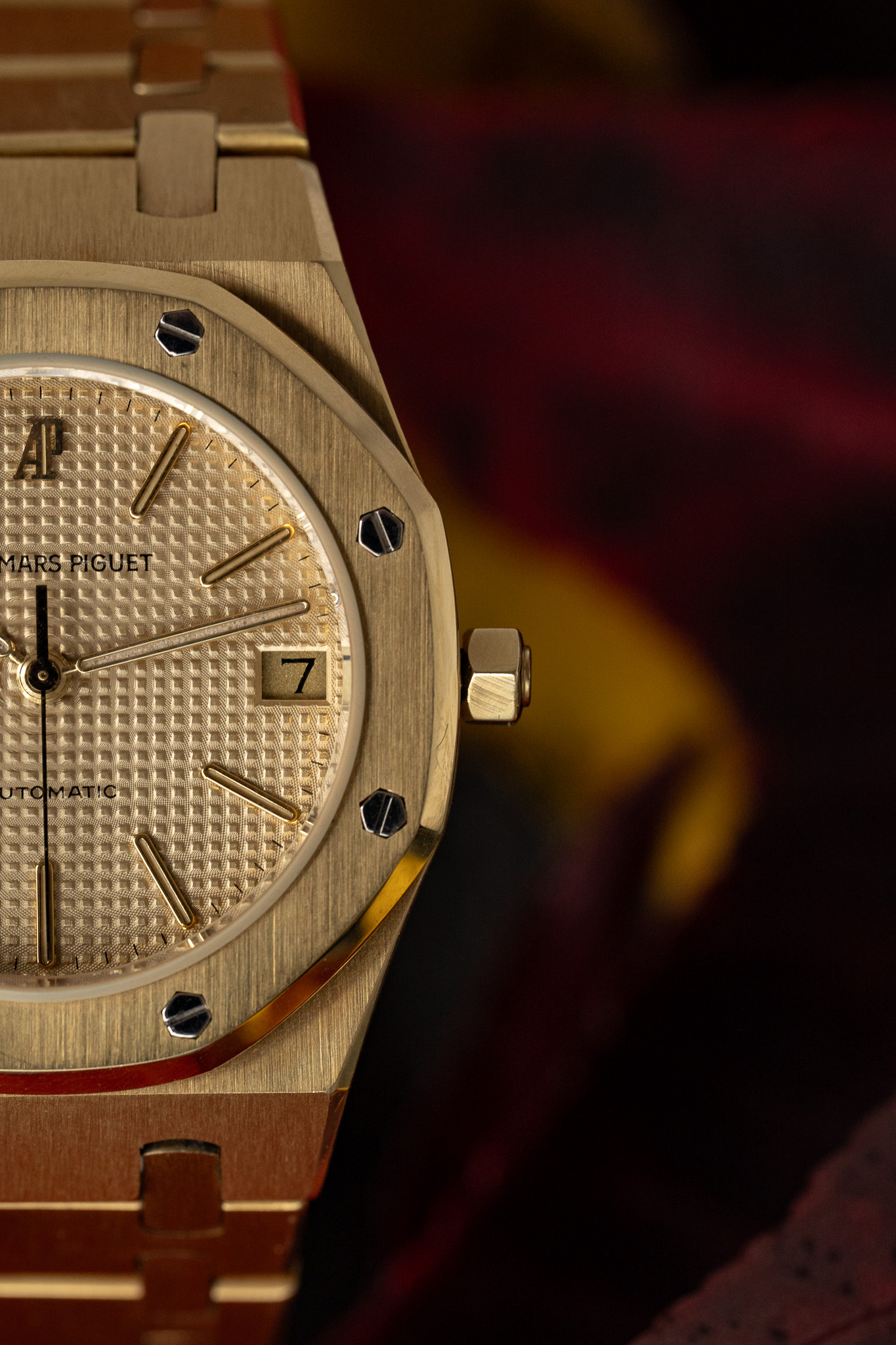 The “Petite Tapisserie” dial, a true signature of the Royal Oak, reveals a fine guilloché pattern that plays beautifully with the light. Its gold baton hour markers and matching hands ensure balanced readability, while the discreet date window at 3 o’clock is seamlessly integrated. The dial’s tones shift between soft champagne and brushed silver depending on the light, harmonizing perfectly with the warmth of the case.
