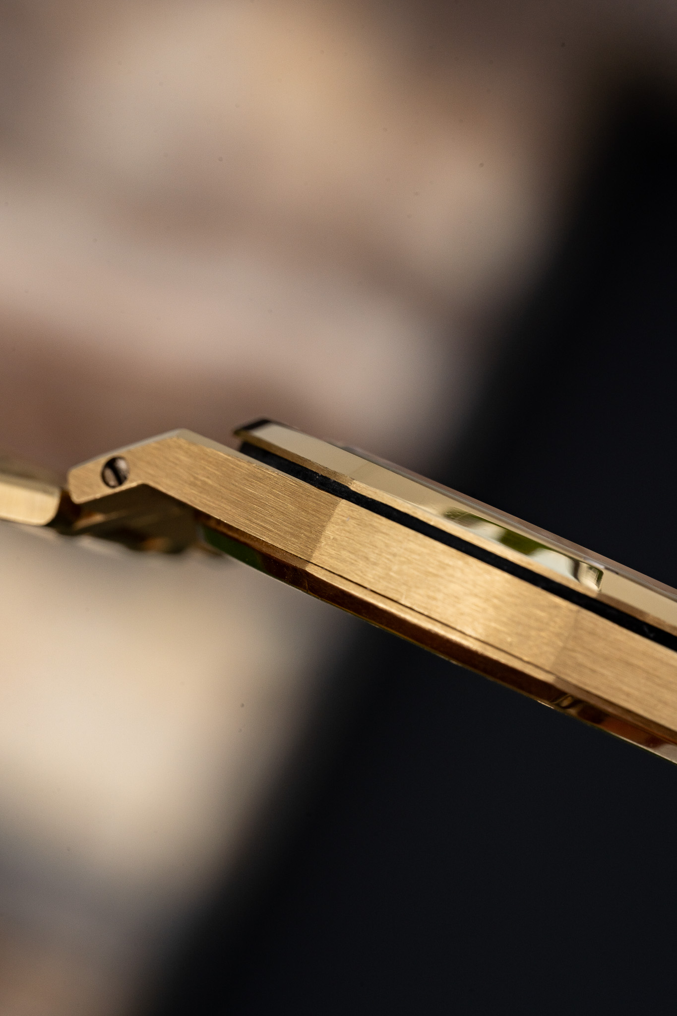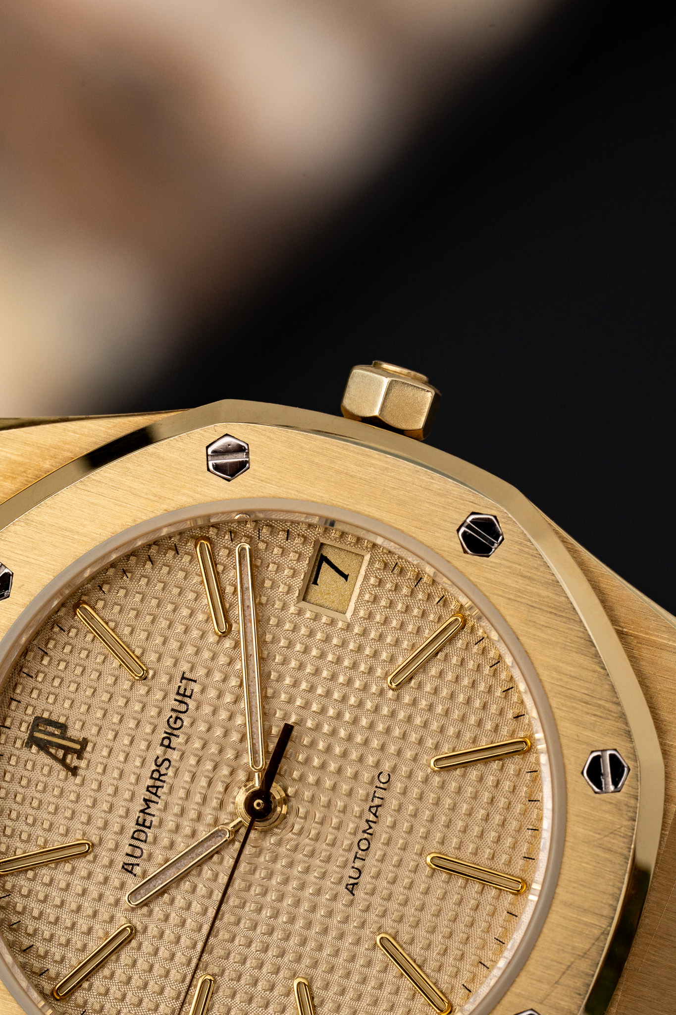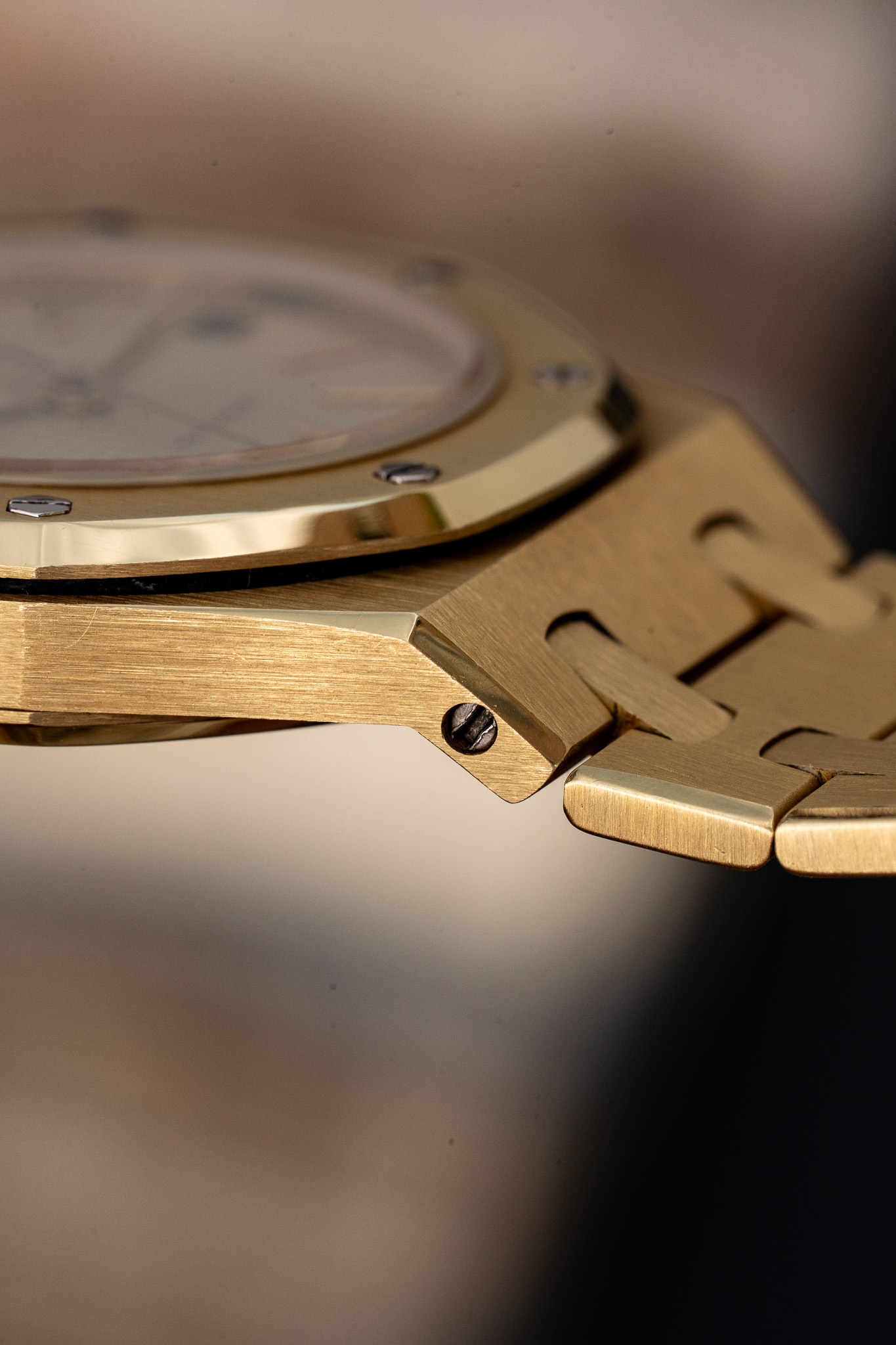 The case, crafted in 18-carat yellow gold, displays harmonious proportions with a 35 mm diameter and a slim profile, offering a subtle yet elegant presence on the wrist. The octagonal bezel with its eight hexagonal screws, the sharp edges, and the perfect continuity of the integrated bracelet recall Genta’s original vision, here elevated by the warmth of precious metal. The alternation of polished and satin-brushed surfaces demonstrates the precision and craftsmanship that define Audemars Piguet’s finishing excellence.