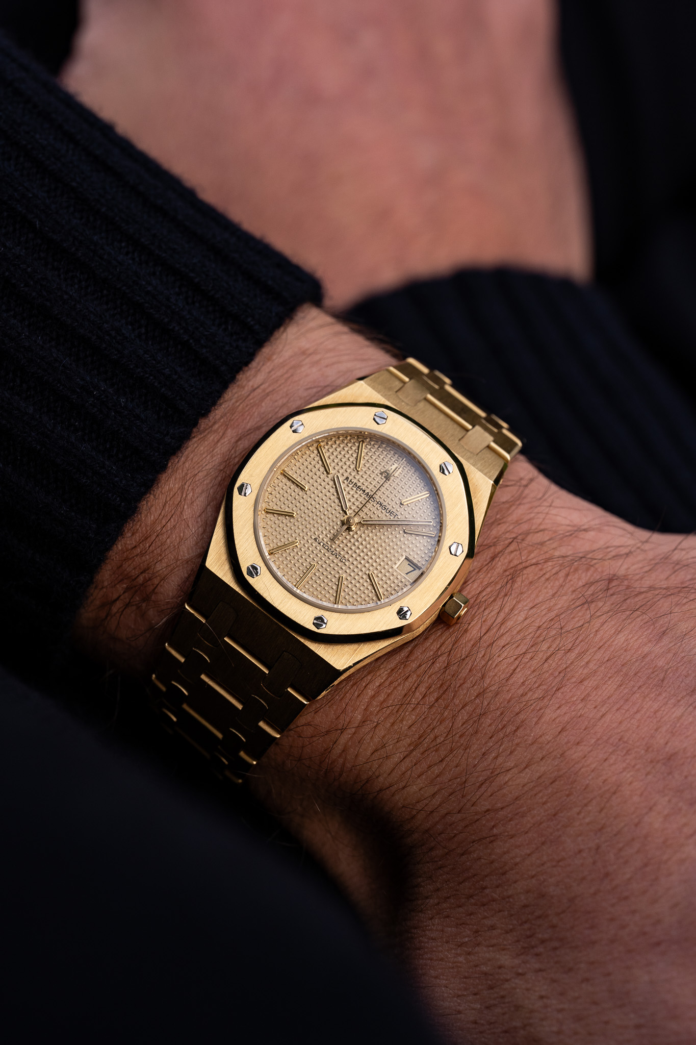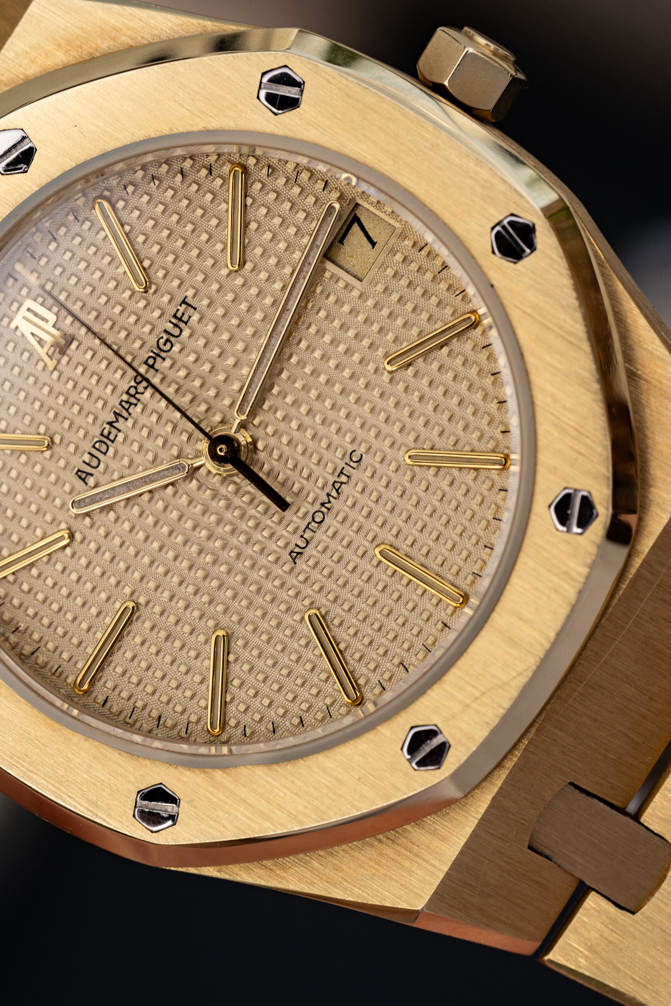 The “Petite Tapisserie” dial, a true signature of the Royal Oak, reveals a fine guilloché pattern that plays beautifully with the light. Its gold baton hour markers and matching hands ensure balanced readability, while the discreet date window at 3 o’clock is seamlessly integrated. The dial’s tones shift between soft champagne and brushed silver depending on the light, harmonizing perfectly with the warmth of the case.