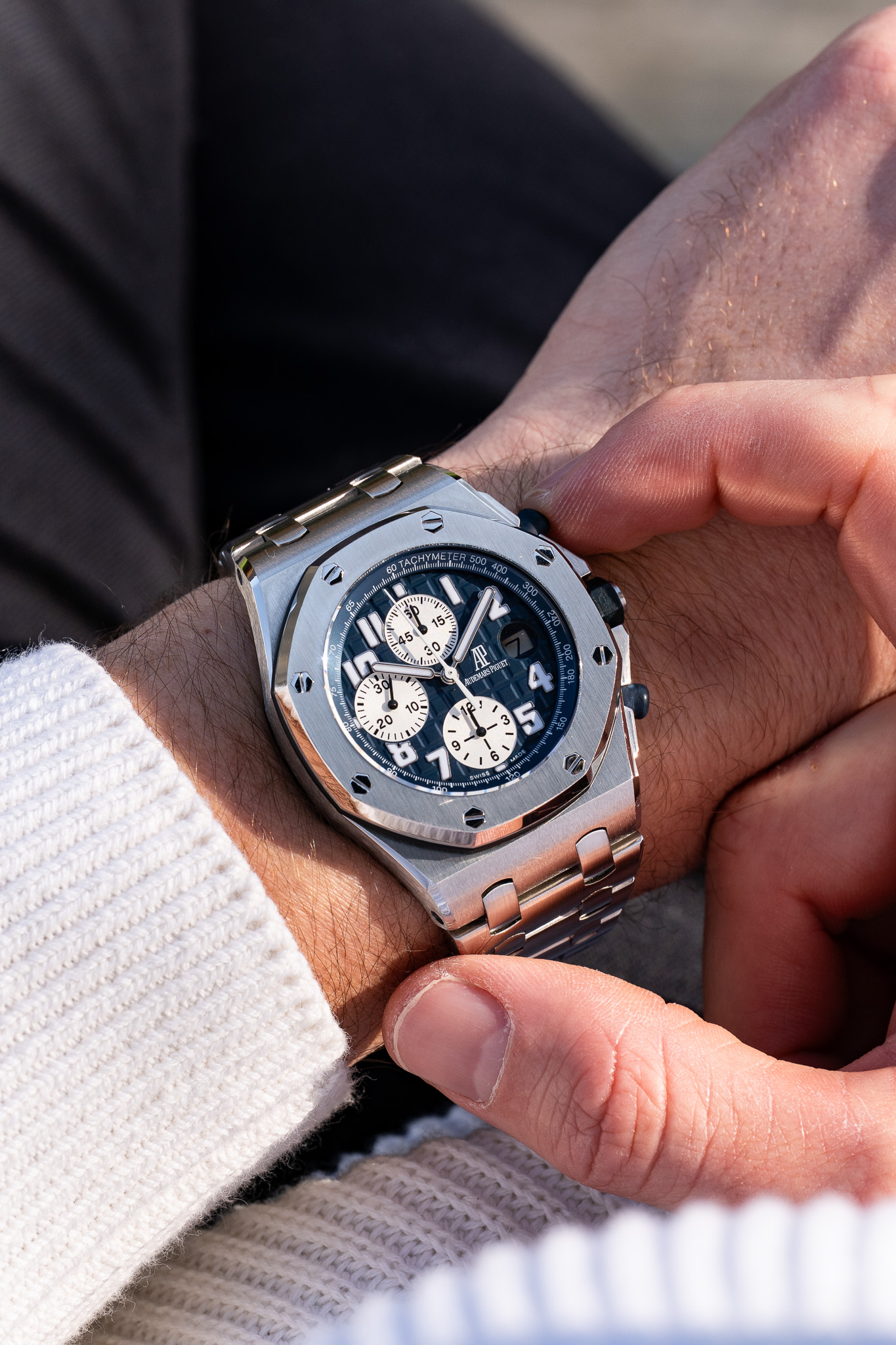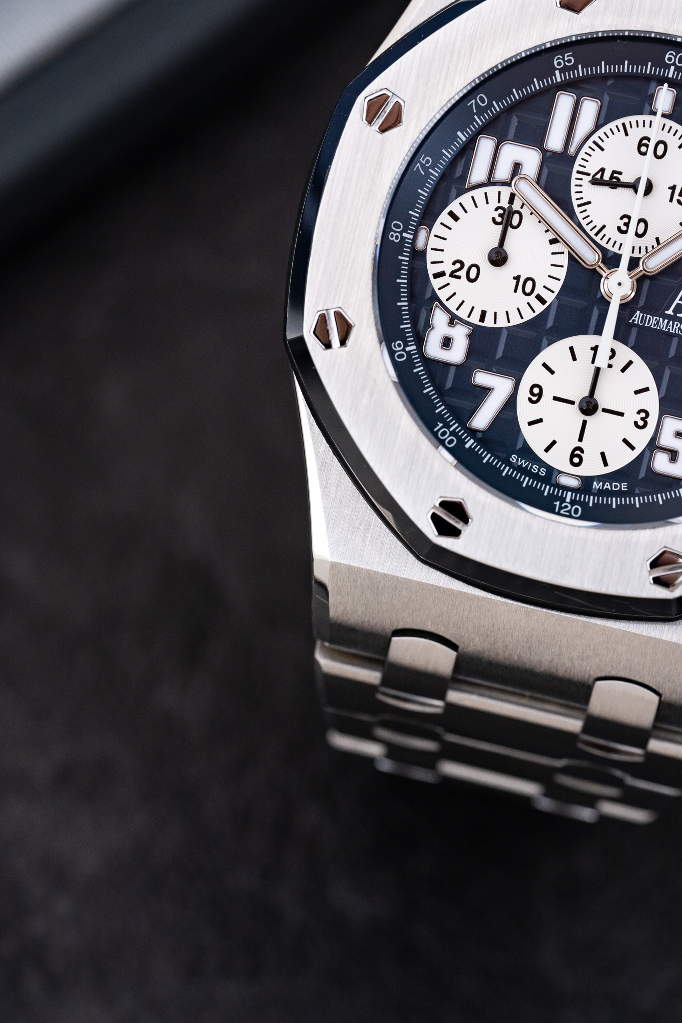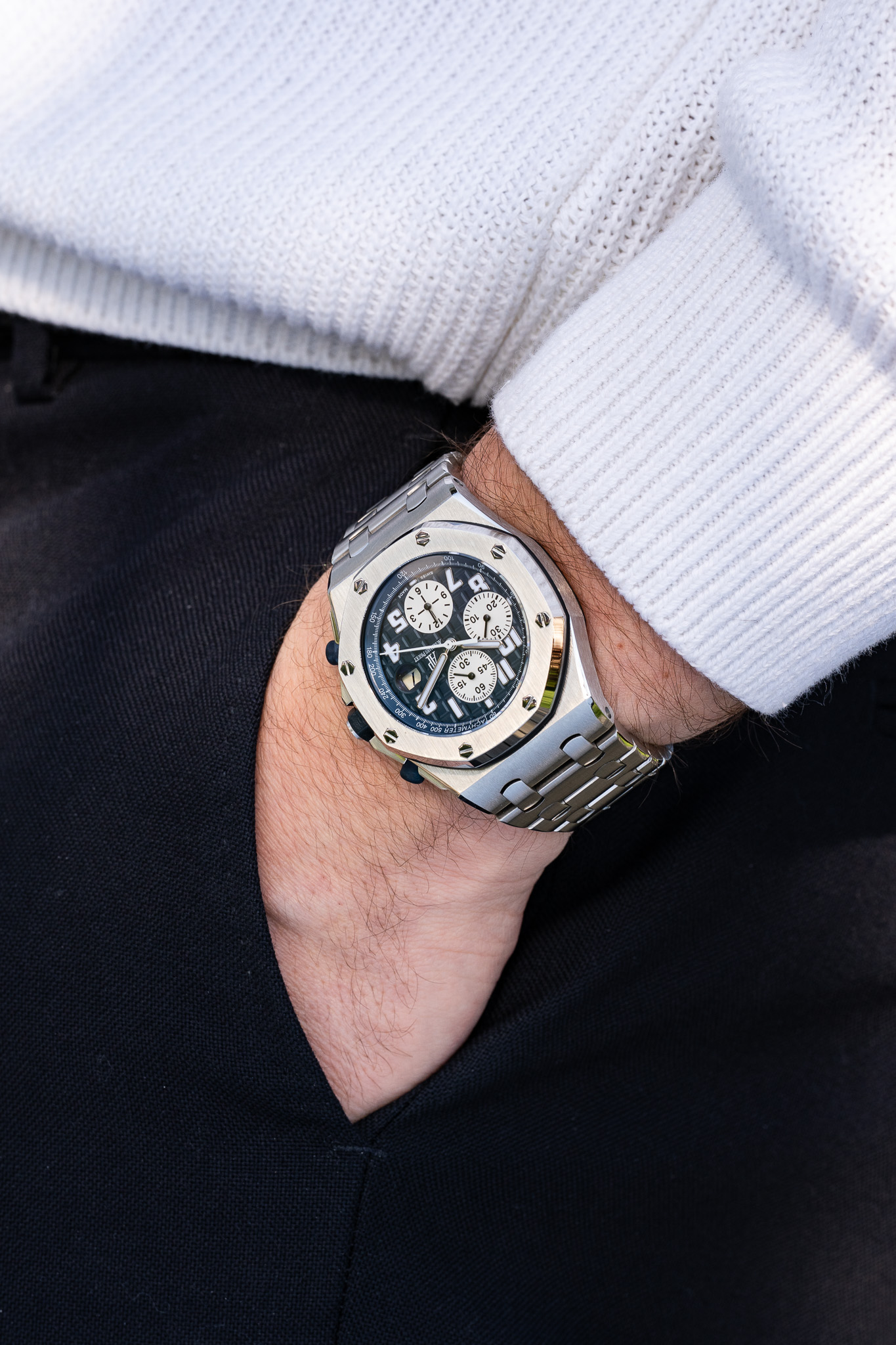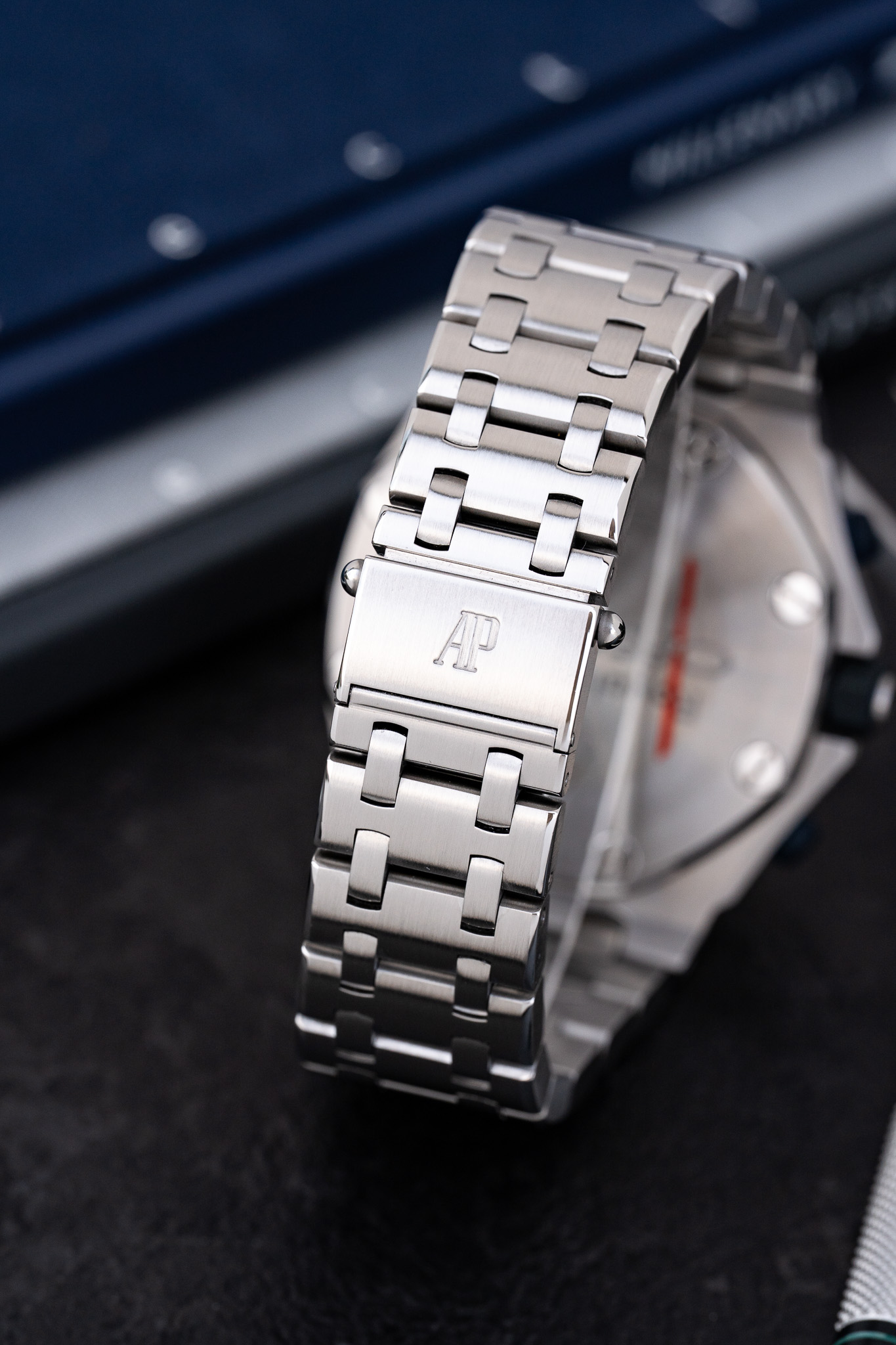 Le boîtier conserve la construction robuste qui a fait la réputation de la Royal Oak Offshore, avec une étanchéité de 100 mètres. L’ensemble est ici monté sur le bracelet intégré en acier, configuration particulièrement appréciée pour son équilibre esthétique et sa continuité avec l’architecture originale de la Royal Oak.