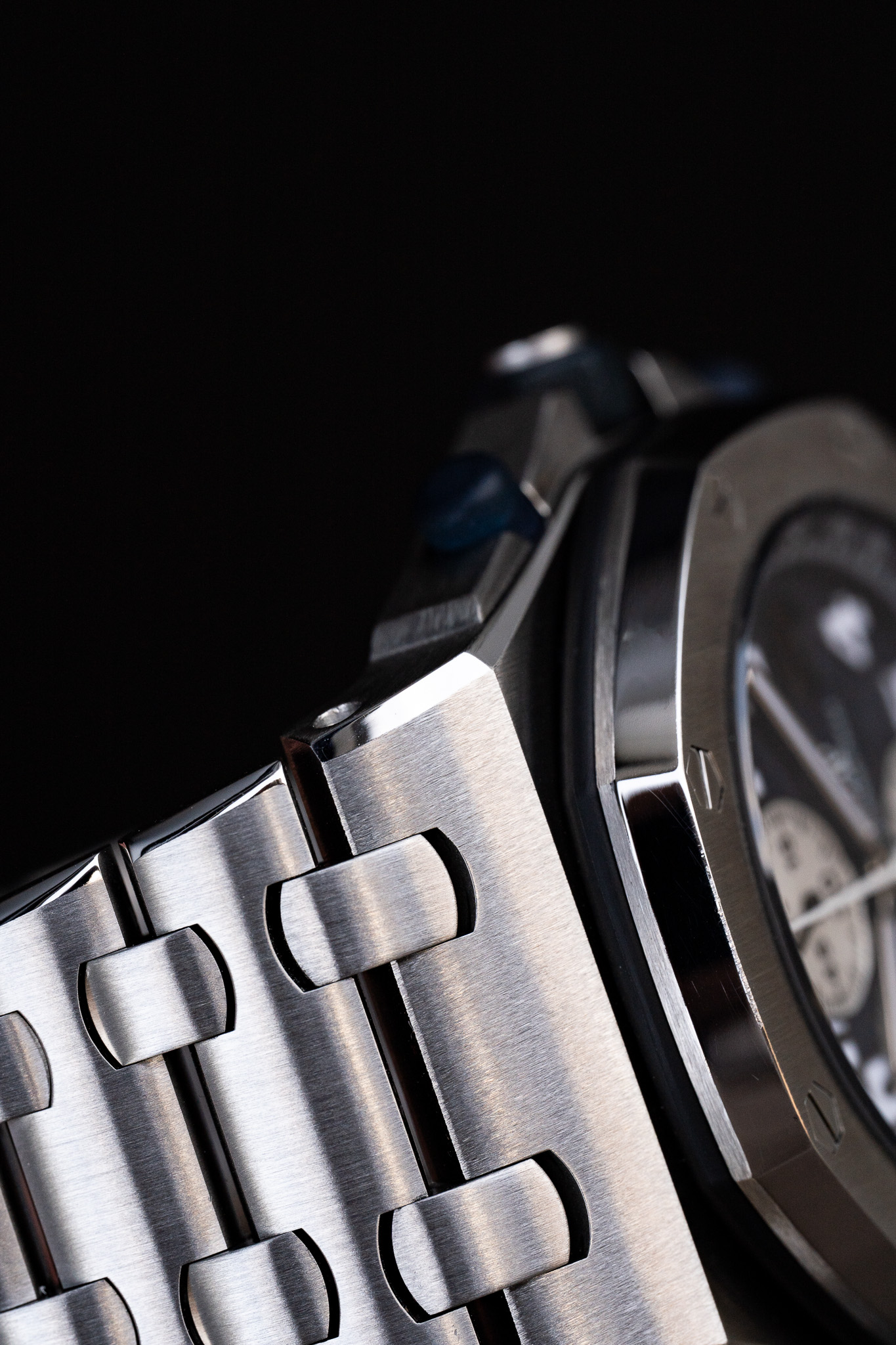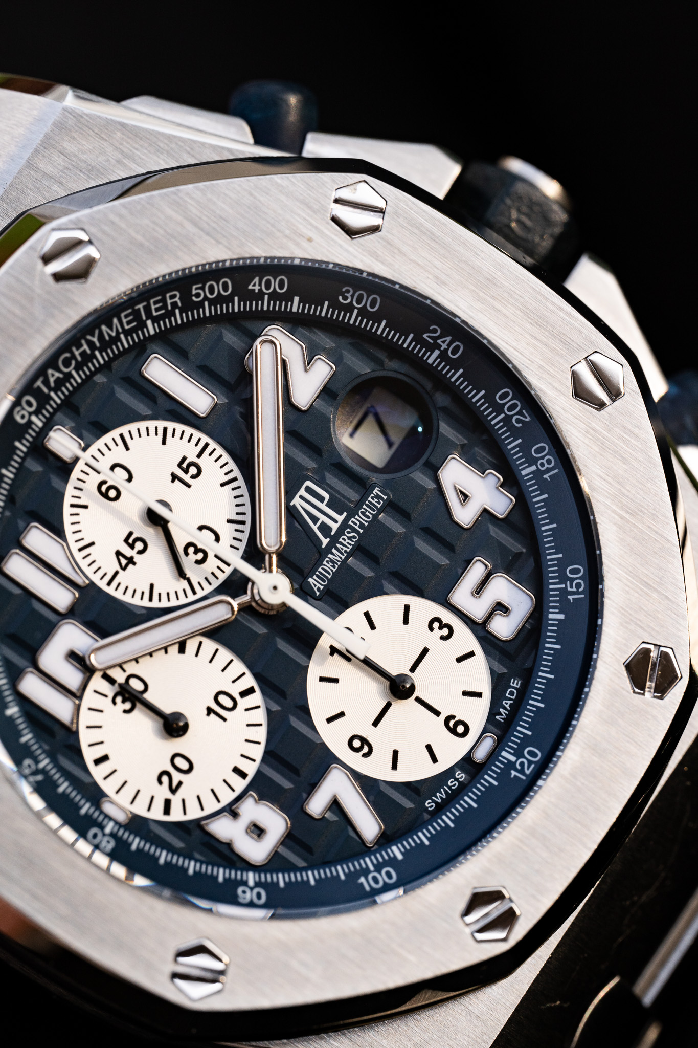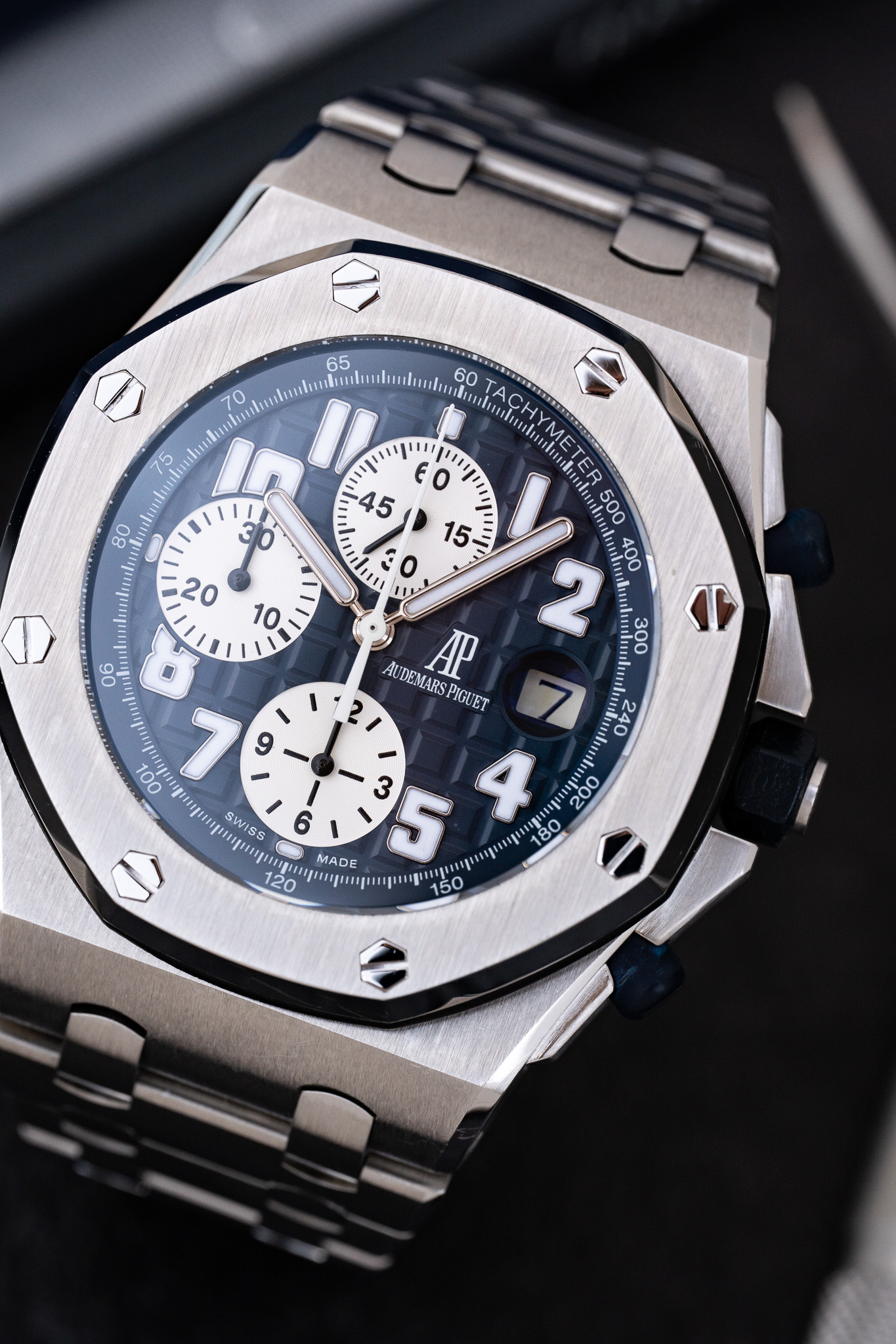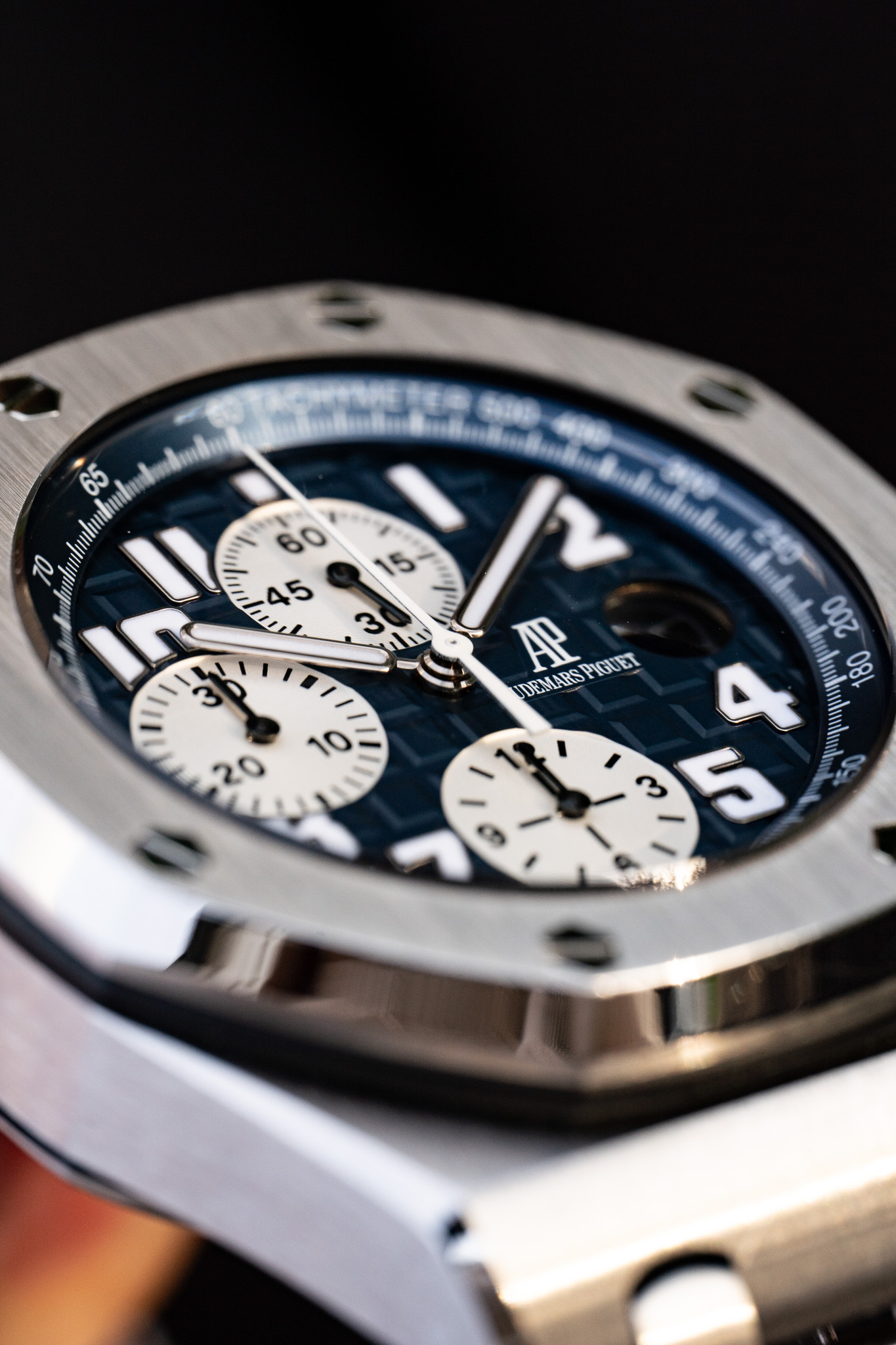 La référence 25721ST.OO.1000ST.09.A représente l’une des configurations les plus recherchées de cette première génération. Elle associe un boîtier de 42 mm en acier inoxydable à un cadran bleu profond au motif « Méga Tapisserie », signature visuelle forte de la ligne Offshore. Les trois compteurs du chronographe se détachent avec équilibre sur le cadran, tandis que les index appliqués et les aiguilles luminescentes assurent une lisibilité immédiate. La lunette octogonale en acier est fixée par huit écrous hexagonaux caractéristiques, tandis que les poussoirs du chronographe sont protégés par des éléments en caoutchouc, renforçant l’identité sportive du modèle.