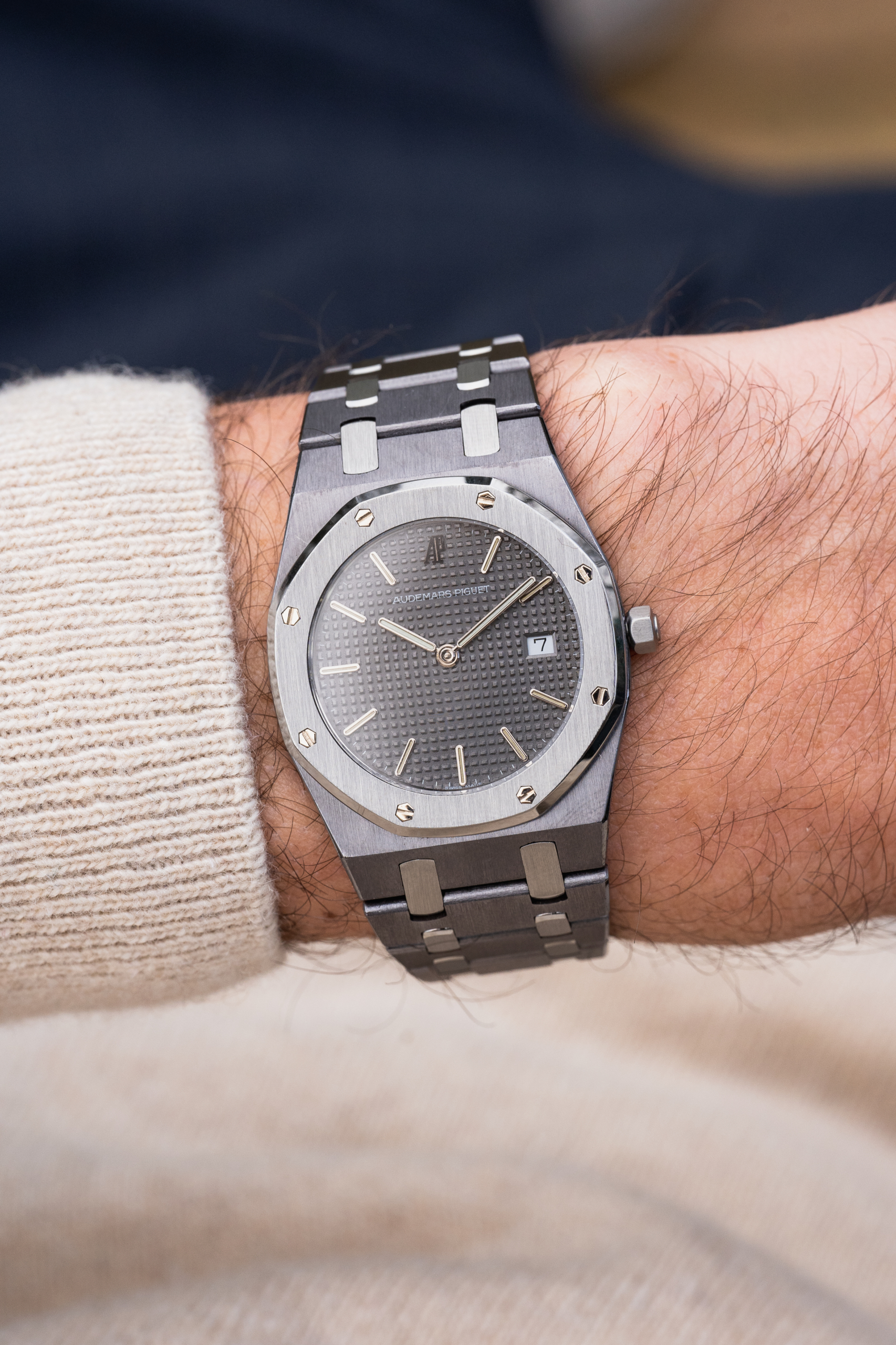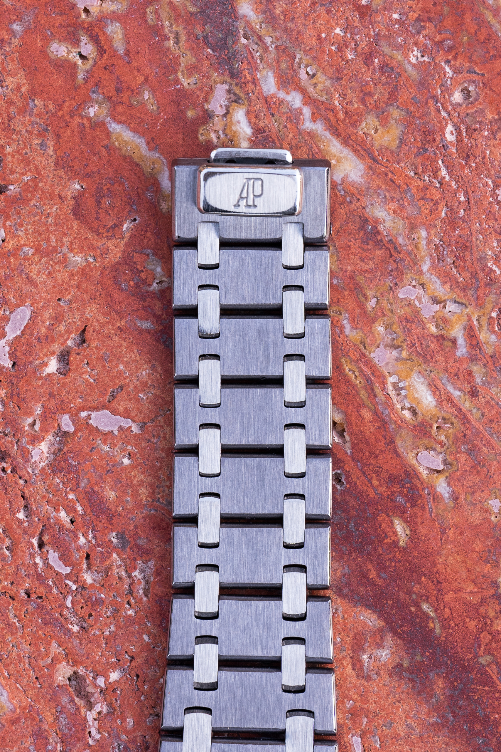- Another particularity of this Royal Oak is its thinness. With a thickness of 5.8mm, the 56175TT is the thinnest Royal Oak in the history of the brand, yet it retains a significant amount of mass given its thinness and its 33mm diameter, as tantalum has the particularity of having a density close to that of gold.