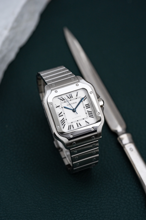 Santos watch, medium model, mechanical movement with automatic winding, calibre 1847 MC. Steel case, 7-sided crown set with a faceted synthetic spinel, silvered opaline dial, steel sword-shaped hands, sapphire crystal. Steel bracelet with “SmartLink” adjustment system. Second bracelet in calfskin, with interchangeable steel folding buckle. Both bracelets are fitted with the “QuickSwitch” interchangeability system. Case width: 35.1 mm, thickness: 8.83 mm. Water-resistant to 10 bar (approx. 100 metres).