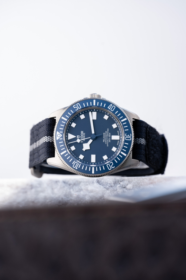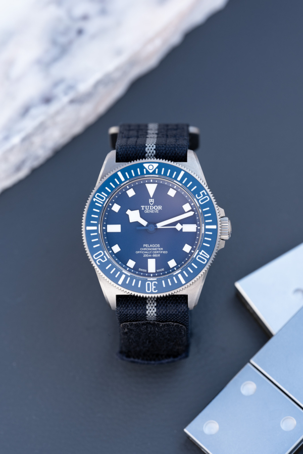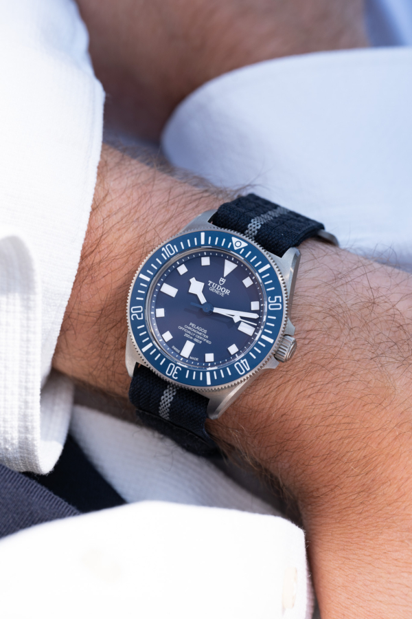 Le bracelet de la Pelagos FXD est tissé de manière artisanale sur des métiers Jacquard à navette du XIXème siècle par une entreprise implantée en France dans la région de Saint-Etienne. Sa qualité de facture, sa robustesse et son confort au porté sont uniques. Il est le résultat d’une nouvelle construction très technique de bracelet développée spécifiquement par TUDOR pour s’adapter à la rusticité du travail des plongeurs de la Marine nationale. Composé d’un ruban bleu marine en polyéthylène tissé de 22mm avec filet central argenté, d’une boucle « D » en titane et d’un système d’attache auto-grippant, il s’adapte à différentes tailles de poignet tout en offrant un grand confort d’utilisation.
