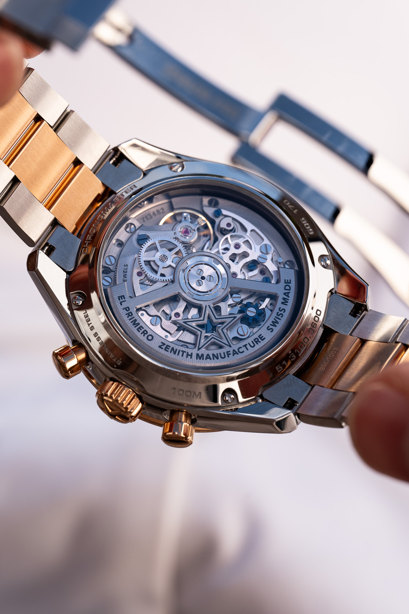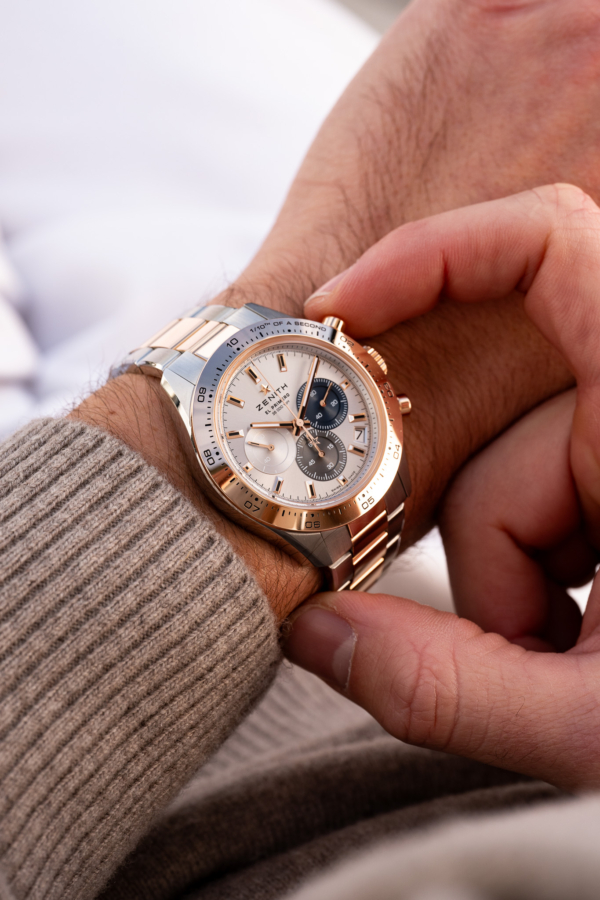 Ce digne descendant de la lignée des Chronomaster présente un boîtier en acier de 41 mm de large, élégant, robuste et magnifiquement proportionné, avec des poussoirs de type piston. Il est animé par le nouveau calibre haute fréquence El Primero 3600, plus performant et précis que jamais. Doté d’une réserve de marche de 60 heures, le mécanisme et son architecture saisissante peuvent être admirés à travers le fond saphir révélant une roue à colonnes bleue et un rotor ajouré marqué de l’étoile Zenith à cinq branches. Le nouveau Chronomaster Sport est la seule montre à disposer d’un affichage au 1/10e de seconde gravé directement sur sa lunette en or rose polie et graduée. L’exceptionnelle lisibilité assurée par les effets de contraste se poursuit sur le cadran argenté particulièrement raffiné portant les compteurs tricolores distinctifs du chronographe El Primero en bleu, anthracite et gris clair, chacun gradué à 60 pour une lecture intuitive. Cette nouveauté singulière se part d’un bracelet en acier et or rose très confortable, doté d’une boucle déployante en acier inoxydable.
