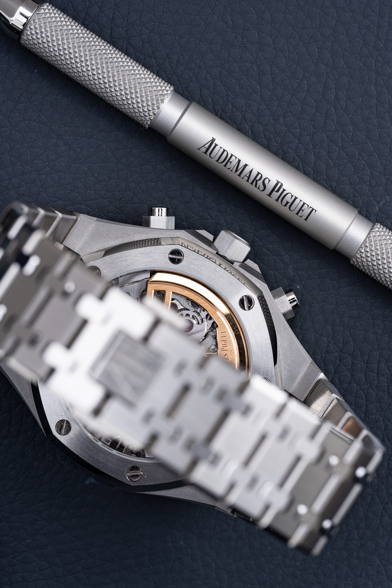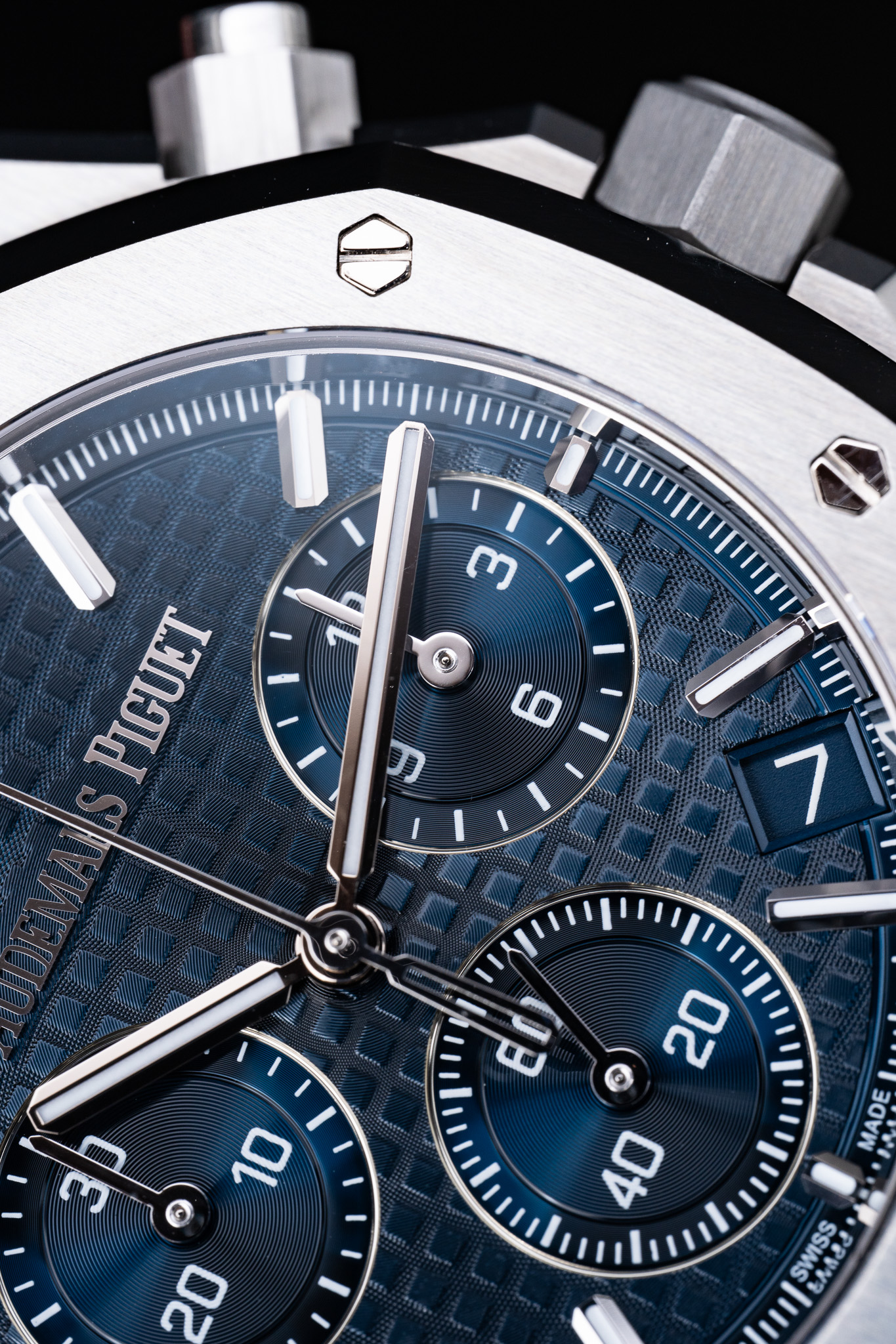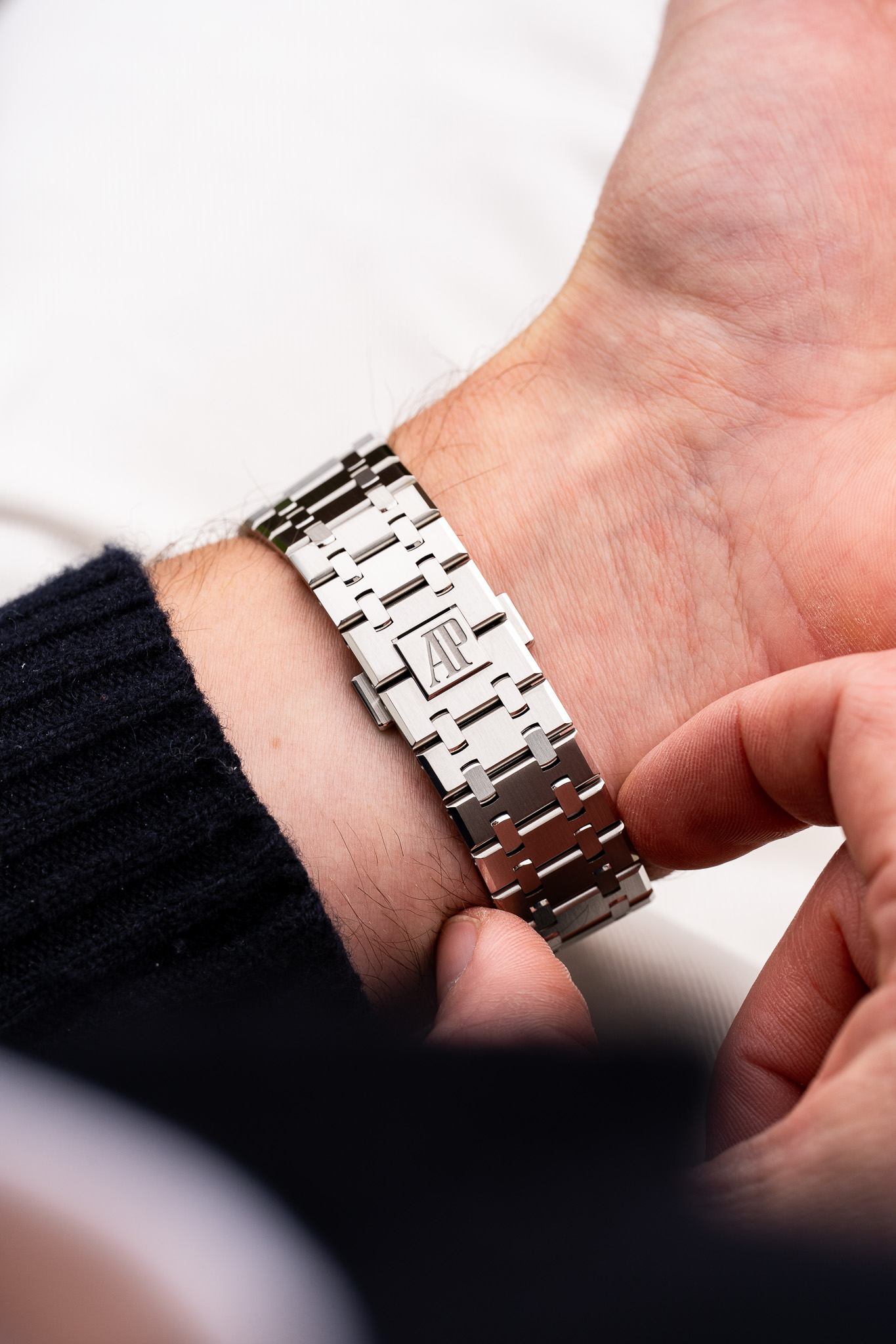 Le boîtier en acier inoxydable de 41 mm reprend les proportions emblématiques de la collection tout en affichant une ergonomie retravaillée, notamment au niveau du bracelet intégré, plus fluide et mieux ajusté au poignet. Le travail de finition est exemplaire, alternant surfaces satinées et angles polis miroir, signature incontestable de la Royal Oak.