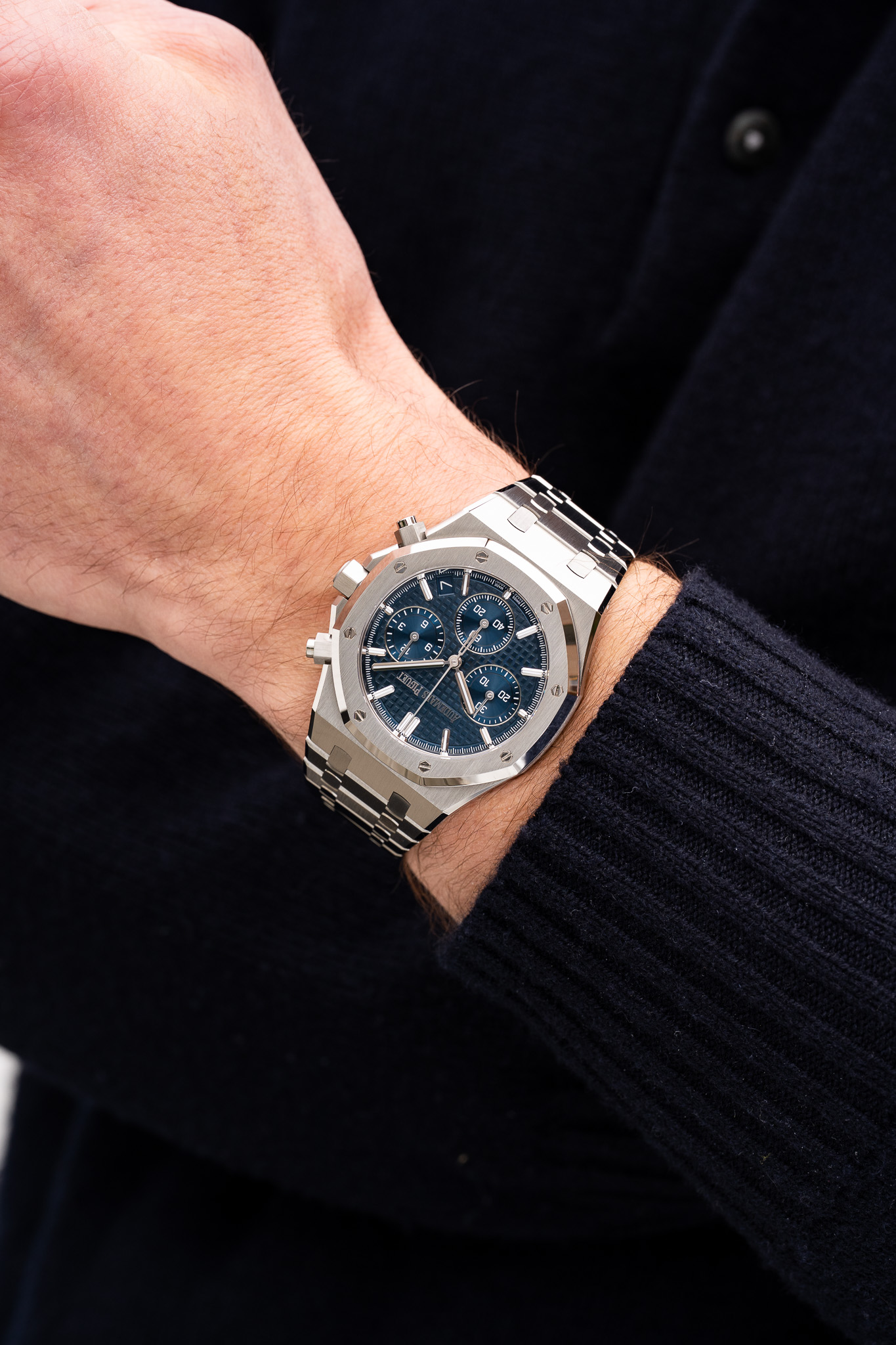 Expression contemporaine d’un grand classique, la Royal Oak Chronographe 41 mm référence 26240ST.OO.1320ST.05 incarne toute la maîtrise esthétique et technique d’Audemars Piguet. Dans cette version introduite en 2022 à l’issue des 50 ans de la Royal Oak, la manufacture de Le Brassus propose une déclinaison aussi moderne que raffinée, avec un cadran bleu nuit « Grande Tapisserie ».