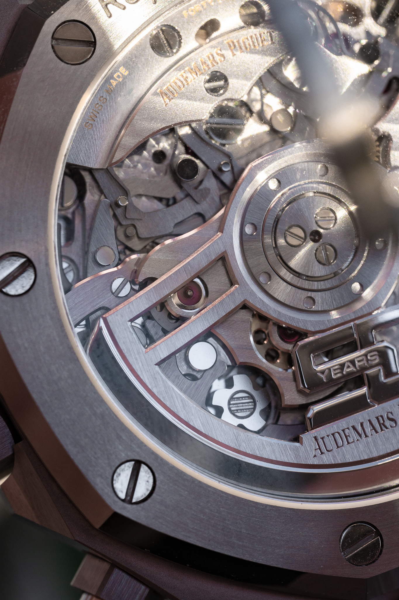 Mais c’est à l’intérieur que l’évolution la plus marquante s’opère. Pour la première fois, un chronographe Royal Oak est animé par le calibre maison 4401, entièrement développé et intégré par Audemars Piguet. Ce mouvement automatique flyback avec roue à colonnes et embrayage vertical représente un tournant dans l’histoire technique de la manufacture. Il garantit un déclenchement fluide, une excellente précision et une réserve de marche de 70 heures. Visible à travers un fond saphir, il se distingue ici par une masse oscillante “50 years”, gravée spécialement pour l’anniversaire.