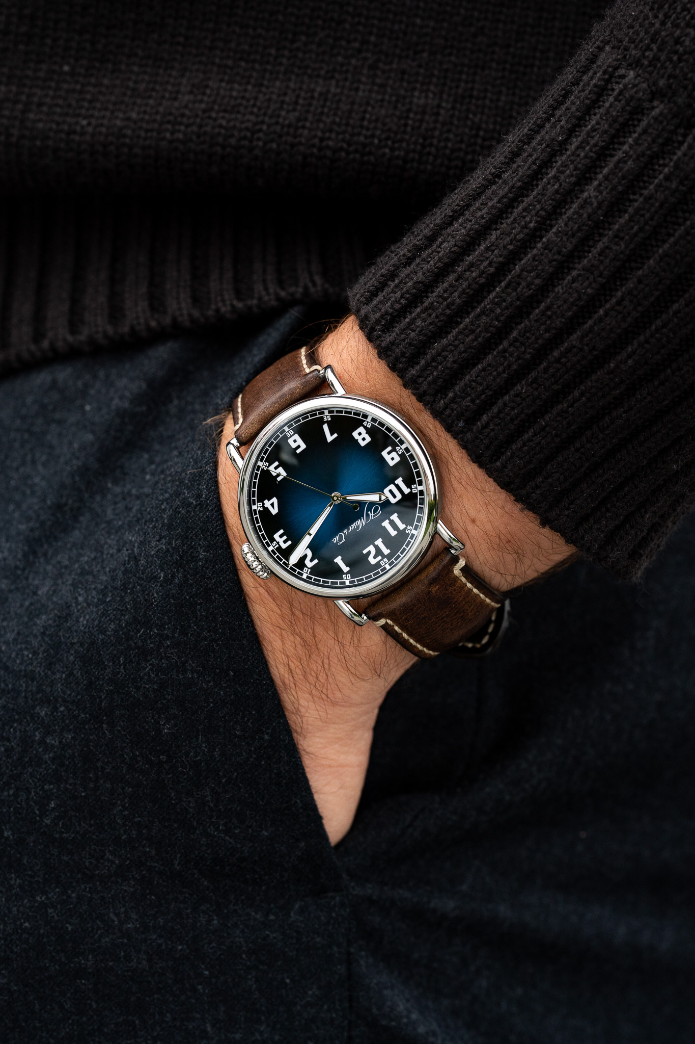 Le boîtier en acier de 42 mm, aux finitions polies miroir, présente des lignes volontairement simples mais habitées d’une belle tension. Les cornes fil effilées, signature de la collection Heritage, apportent au poignet une élégance presque néoclassique. La couronne cannelée, surdimensionnée, évoque l’univers des montres anciennes, tout en renforçant la facilité de manipulation. À l’arrière, un fond saphir dévoile le mouvement, laissant dialoguer l’hommage au passé et l’exécution contemporaine.