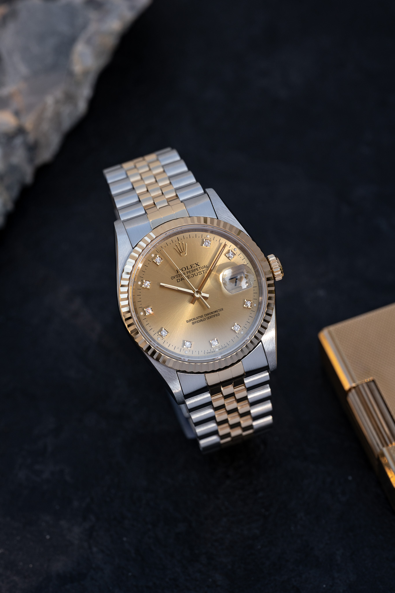 Une lunette cannelée, une loupe de date et cette combinaison si familière d’acier inoxydable et d’or jaune. La Rolex Datejust référence 16233 est l’incarnation même d’une icône Rolex. Sortie en 1945, lancée pour le 40e anniversaire de la marque, la Datejust reste l’une des Rolex les plus populaires et les plus reconnaissables de la planète. Ce qui a d’abord attiré l’attention à l’époque, c’est la date sautante brevetée de la marque, qui bascule instantanément au lieu de prendre les dernières heures de la nuit pour passer d’un jour à l’autre. Bien qu’ils n’aient pas été présents sur le premier modèle, ces trois détails clés ont été ajoutés au modèle Datejust dans les années cinquante et sont restés au cœur de son design depuis lors.