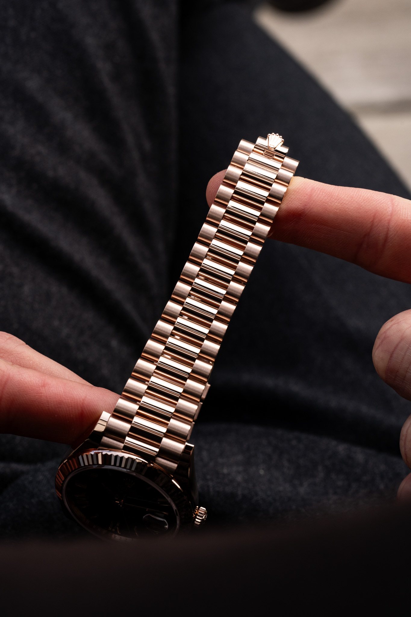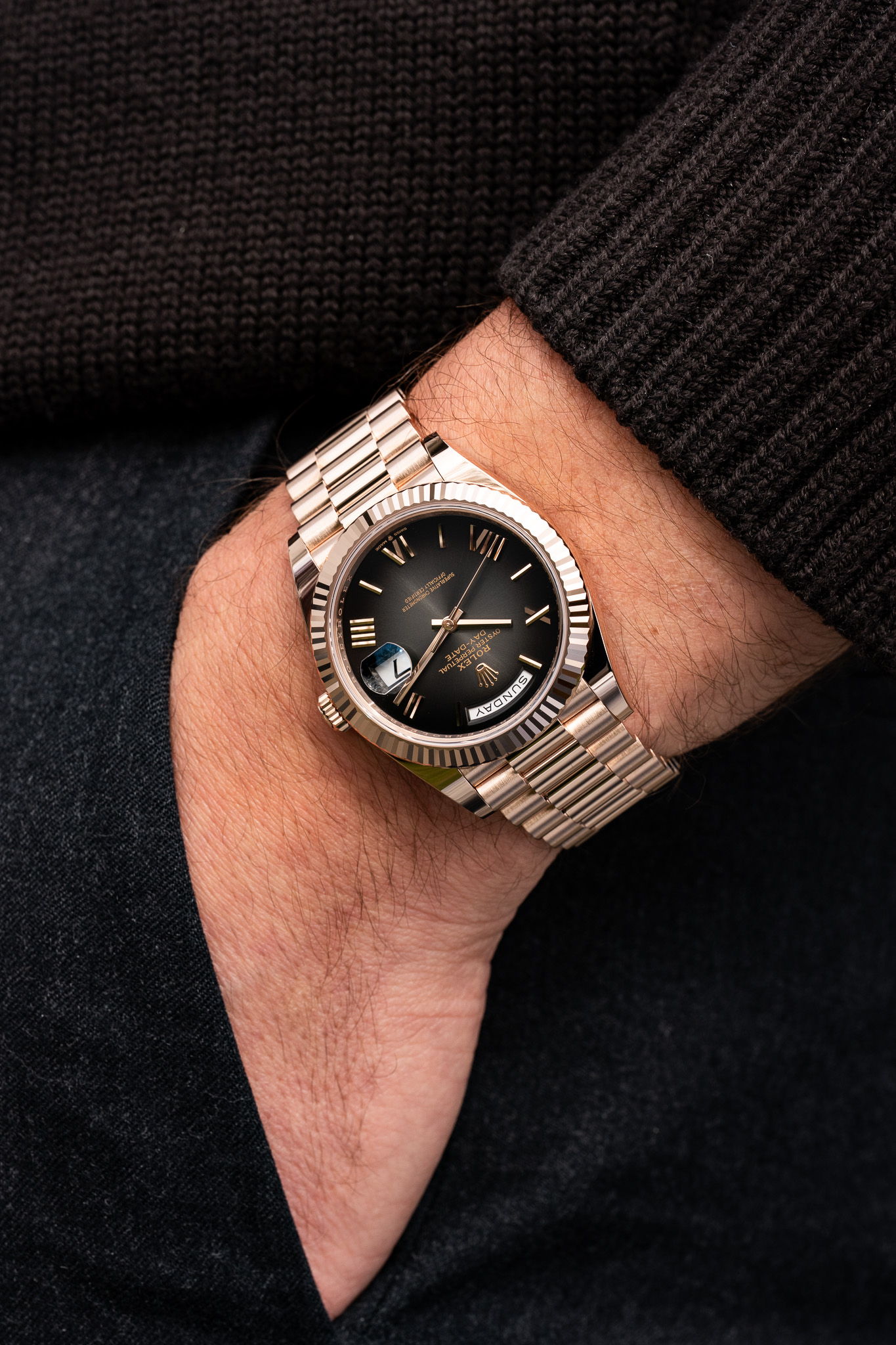 Le cadran ombré confère à cette pièce une présence singulière et résolument contemporaine. Sa teinte, plus claire en son centre et progressivement assombrie vers l’extérieur, crée un effet de profondeur subtil et captivant. Ce dégradé maîtrisé met en valeur les index appliqués ainsi que les aiguilles, tout en apportant une lecture nuancée et vivante selon la lumière. L’affichage du jour à midi et de la date à 3 heures, agrandie par la loupe Cyclope, conserve toute la lisibilité et l’identité iconique de la Day-Date.