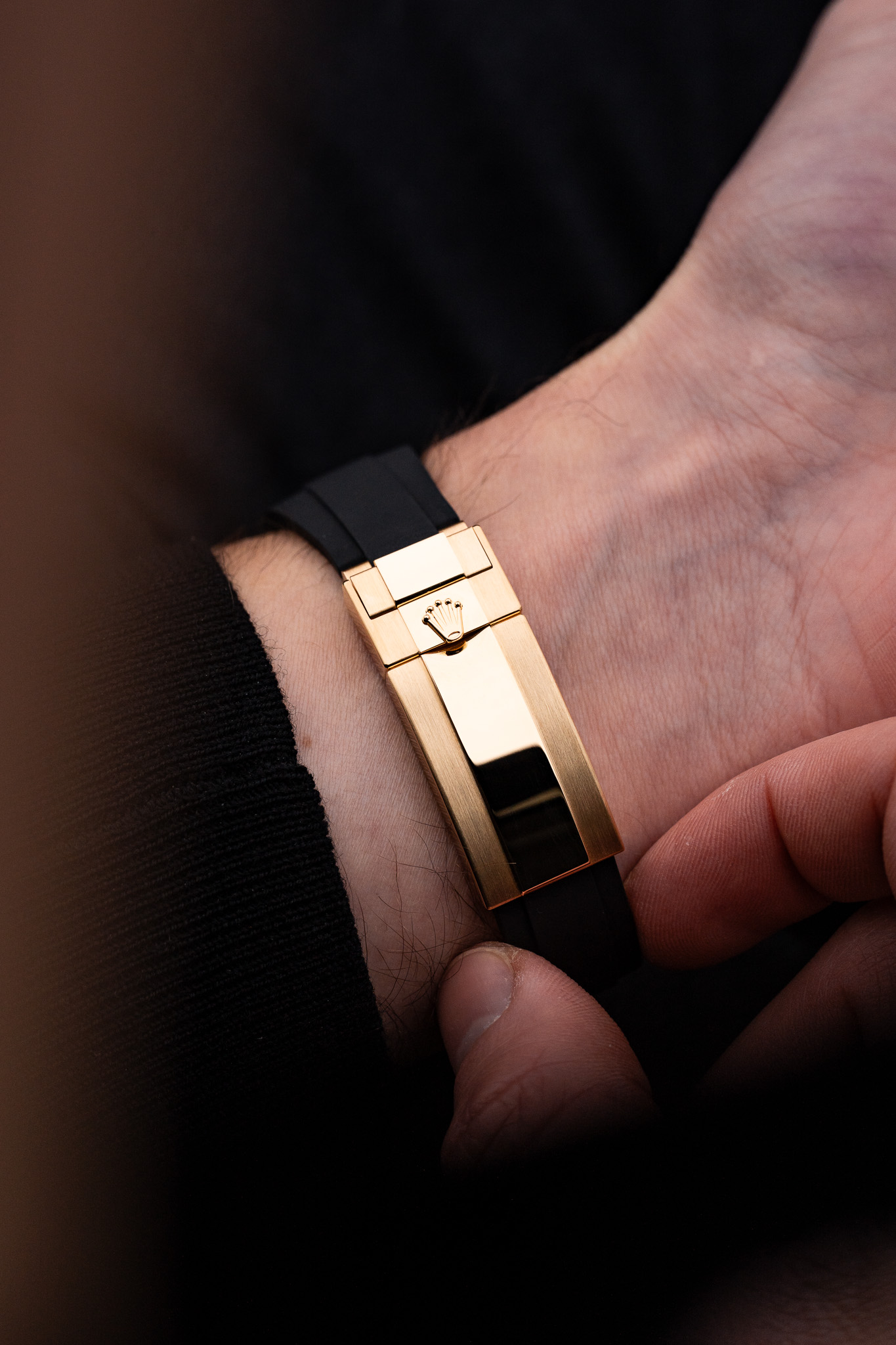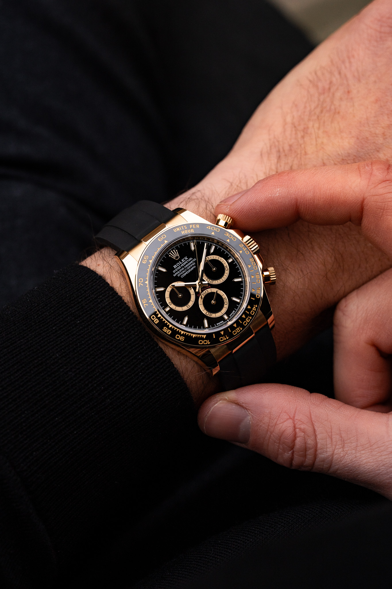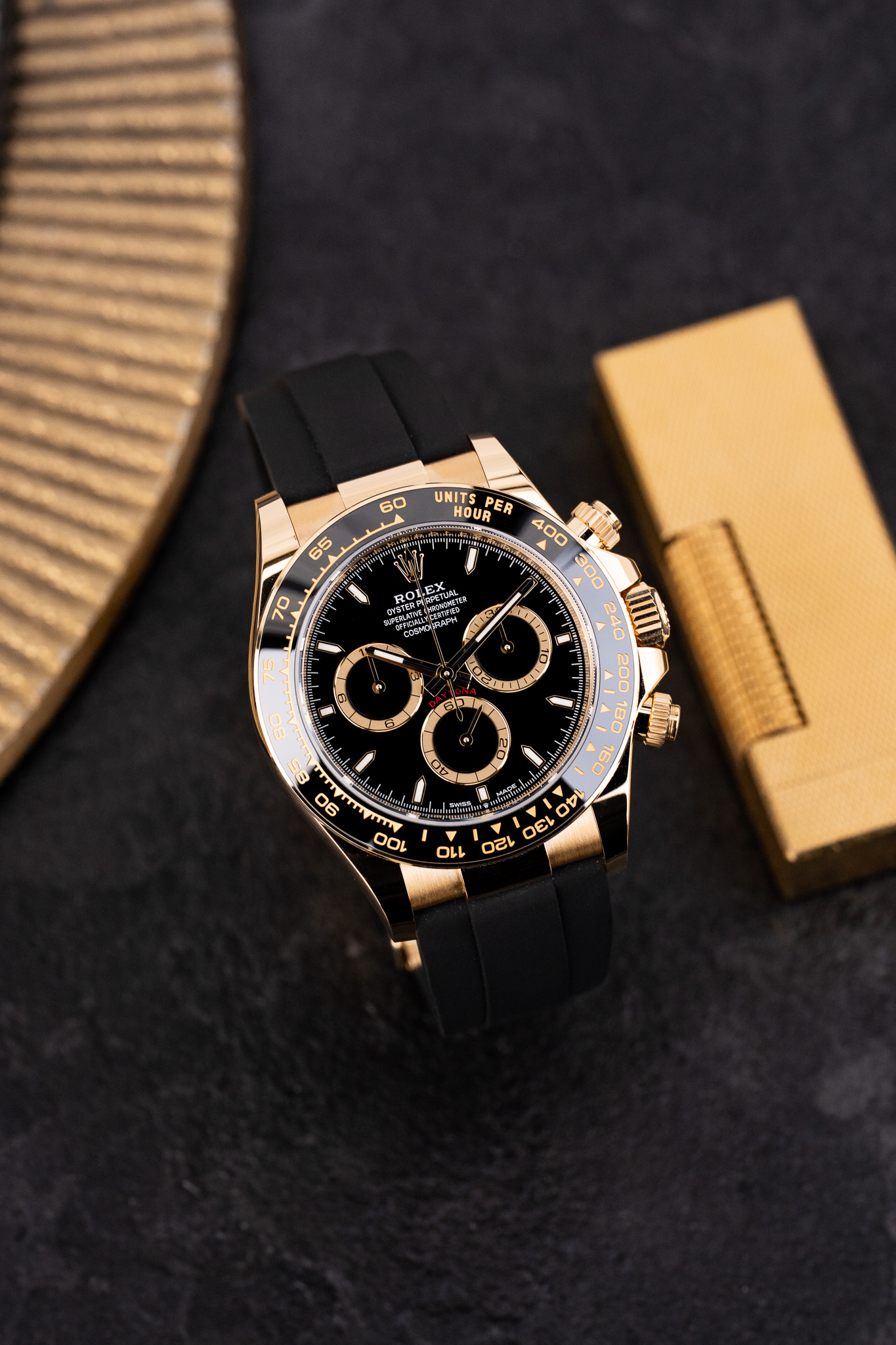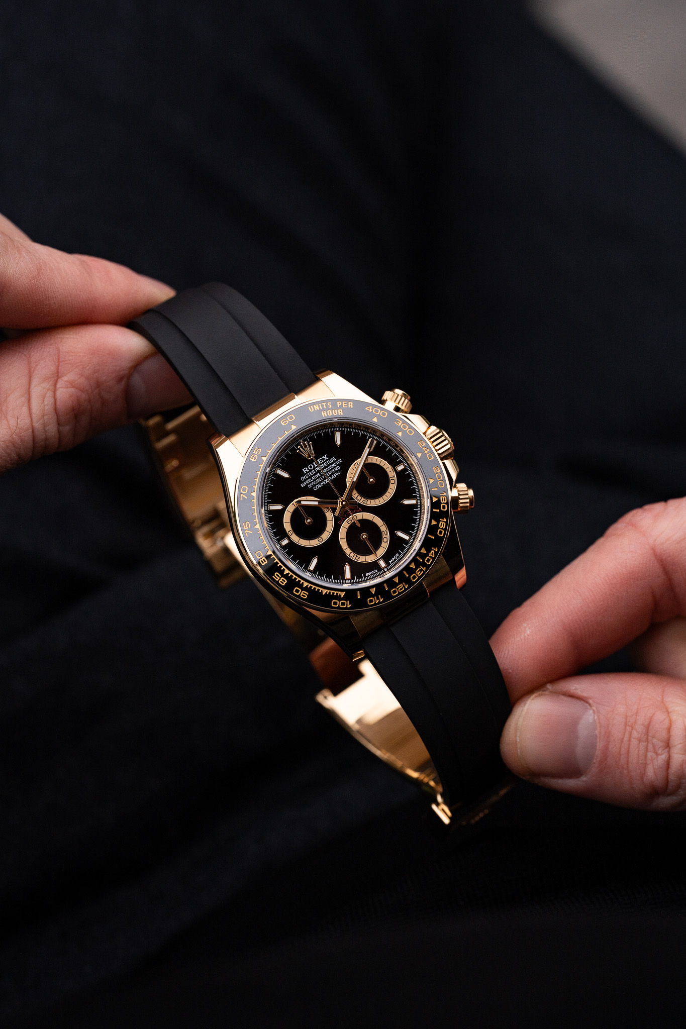 Le boîtier de 40 mm est réalisé en or jaune 18 ct, avec des finitions alternant surfaces polies et satinées selon les codes Rolex les plus exigeants. La lunette Cerachrom noire en céramique, gravée d’une échelle tachymétrique, crée un contraste marqué avec la chaleur de l’or et renforce le caractère sportif du modèle. Cette combinaison confère à la montre une présence affirmée, sans excès.