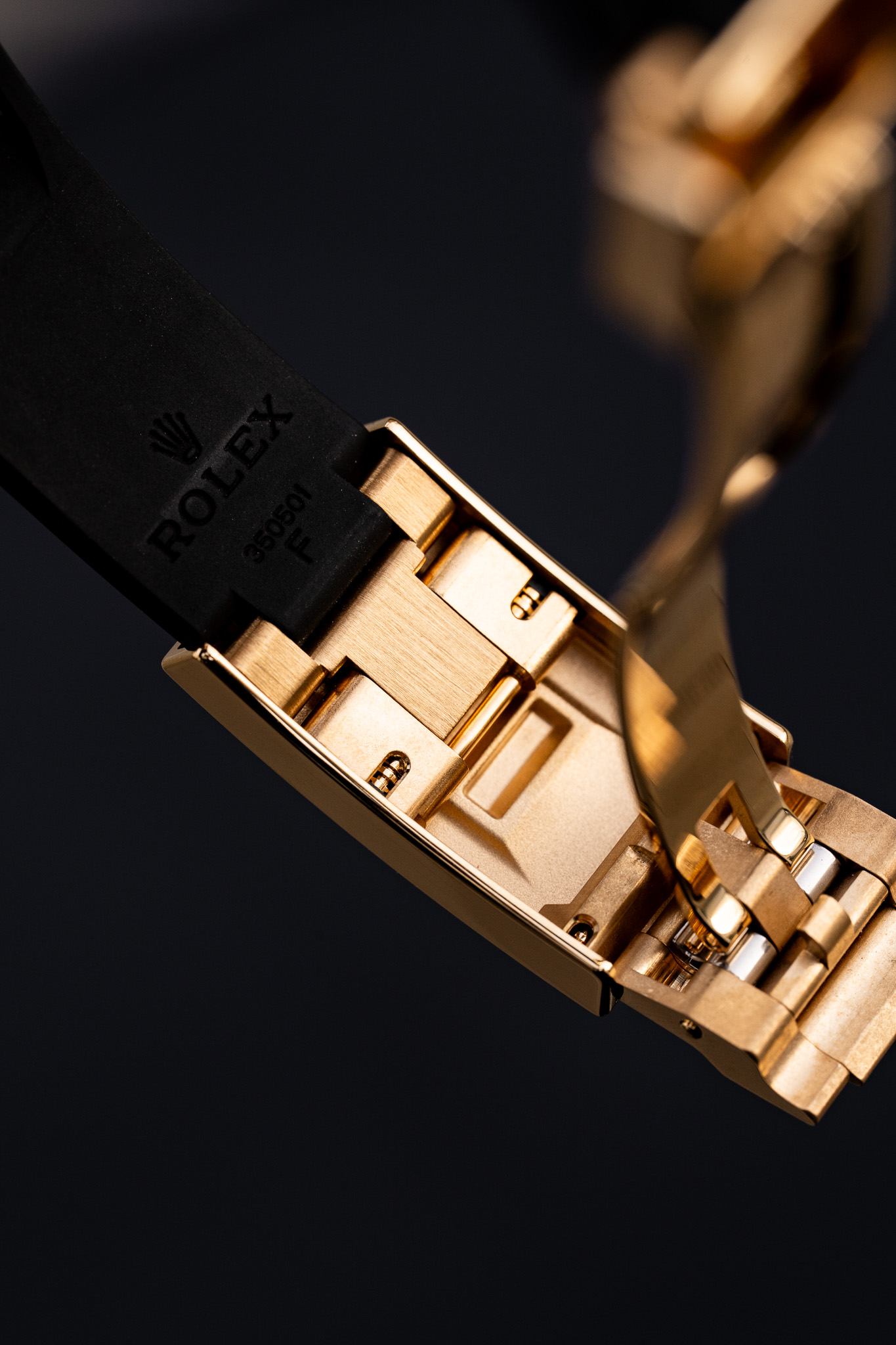Cette version est montée sur le bracelet Oysterflex, composé d’une lame métallique flexible surmoulée d’élastomère haute performance. Il combine la robustesse d’un bracelet métallique à la légèreté et au confort d’un bracelet en caoutchouc, tout en conservant l’élégance d’une montre en or grâce à sa boucle déployante Oysterlock en or jaune.