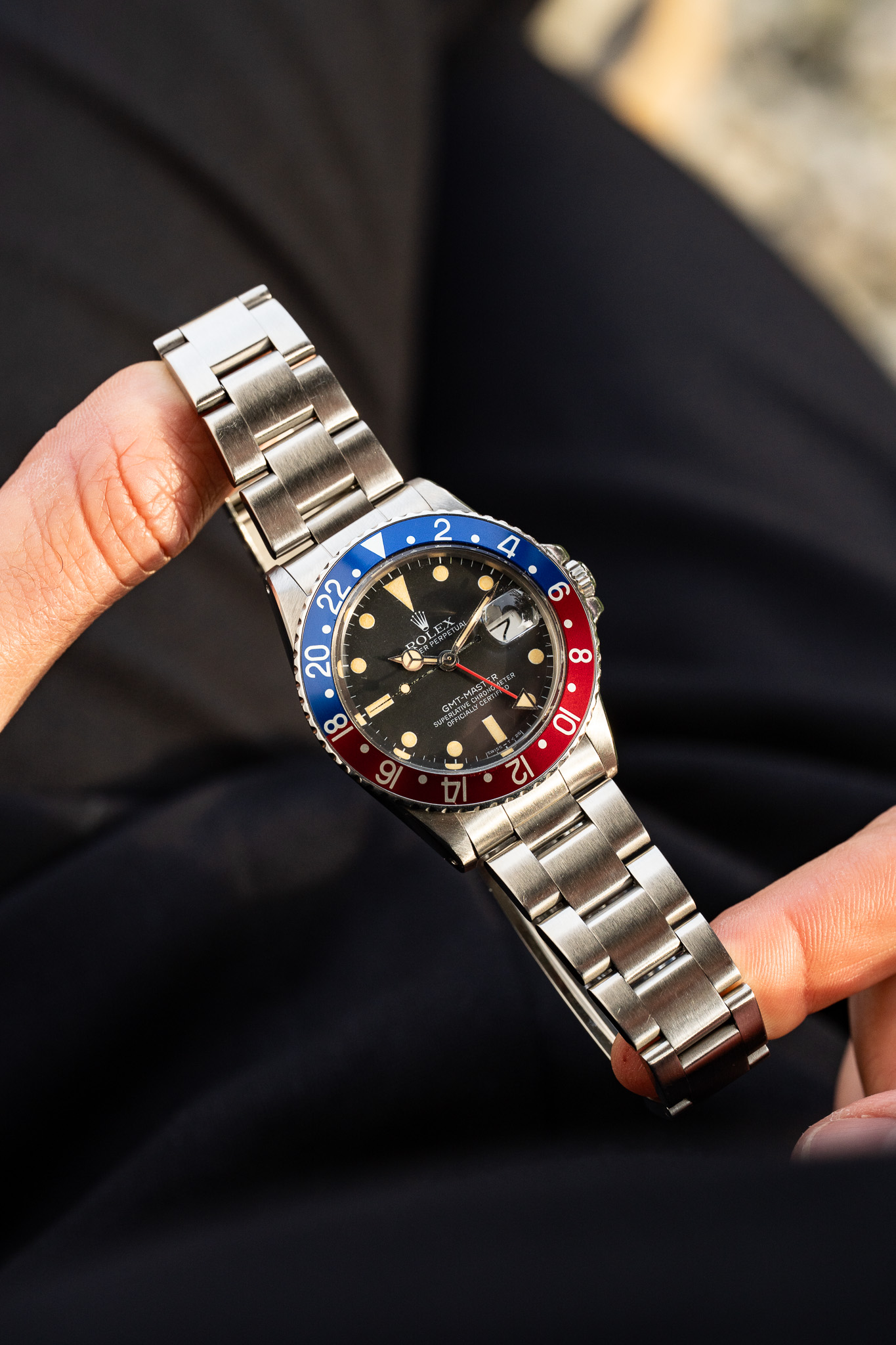 La Rolex GMT-Master référence 16750 occupe une place importante dans l’histoire des montres d’aviation. Introduite à la fin des années 1970, elle représente une période de transition pour la ligne GMT-Master, intégrant les avancées technologiques tout en préservant les éléments de design emblématiques qui ont rendu la lunette « Pepsi » légendaire. Exsudant charme et caractère, avec son boîtier en acier inoxydable de 40 mm présentant une patine distinguée qui raconte l’histoire de son voyage à travers le temps, et l’emblématique lunette » Pepsi » rouge et bleue, fabriquée en aluminium, magnifiquement patinée, ajoute une touche vibrante à la montre, rappelant l’esprit pionnier de Rolex dans la création de garde-temps fonctionnels et élégants pour les globe-trotters.