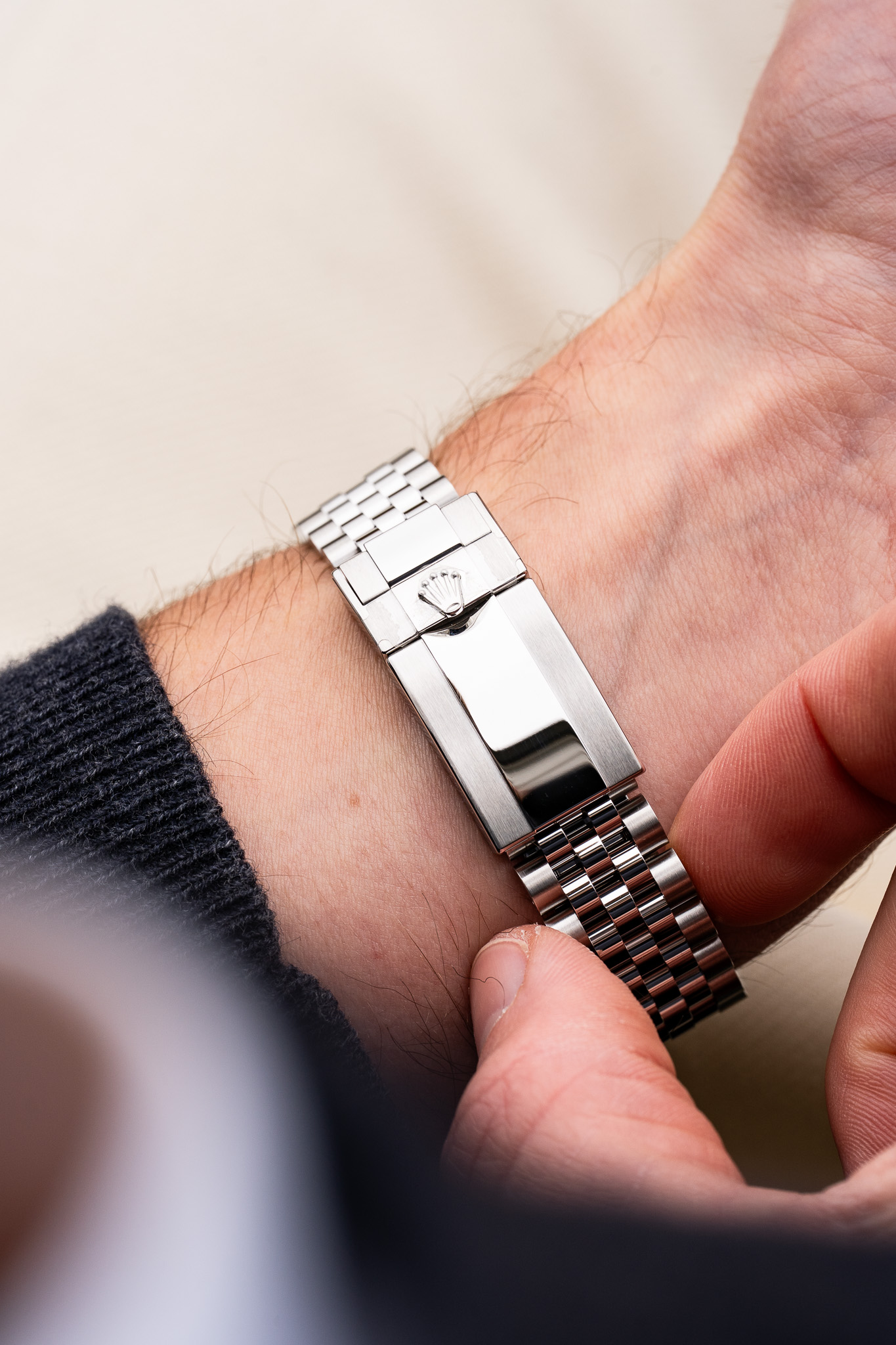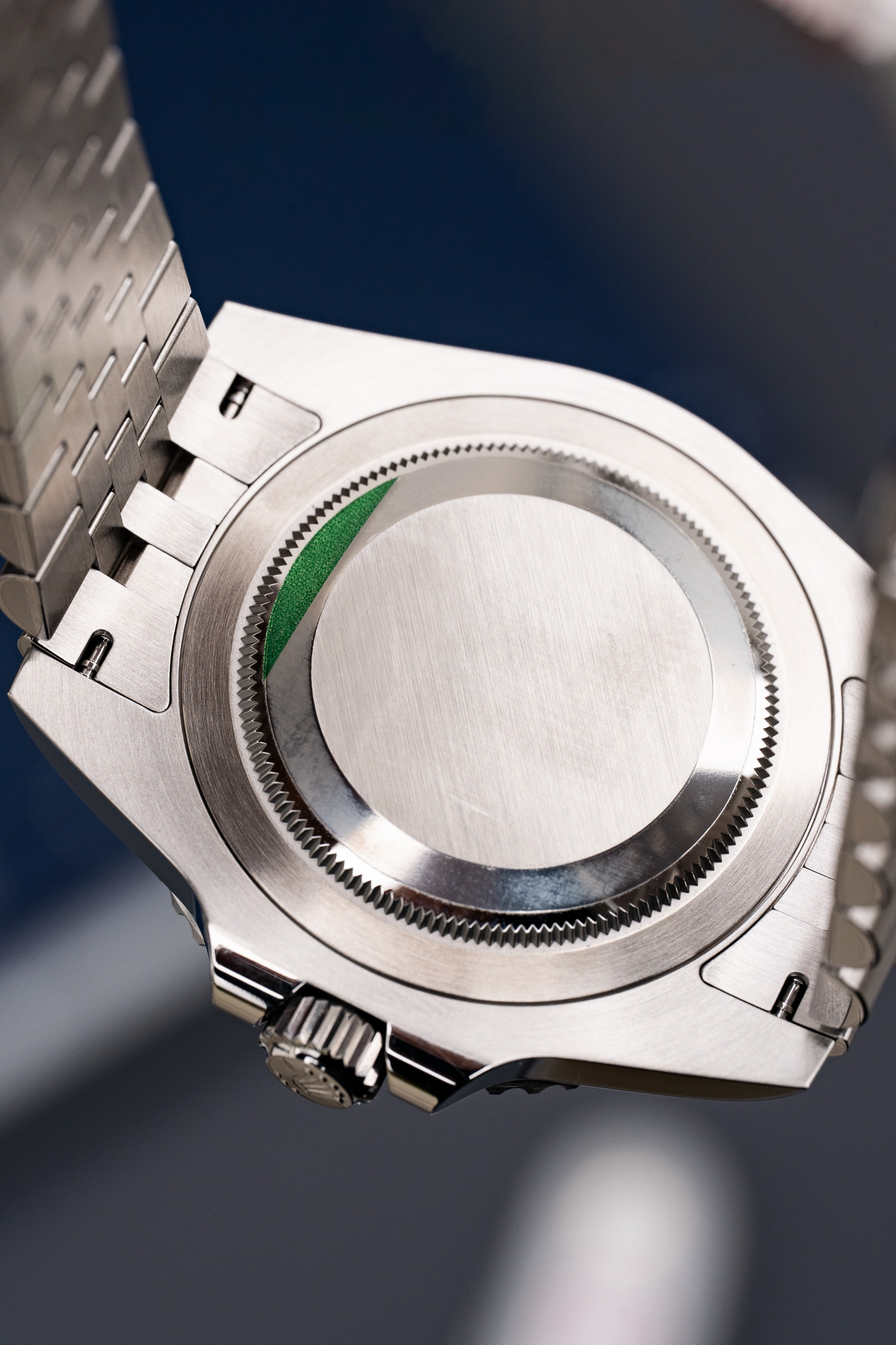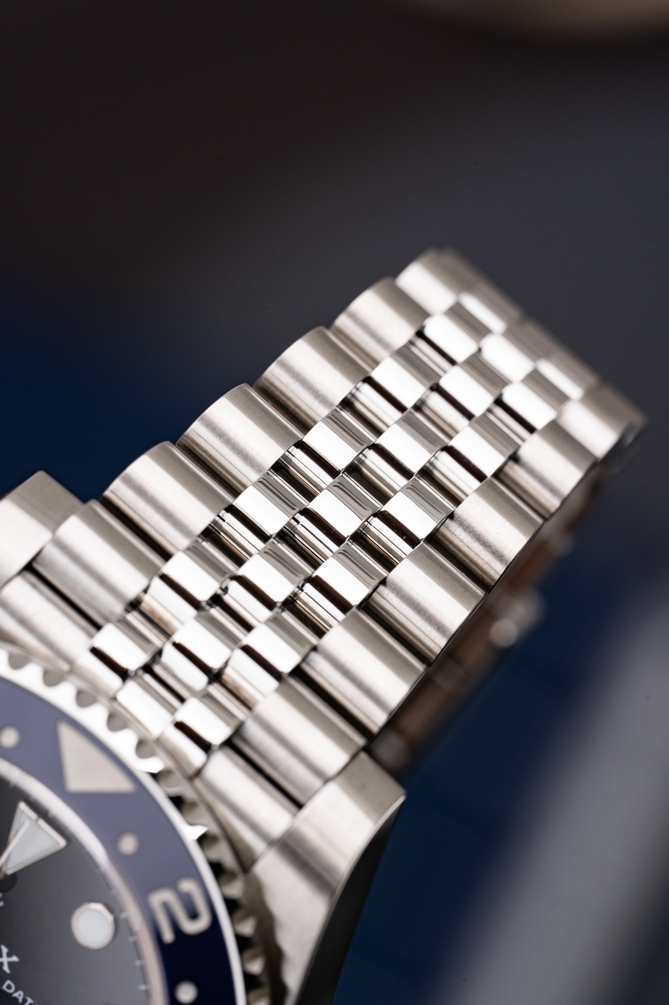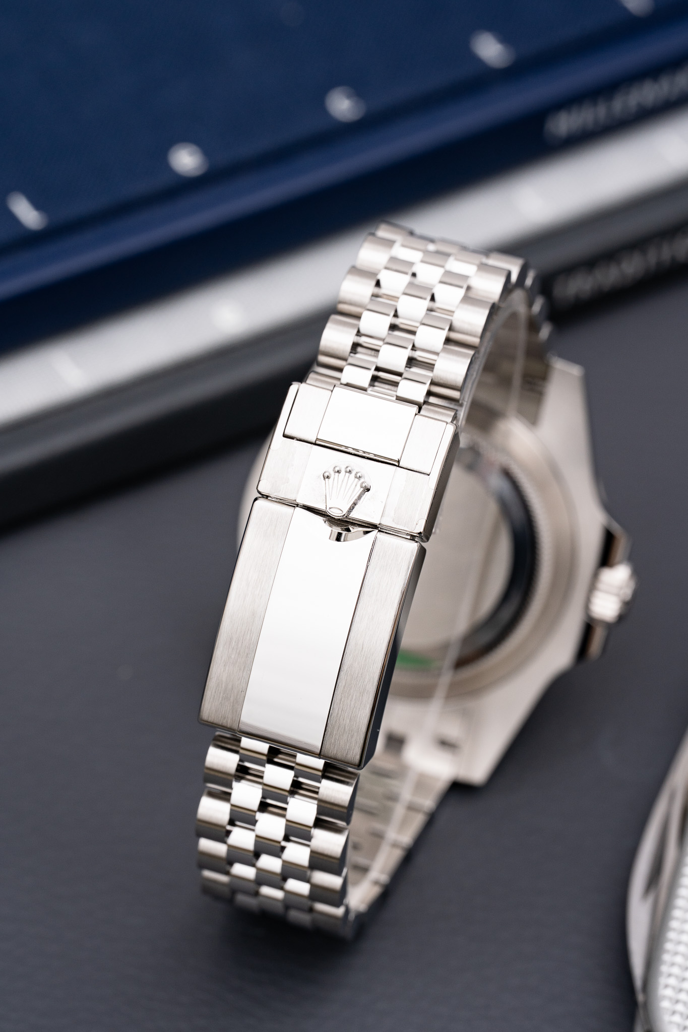 La montre est équipée du calibre Rolex 3285, un mouvement qui a établi la norme de l’industrie en matière de précision et de fiabilité. La fonction GMT permet au porteur de suivre deux fuseaux horaires simultanément, ce qui en fait un outil essentiel pour les voyageurs et les professionnels.