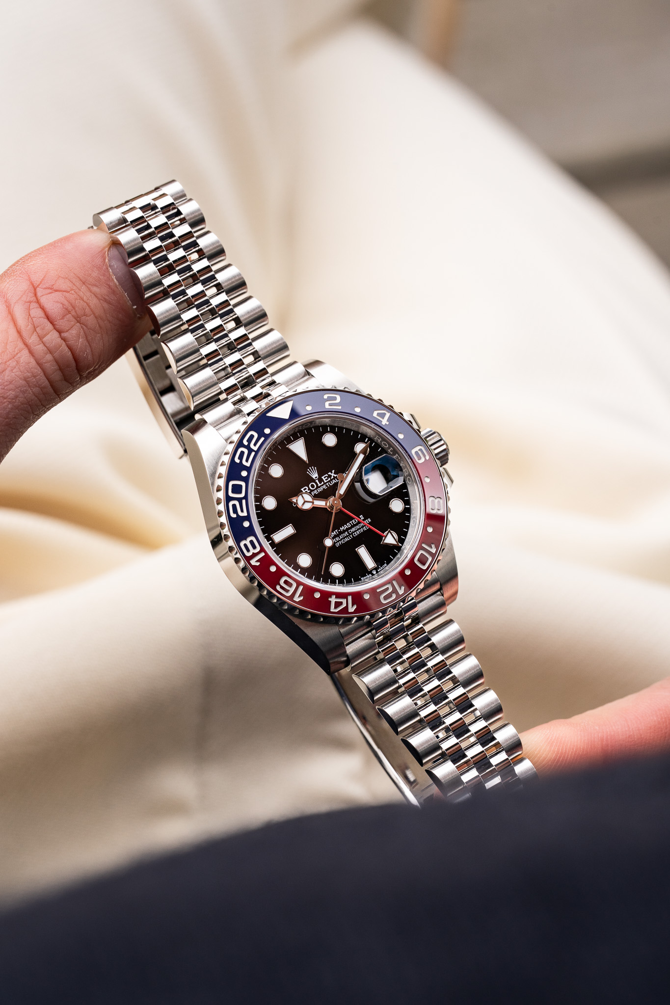 La gamme GMT-Master a été initialement introduite en 1954 en collaboration avec Pan American Airways. Conçue pour les pilotes professionnels, la GMT-Master leur permettait de suivre simultanément deux fuseaux horaires, une caractéristique essentielle pour naviguer à travers plusieurs destinations internationales. Le modèle original, la référence 6542, comportait une lunette en bakélite rouge et bleue, jetant ainsi les bases de l’emblématique palette de couleurs Pepsi.