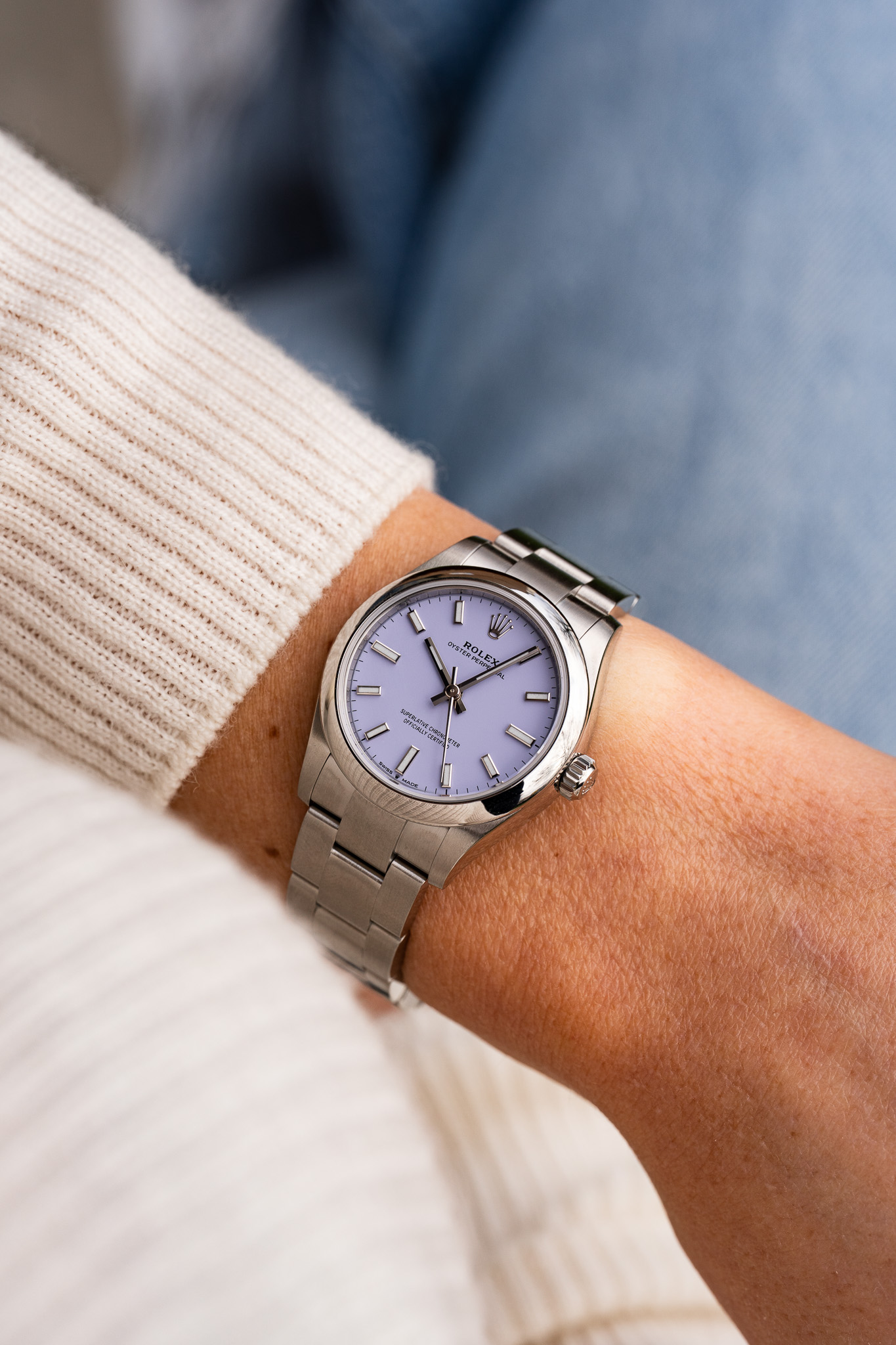 Cette Oyster Perpetual 31 se distingue par son cadran Lavender, une teinte délicate et subtile qui joue avec la lumière de manière remarquable. Ni pastel ni saturé, ce violet clair offre une présence douce et moderne, tout en restant parfaitement lisible. Selon l’éclairage, le cadran oscille entre des nuances poudrées et des reflets plus froids, conférant à la montre une personnalité singulière et immédiatement reconnaissable.