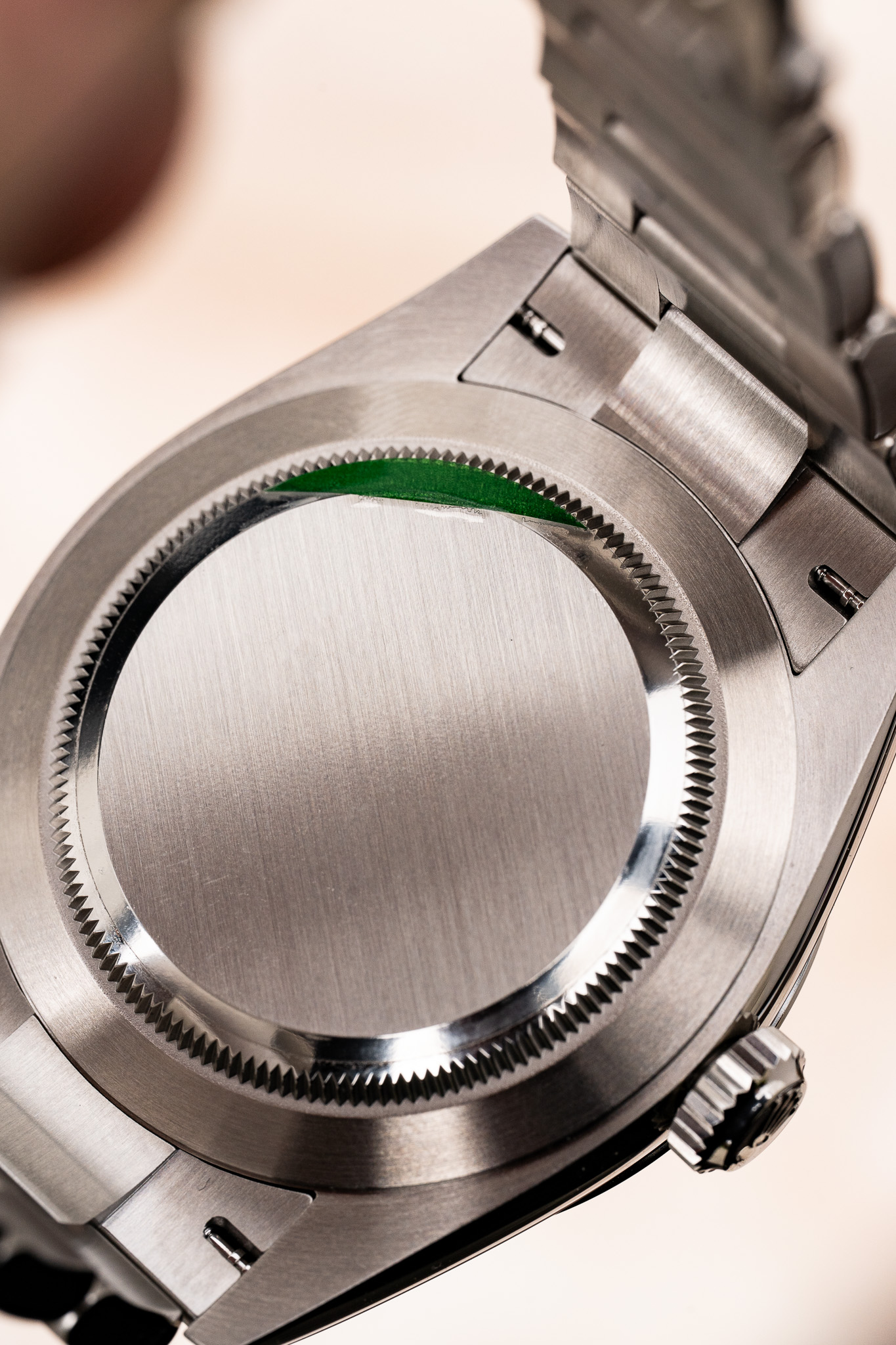 Le boîtier de 41 mm en Oystersteel joue l’alternance des surfaces polies et satinées. La lunette bombée souligne la rondeur maîtrisée du dessin, les cornes tendues assurent une présence équilibrée, la couronne vissée Twinlock garantit l’étanchéité à 100 mètres. La glace saphir protège un cadran laqué uniforme, dont la texture lisse capte la lumière sans éclat excessif. Les index et aiguilles, façonnés en or blanc 18 ct, sont remplis de Chromalight pour une lisibilité nette, de jour comme de nuit. La typographie discrète et le chemin de minutes précis rappellent la vocation fondamentale de l’Oyster Perpetual, une montre-instrument dépouillée, construite pour durer et pour être portée.