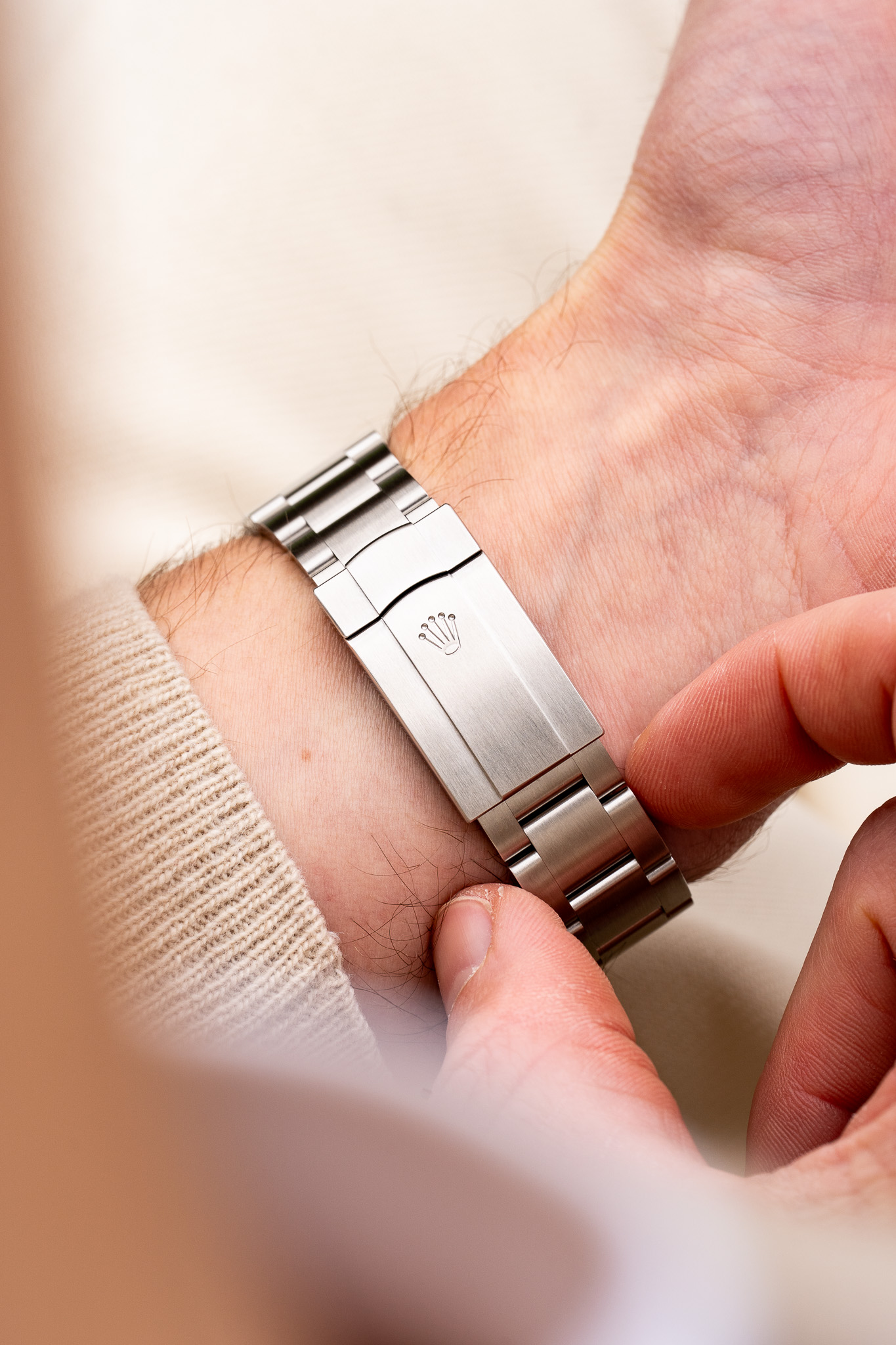 A son coeur, le calibre 3230 anime la pièce avec la dernière génération de solutions techniques de la marque, échappement Chronergy, spiral Parachrom bleu, barillet optimisé. Certifié Superlative Chronometer, il offre environ 70 heures de réserve de marche et une précision annoncée à −2, +2 secondes par jour, gages de fiabilité au quotidien. Le bracelet Oyster en acier, trois maillons, associe solidité et confort. Le fermoir Oysterclasp intègre l’extension Easylink de 5 mm, pratique pour ajuster la montre au fil de la journée. Au poignet, l’ensemble se fait discret et présent à la fois, une montre polyvalente qui passe sans effort d’un registre décontracté à une tenue plus habillée.