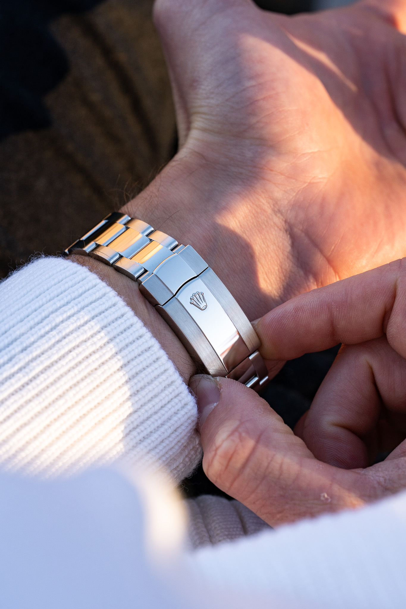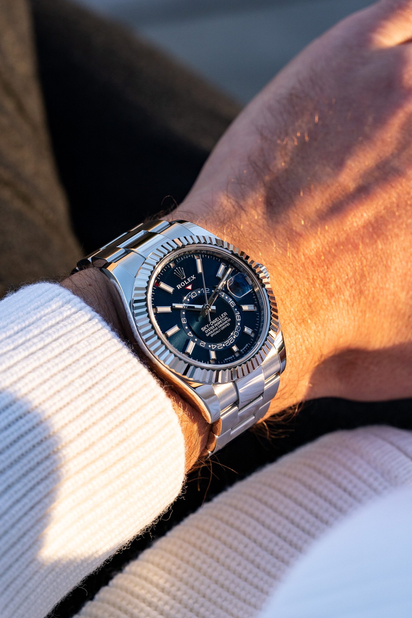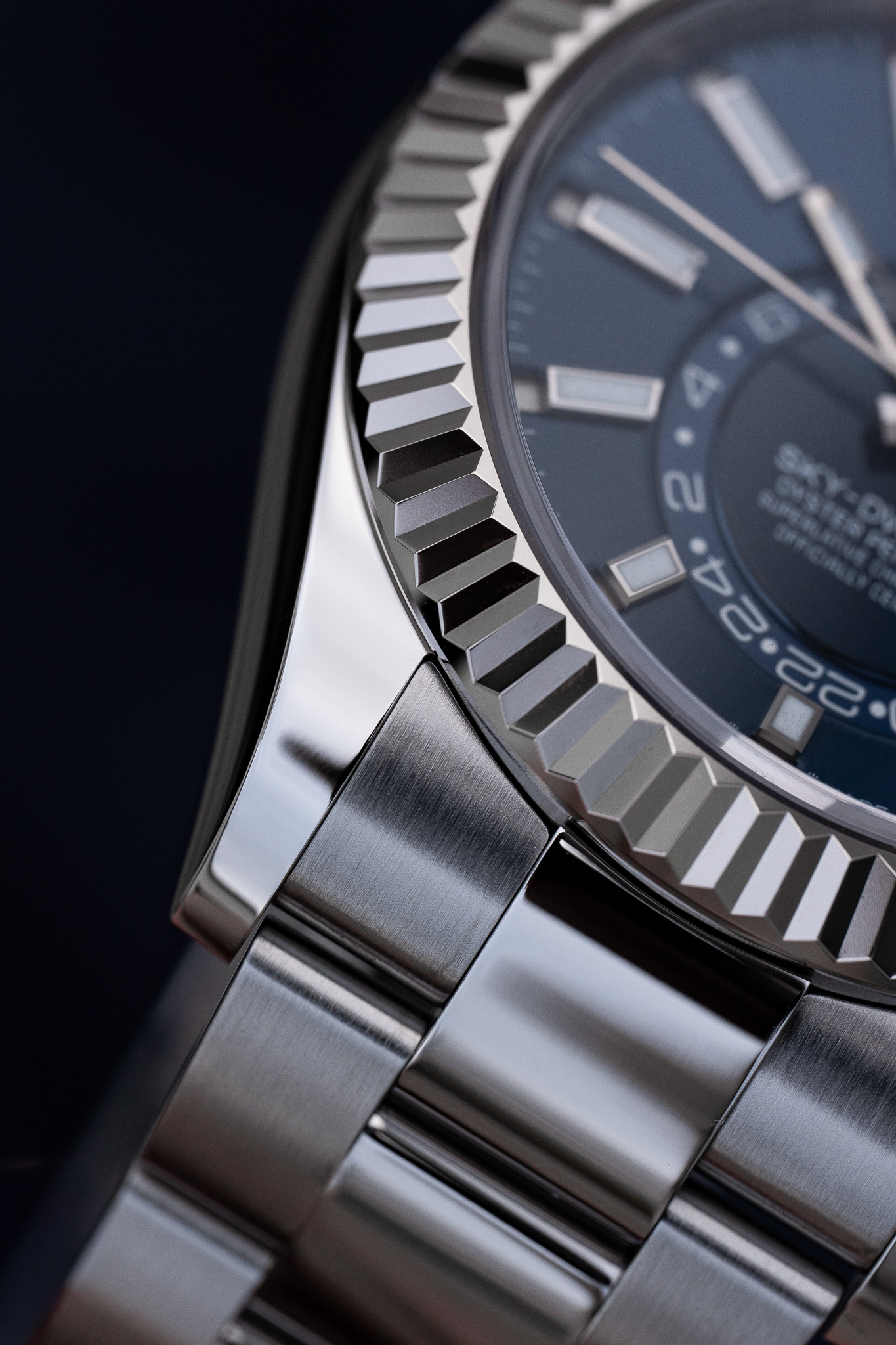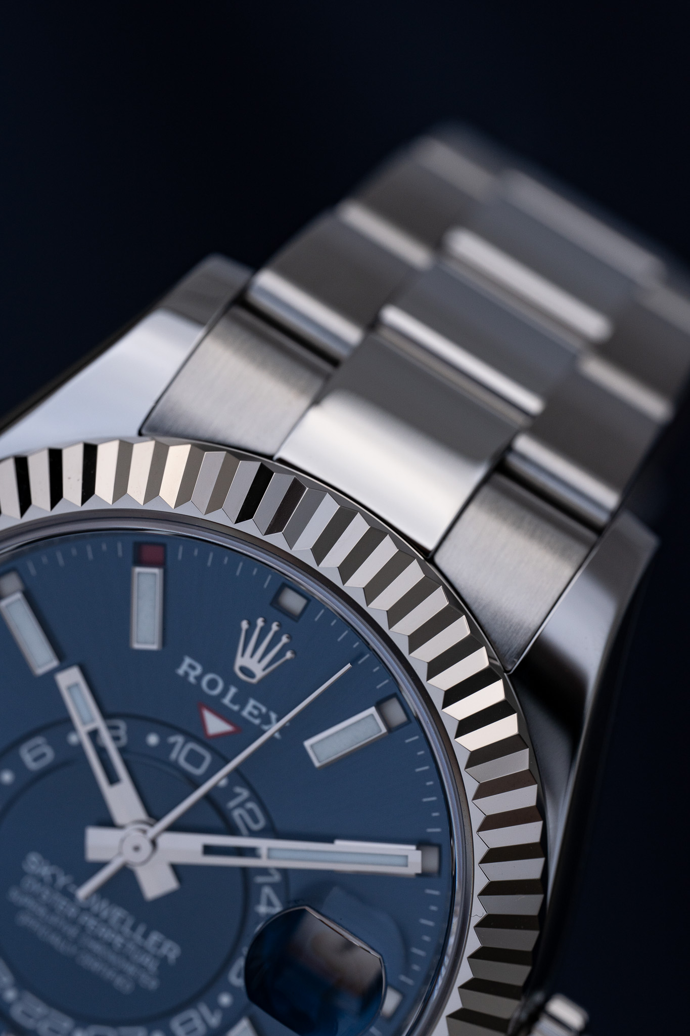 La complication GMT se lit grâce à un disque excentré qui affiche l’heure de référence en 24 heures, permettant au porteur de distinguer aisément le jour de la nuit dans un second fuseau horaire. L’ensemble se règle exclusivement via la lunette rotative Ring Command, sans aucun poussoir supplémentaire, preuve d’une intégration mécanique exceptionnelle. Montée sur un bracelet Oyster à trois mailles avec fermoir Oysterclasp et rallonge Easylink, cette Sky-Dweller conjugue sophistication technique, port quotidien confortable et raffinement cosmopolite.