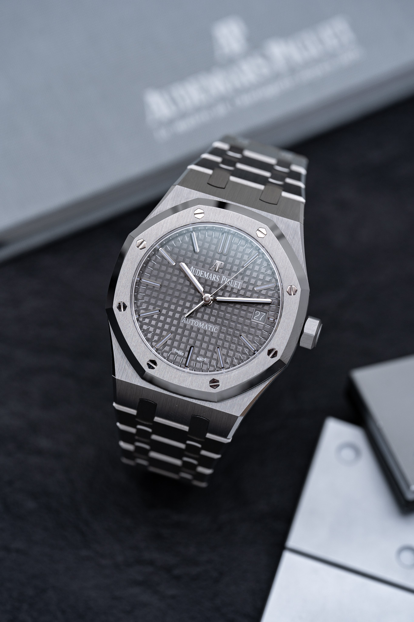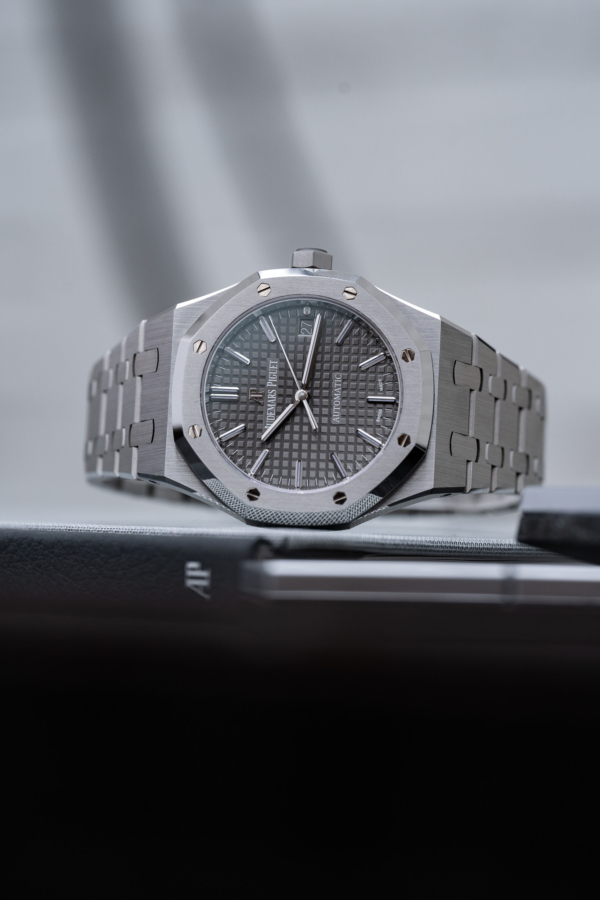Fabriqué en acier inoxydable, le boîtier arbore la silhouette emblématique octogonale de la Royal Oak. Les huit écrous hexagonaux en or apportent une touche de sophistication subtile, fixant en place le boîtier et la lunette avec une précision exceptionnelle. Avec un diamètre de 37 mm, le boîtier offre une présence élégante et équilibrée au poignet, soulignant son design soigné et intemporel. Cette dimension intermédiaire fait de la 15450ST une montre extrêmement agréable à porter pour une multitude de tailles de poignets.