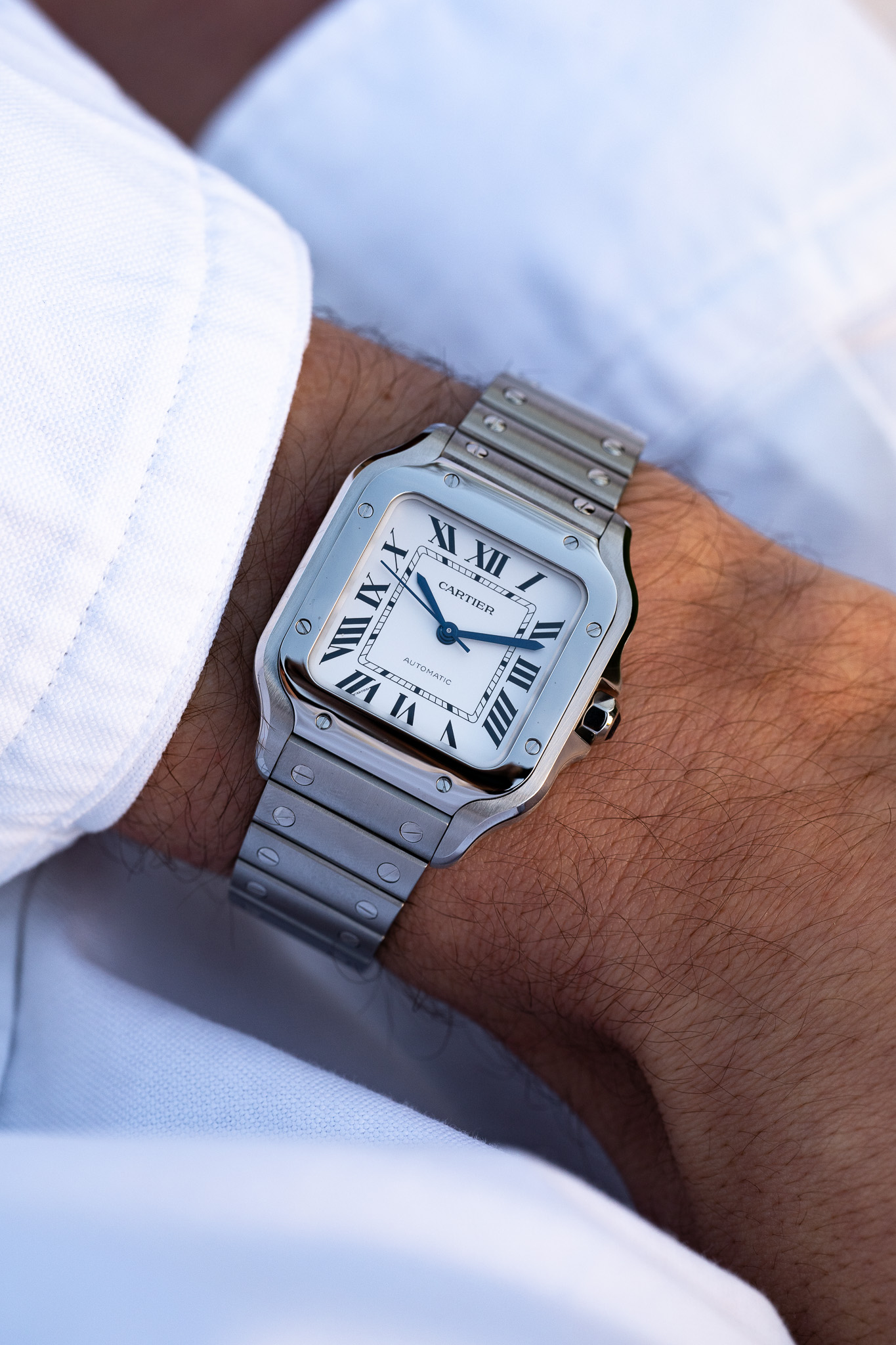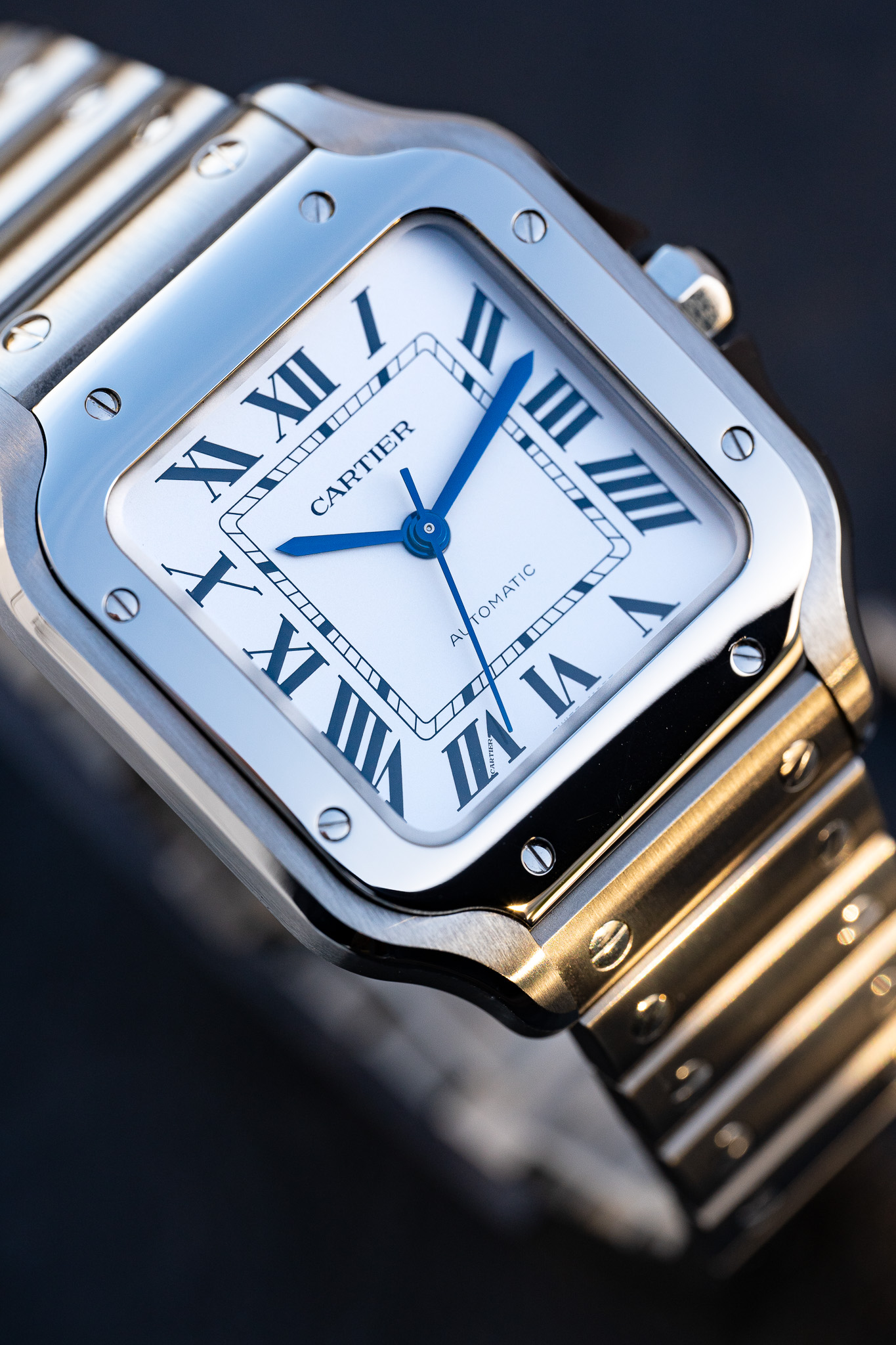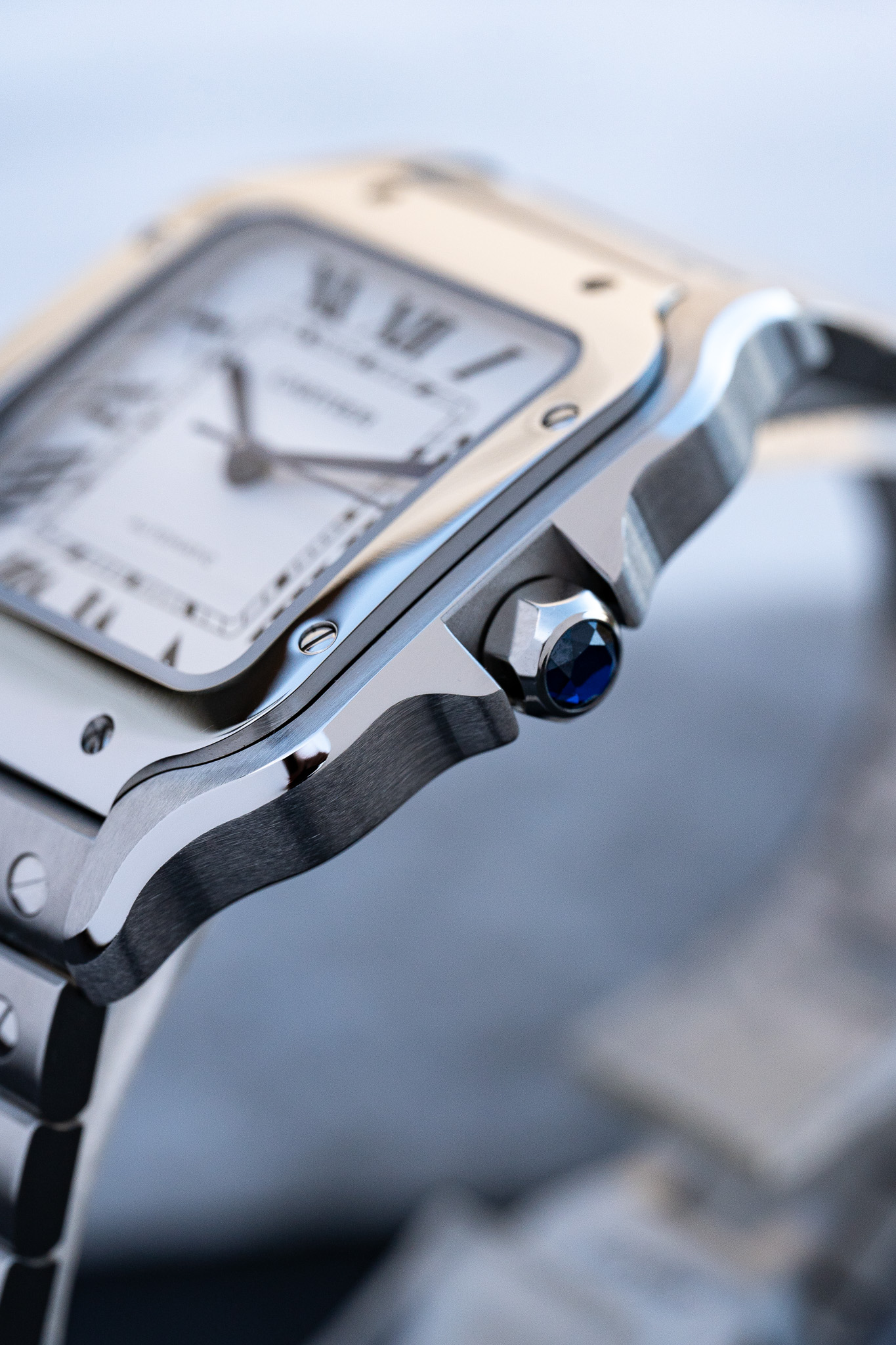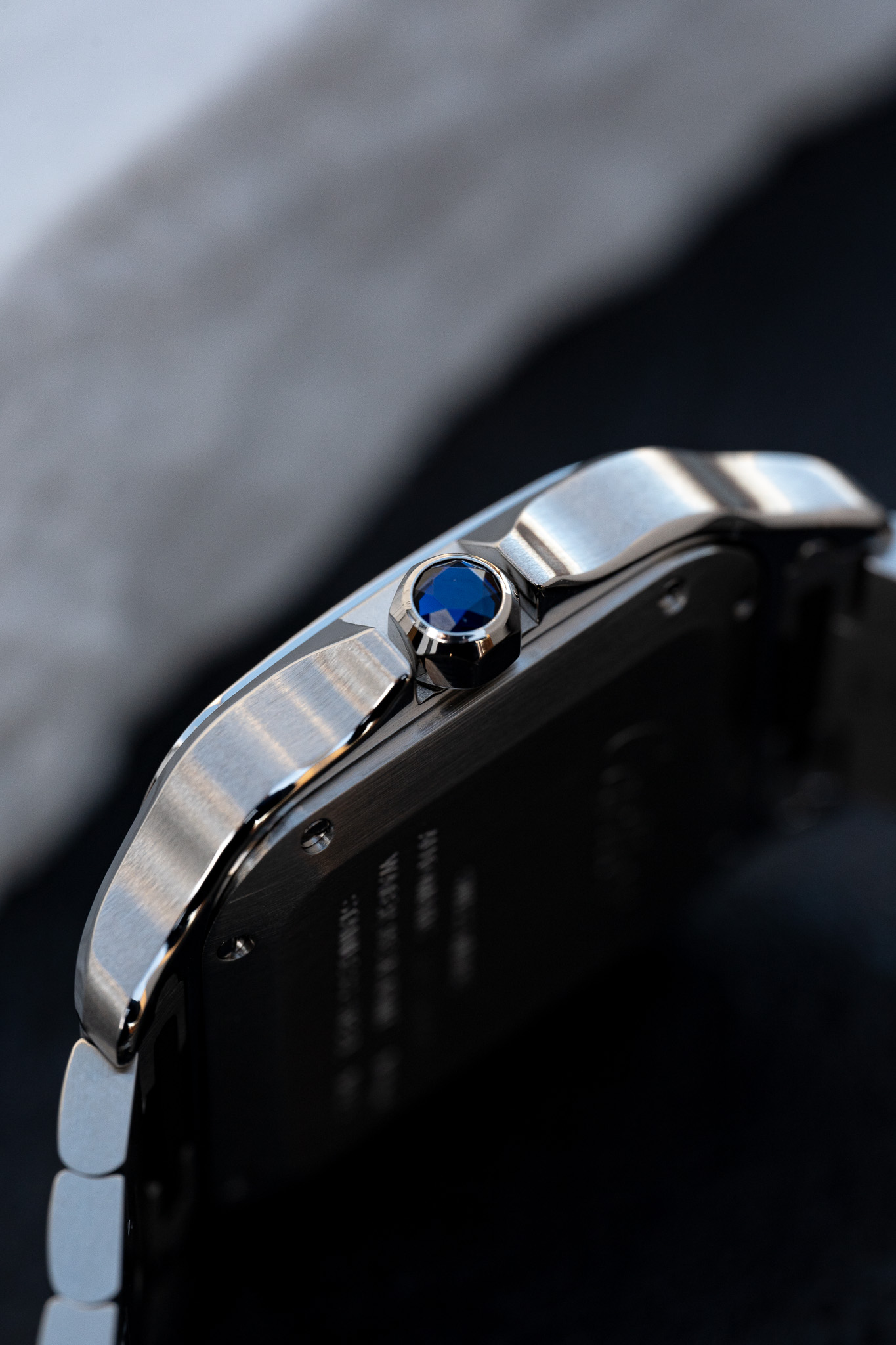 Montre Santos, moyen modèle, mouvement mécanique à remontage automatique 1847 MC. Boîte en acier, couronne à 7 pans ornée d’un spinelle de synthèse facetté, cadran opalin argenté, aiguilles en forme de glaive en acier bleui, glace saphir. Bracelet acier avec système de mise à taille SmartLink. Deuxième bracelet en veau, avec boucle déployante interchangeable en acier. Les deux bracelets sont équipés du système d’interchangeabilité QuickSwitch. Largeur de la boîte : 35,1 mm, épaisseur : 8,83 mm. Etanche jusqu’à 10 bars (~100 mètres).